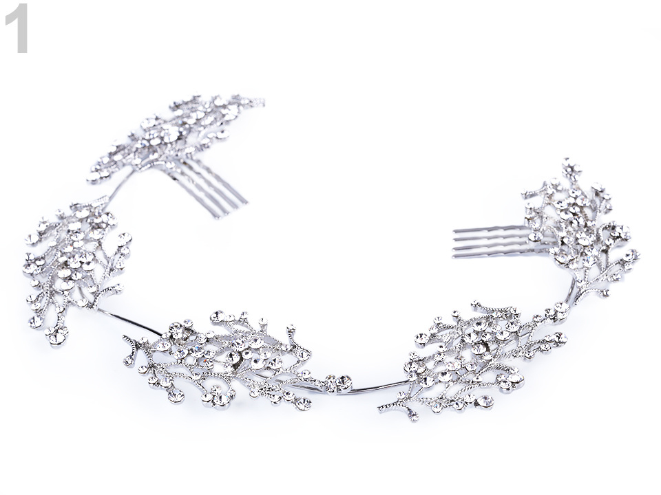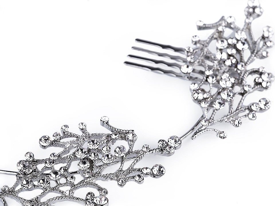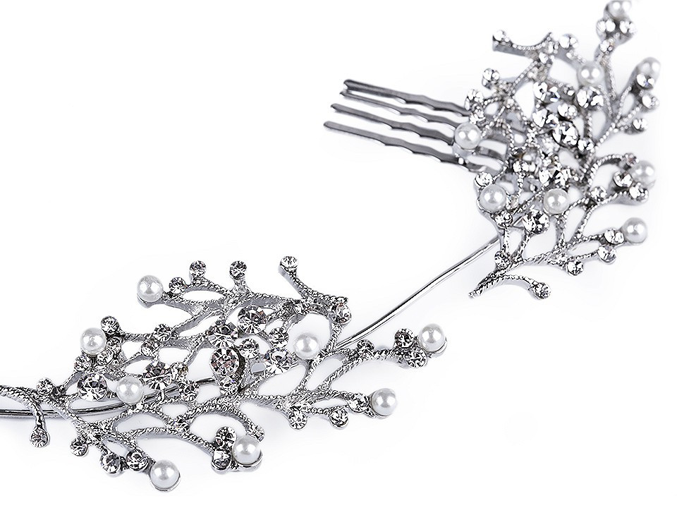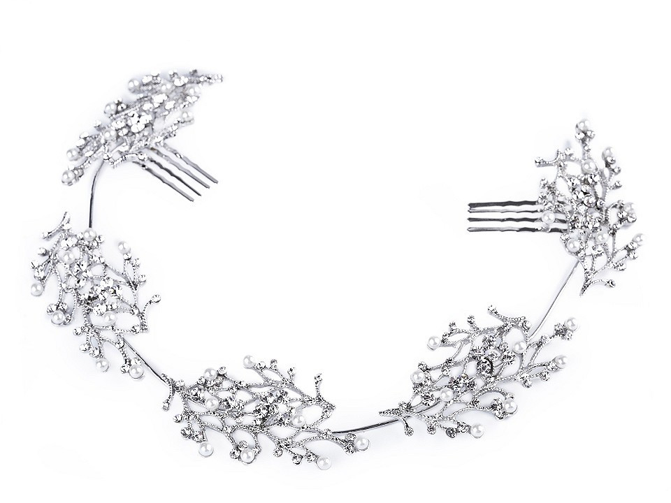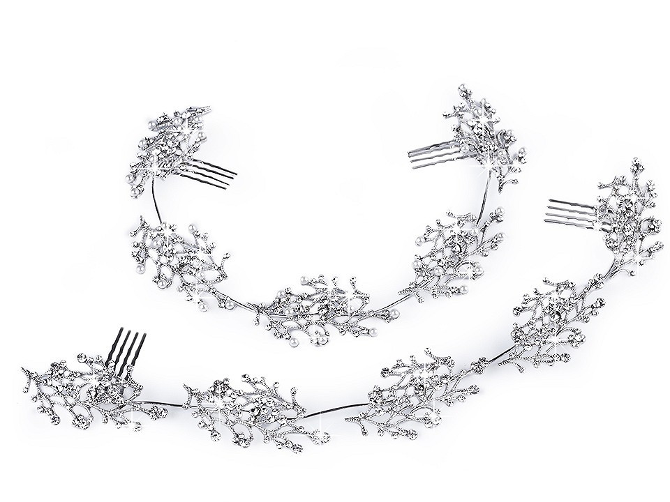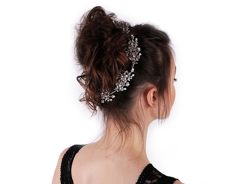 Elegantní ozdoba se štrasovými kamínky slavnostně dozdobí účes. Využijete ji na ozdobení drdolu nebo do složitých překládaných účesů, kde se její konce s hřebínky schovají pod vlasy. Je z ohebného drátu, na který jsou připevněné kovové ozdoby připomínající kvetoucí větvičky. Jsou ozdobené broušenými kamínky a perlovými korálky. Díky drátů se ozdoba lehce ohýbá a tvaruje. Využijete ji jako nevšední doplněk na svatby, svaté přijímání či na plesy. Na koncích má hřebínky, za které ji lehce upevníte do účesu.