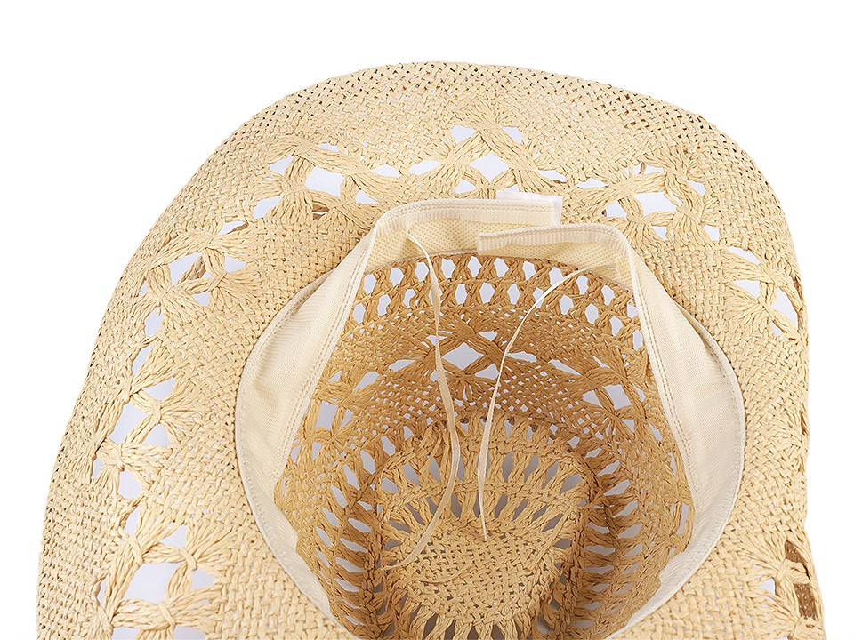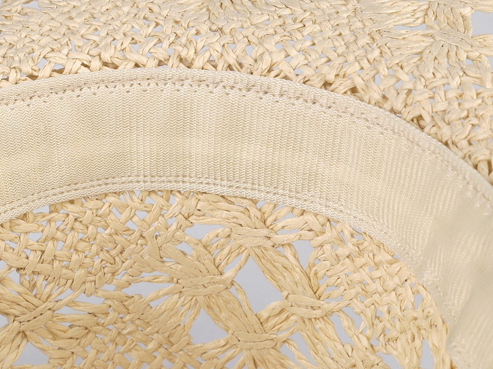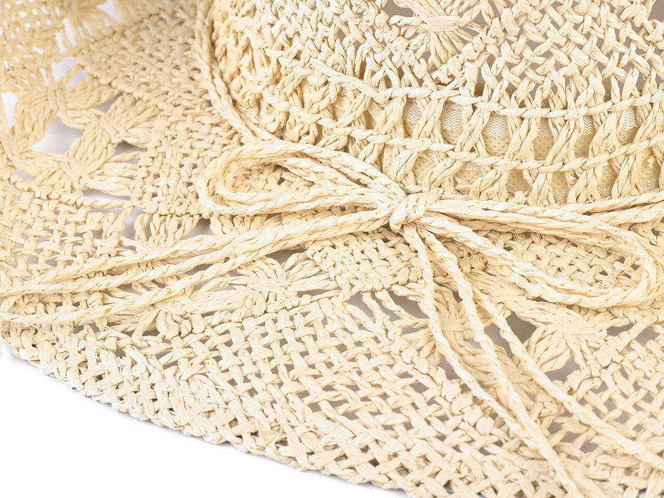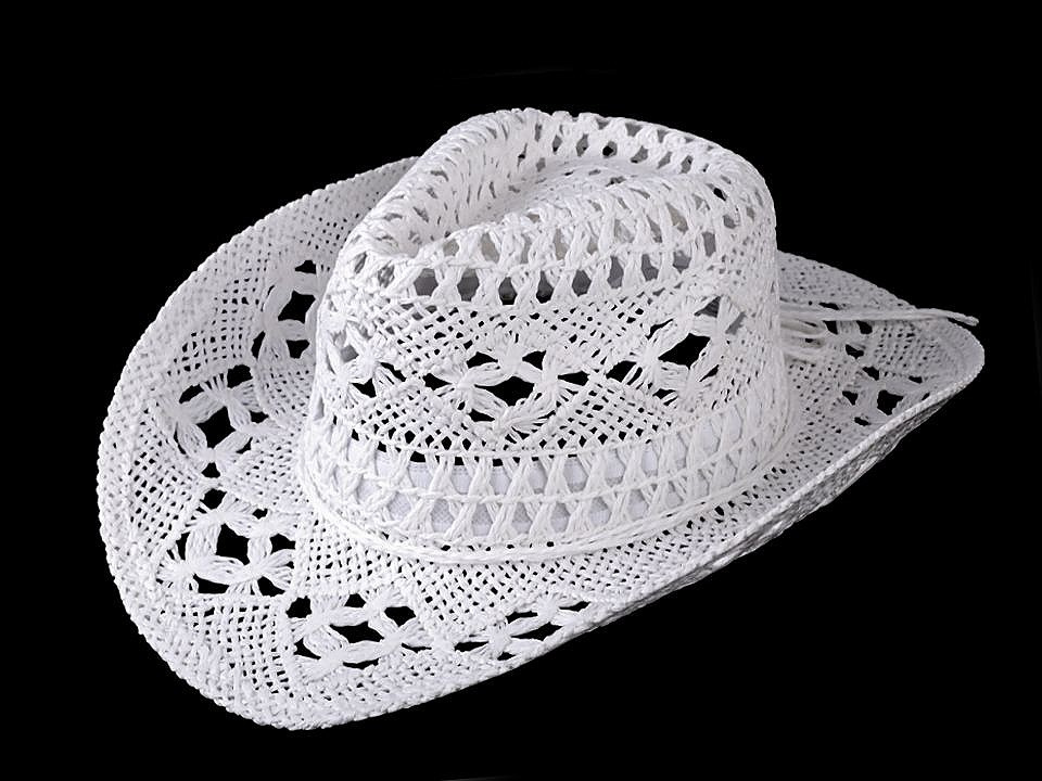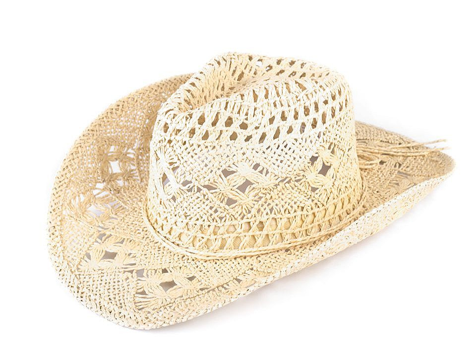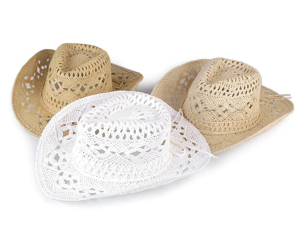 Letní ažurový klobouk v kovbojském stylu zdobí jednoduchá papírová mašle z kroucených provázků.