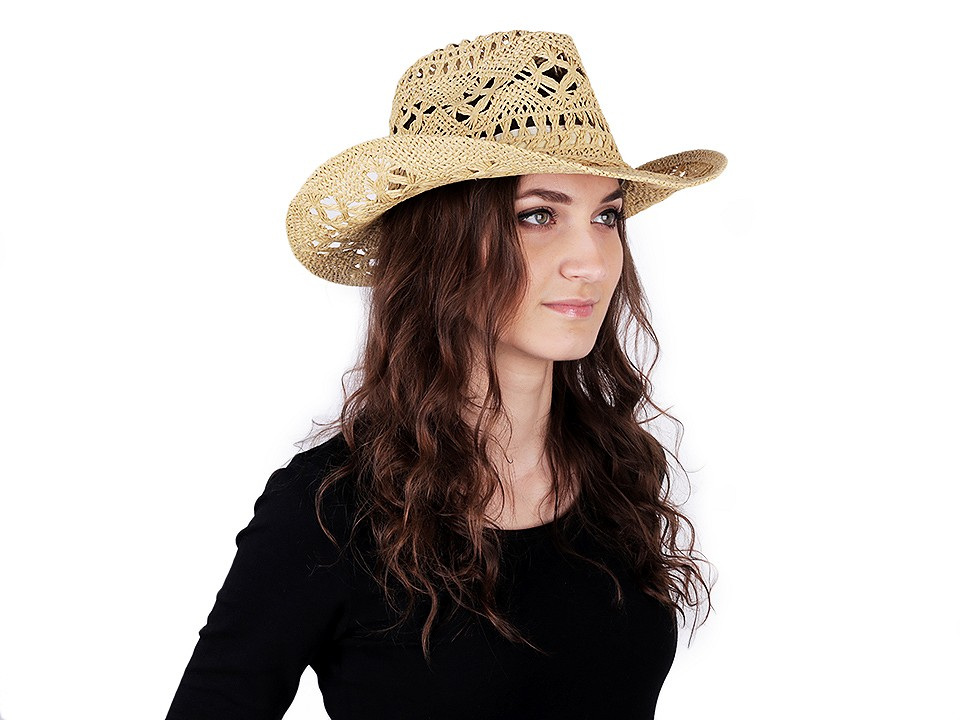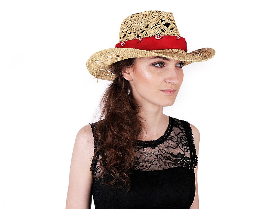 Okraj krempy je vyztužený, můžete si ho libovolně upravovat, dobře drží tvar. Obvod klobouku si můžete stáhnout pomocí rypsové stuhy. Klobouk můžete dozdobit šátkem, různými odznaky, rypsovou stuhou, řemínky apod.