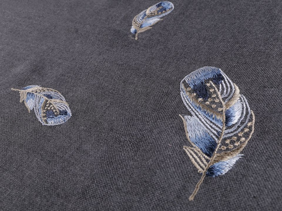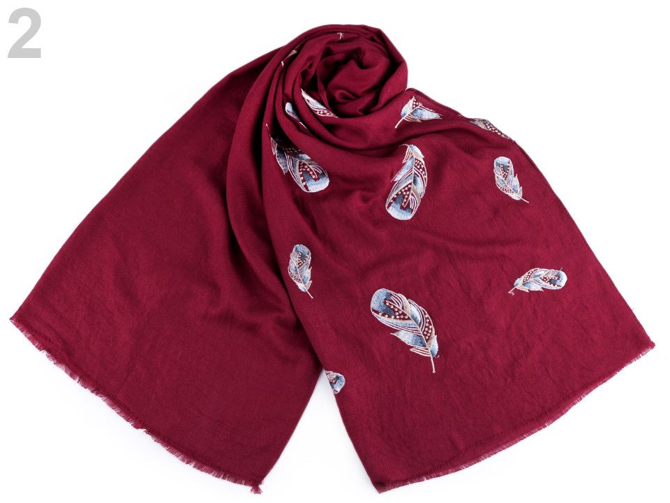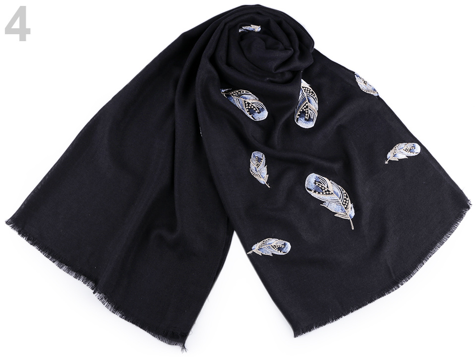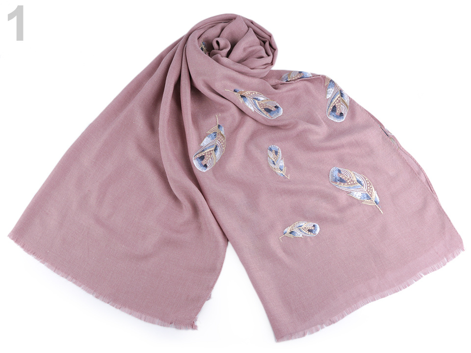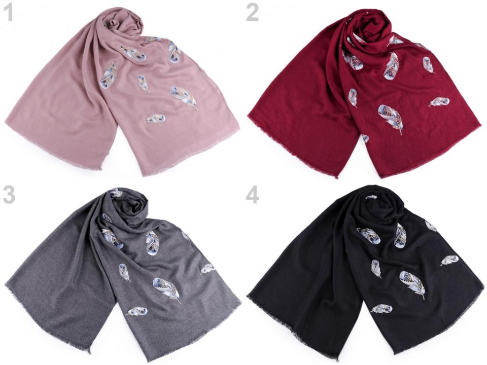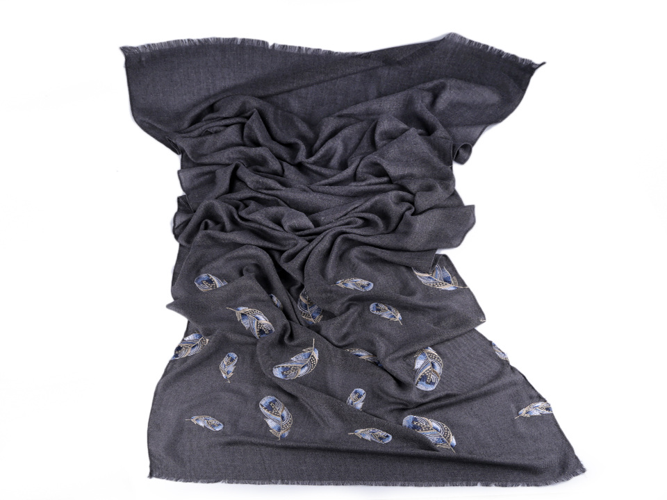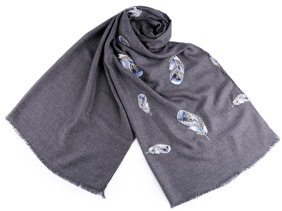 Jednobarevnou dámskou šálu zdobí výrazná strojová výšivka s motivem pírek. Materiál šály je příjemný na dotek. Motiv pírek je jen na jedné polovině šály. V létě vám šála poslouží jako pléd kolem ramen, v zimě si ji můžete pohodlně omotat kolem krku.