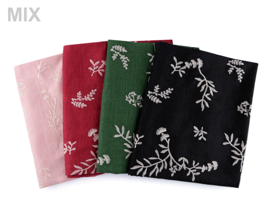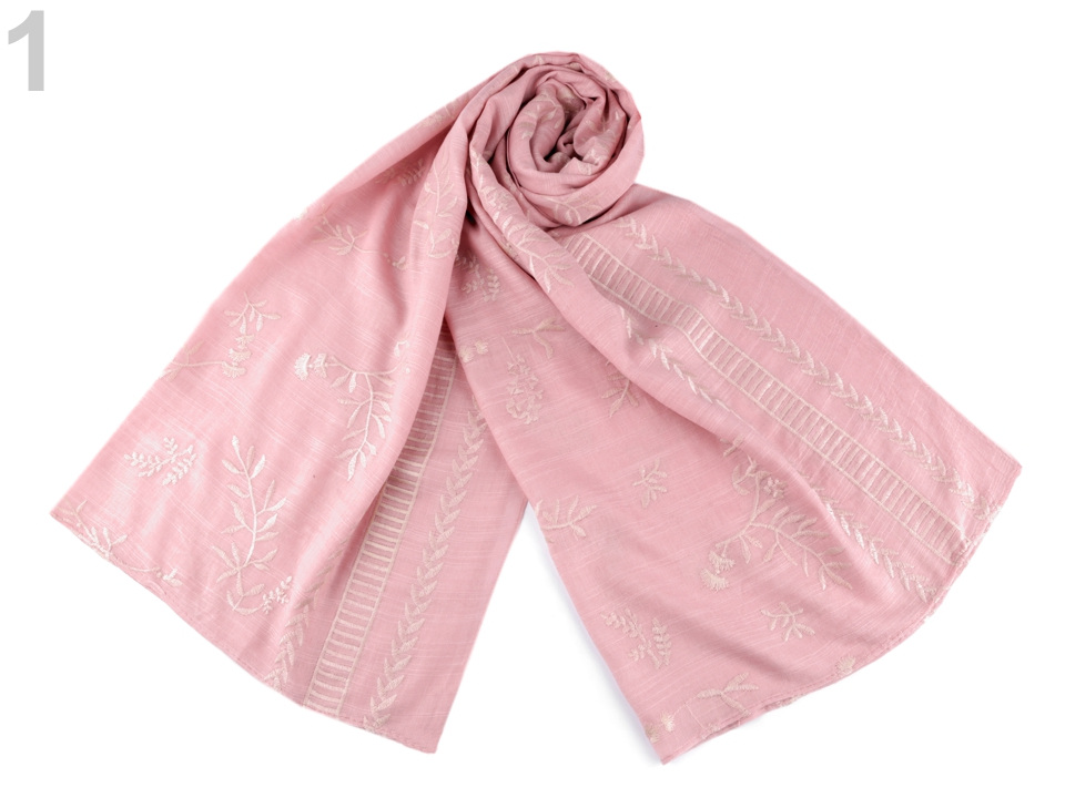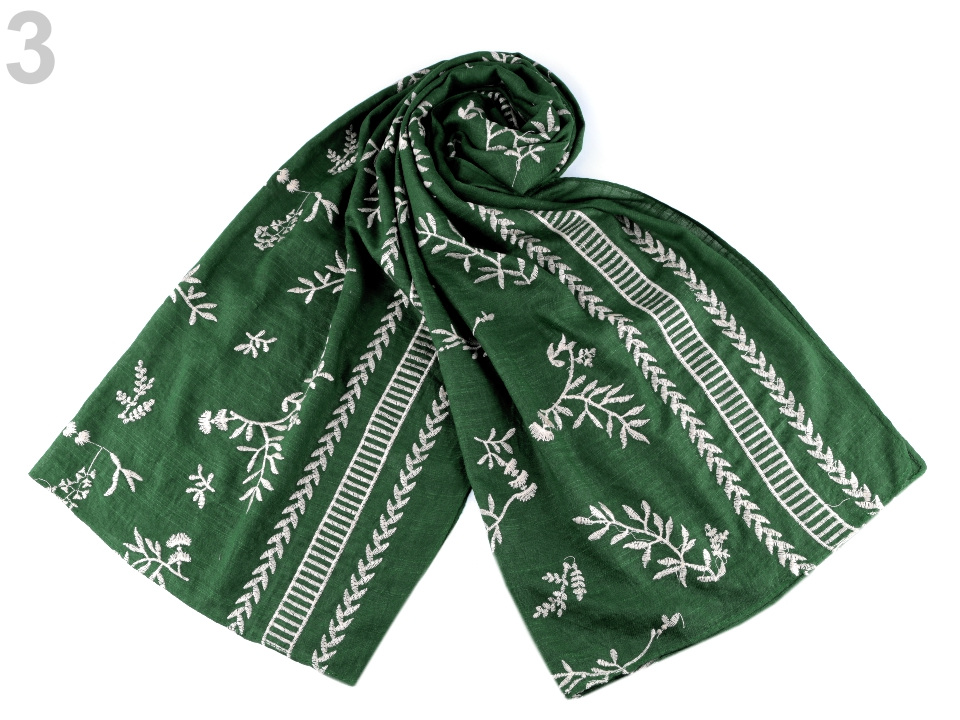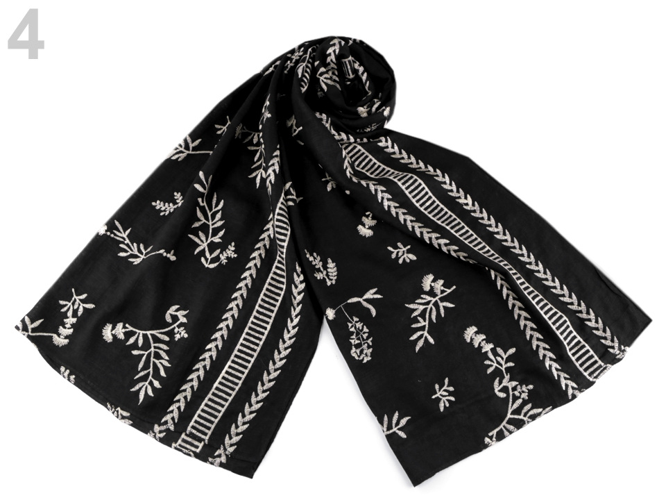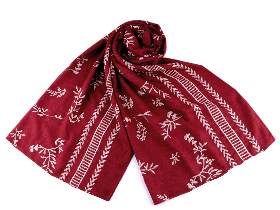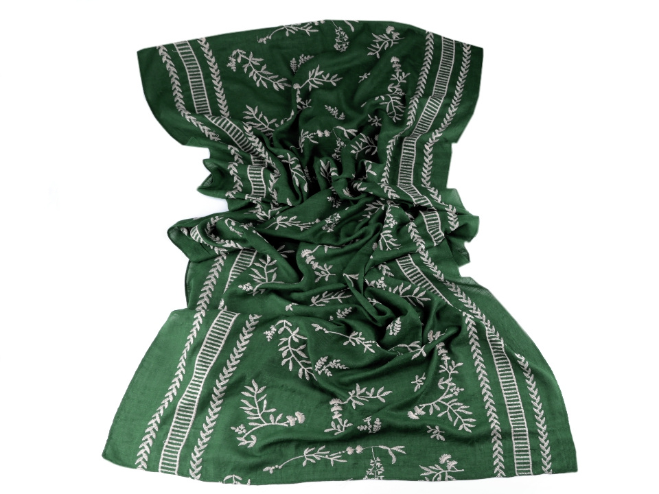 Jednobarevnou dámskou šálu zdobí strojová výšivka s přírodními motivy listů a větviček. Materiál šály je jemný, příjemný na dotek. V létě vám šála poslouží jako pléd kolem ramen, v zimě si ji můžete pohodlně omotat kolem krku.