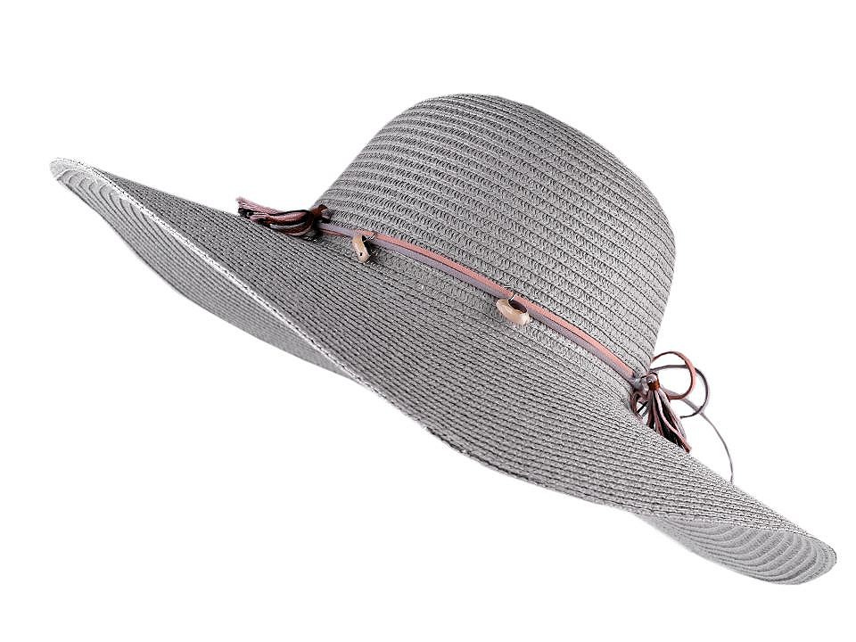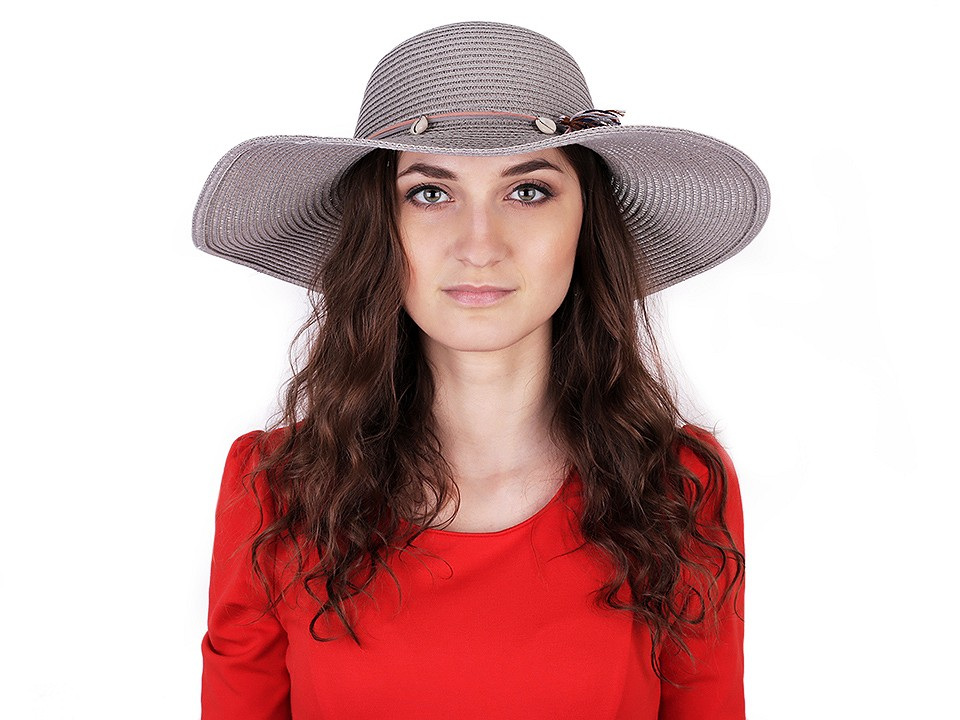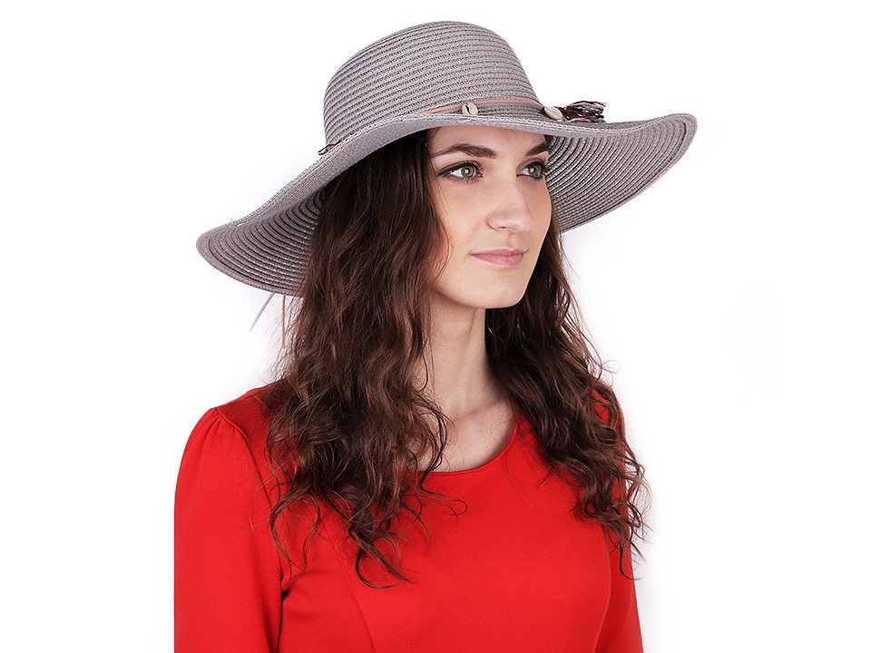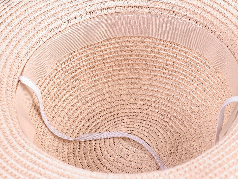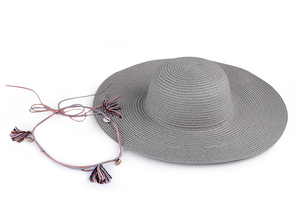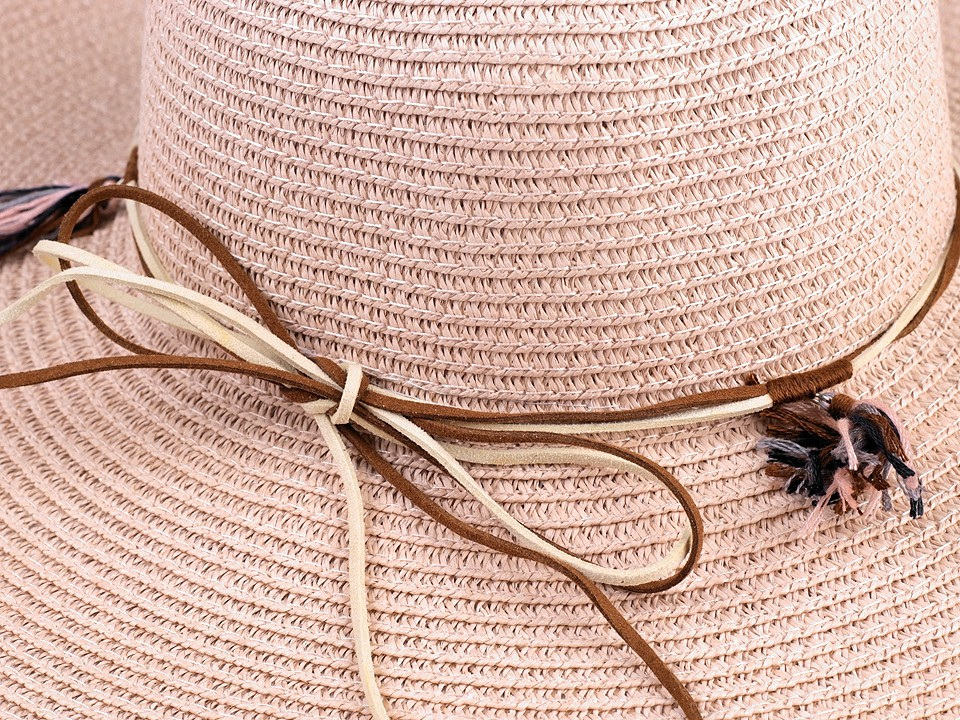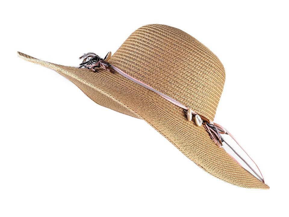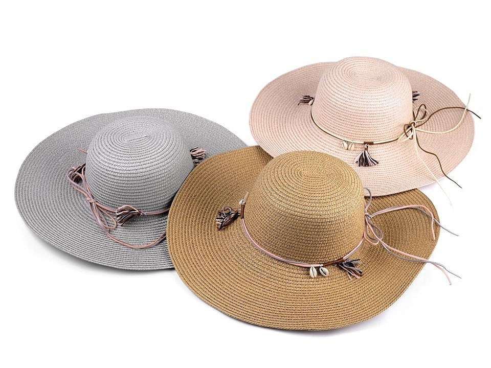 Letní klobouk zdobí řemínky z eko kůže, které jsou doplněny mušlemi a střapečky. V případě potřeby je můžete sundat a dozdobit si ho podle vlastního vkusu. Klobouk má pruženku, kterou ale můžete jednoduše odstřihnout.