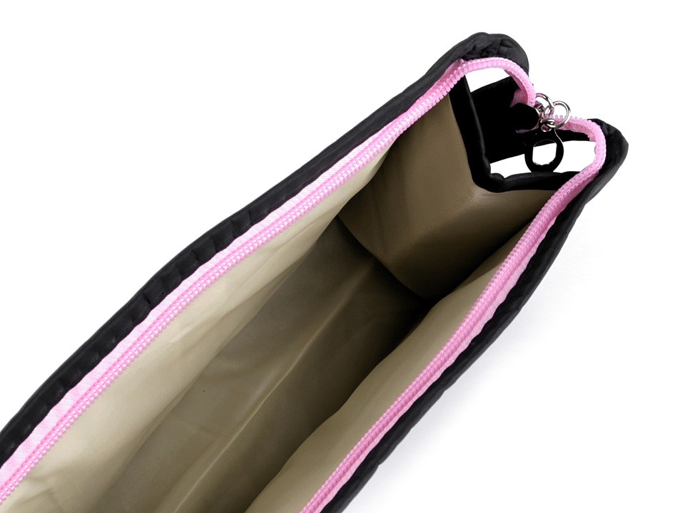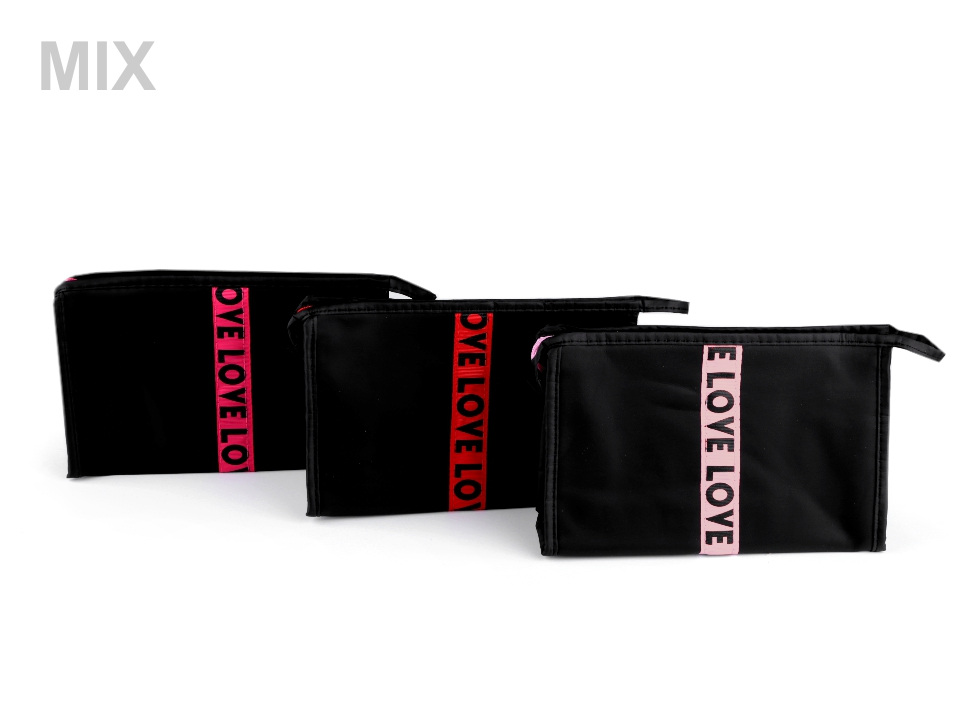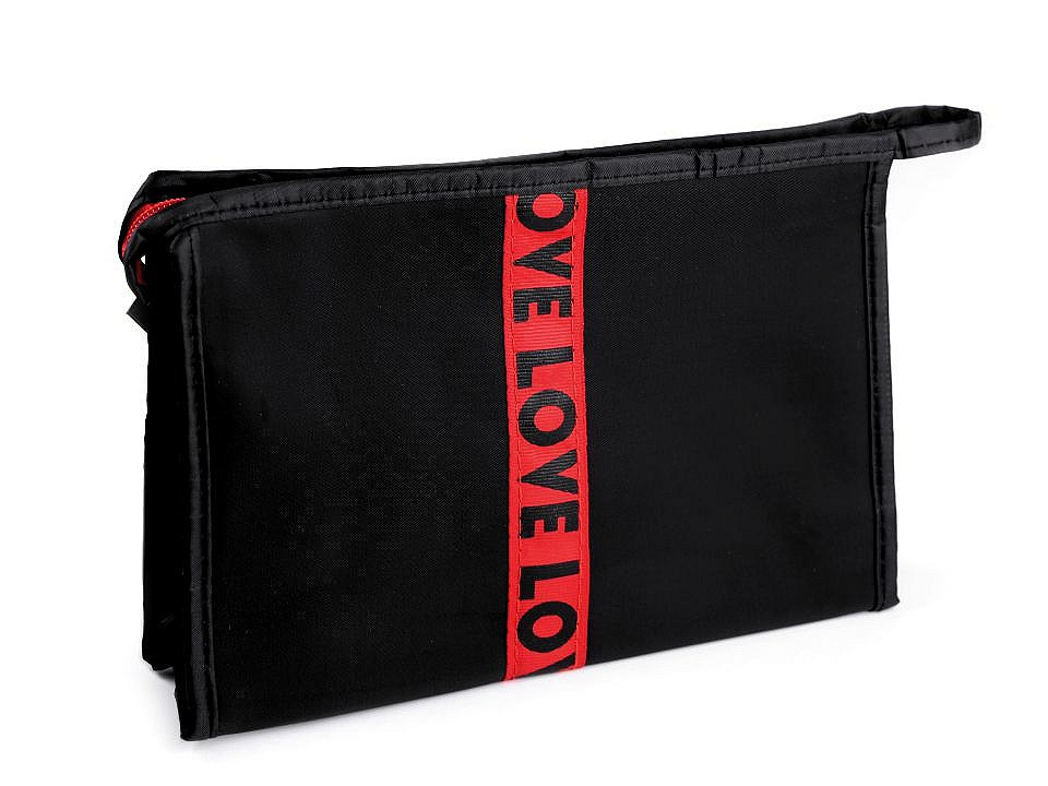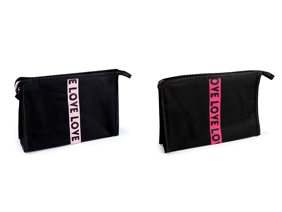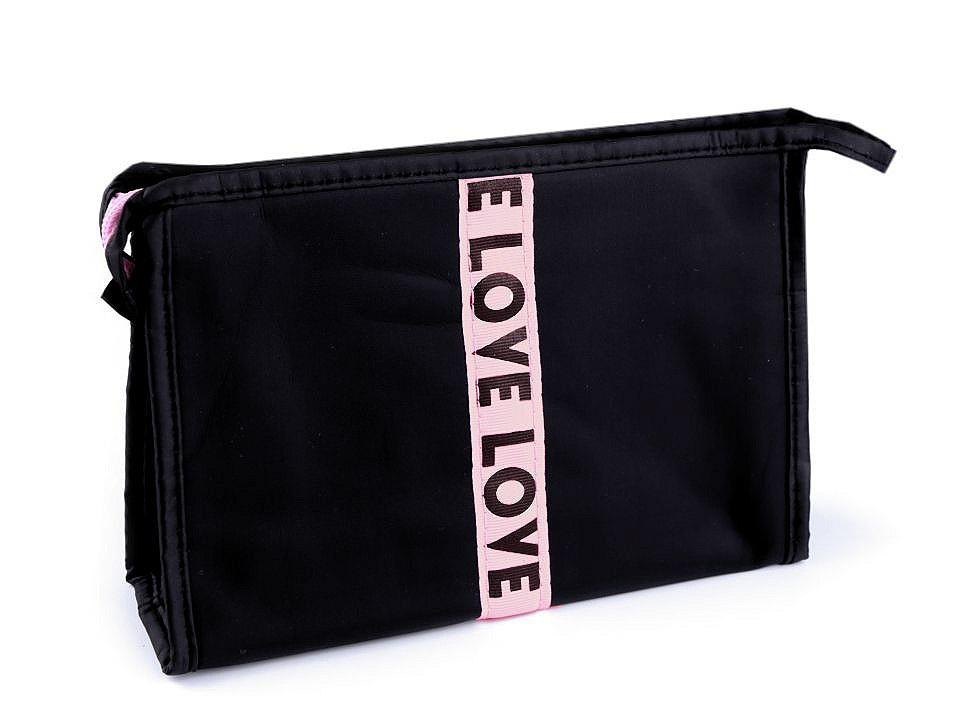 Prostornou kosmetickou tašku zdobí stuha s nápisem Love. Vejde se vám do ní vše potřebné, ať už se jedná o kosmetiku či hřebeny. Je praktická i na cestování, např. děti si do ní mohou uložit baterku, nabíječku mobilu, malé společenské hry, psací potřeby apod. Taška je tvarovatelná, dá se lehce složit a je nenáročná na údržbu. Uvnitř má podšívku. Zapíná se na zip. Z jedné strany u zipu je praktické poutko na pověšení, na druhé straně můžete konec zipu připnout na cvoček. Tašku si tak můžete připnout k poutku uvnitř zavazadla, což může zabránit její ztrátě.