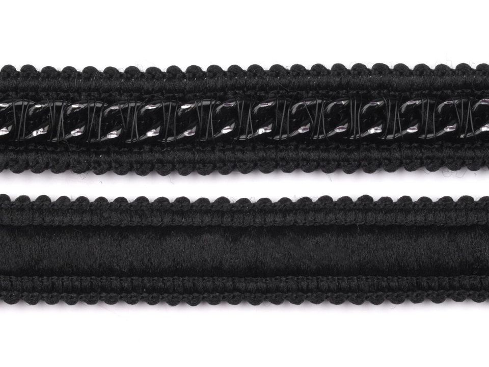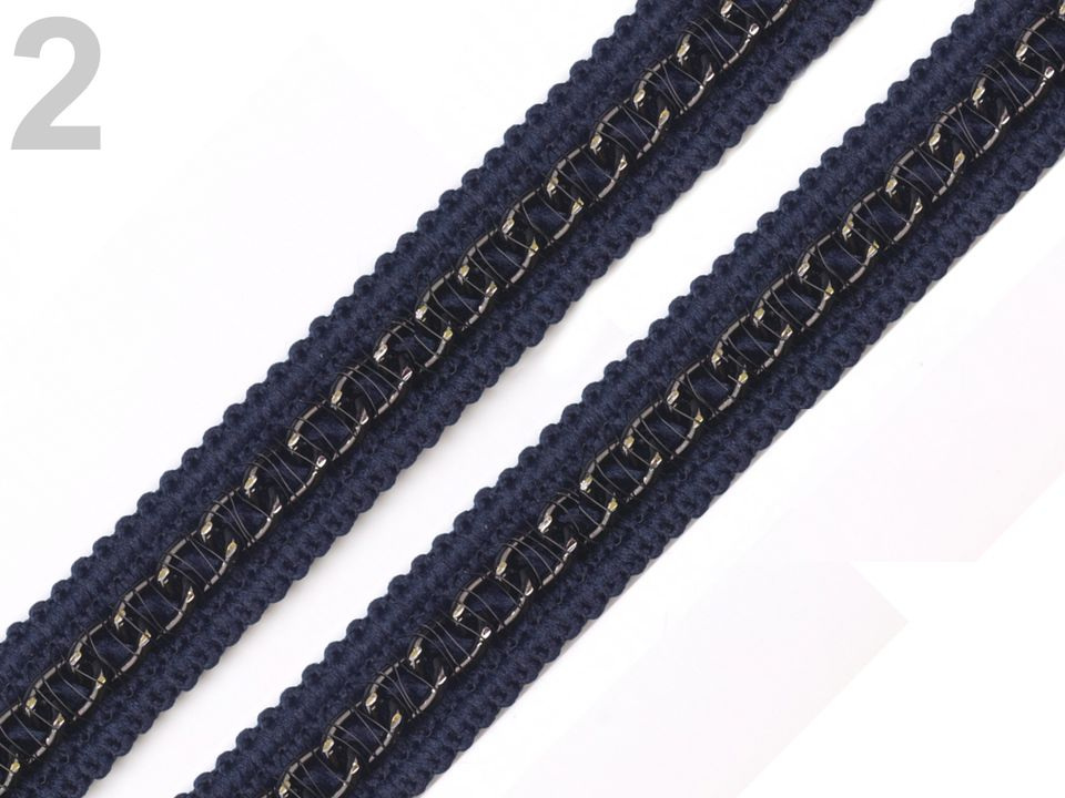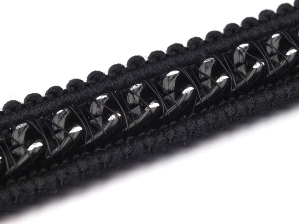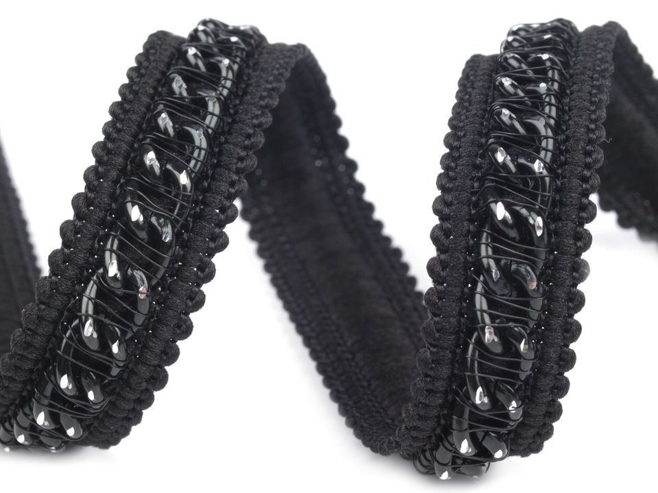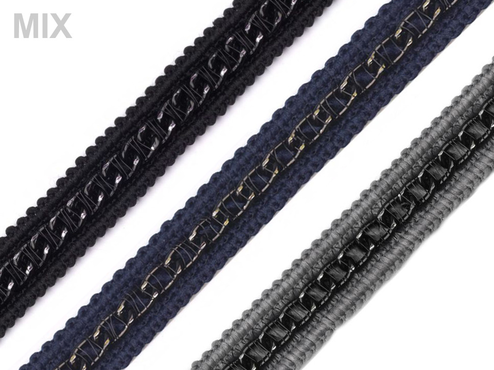 Pletený prýmek o šíři 13 mm je ozdoben kovovým řetízkem, který je široký 5 mm a k prýmku připevněný vlascem. Barvený řetízek má na povrchu výseky, díky kterým se třpytí. Má široké využití, zejména se používá v oděvním odvětví. Můžete jej našít na pevnější materiál a vytvořit tak ozdobu dekoltu či pasu halenek, šatů a svetrů. Setkat se s nimi můžete i u bytových doplňků.