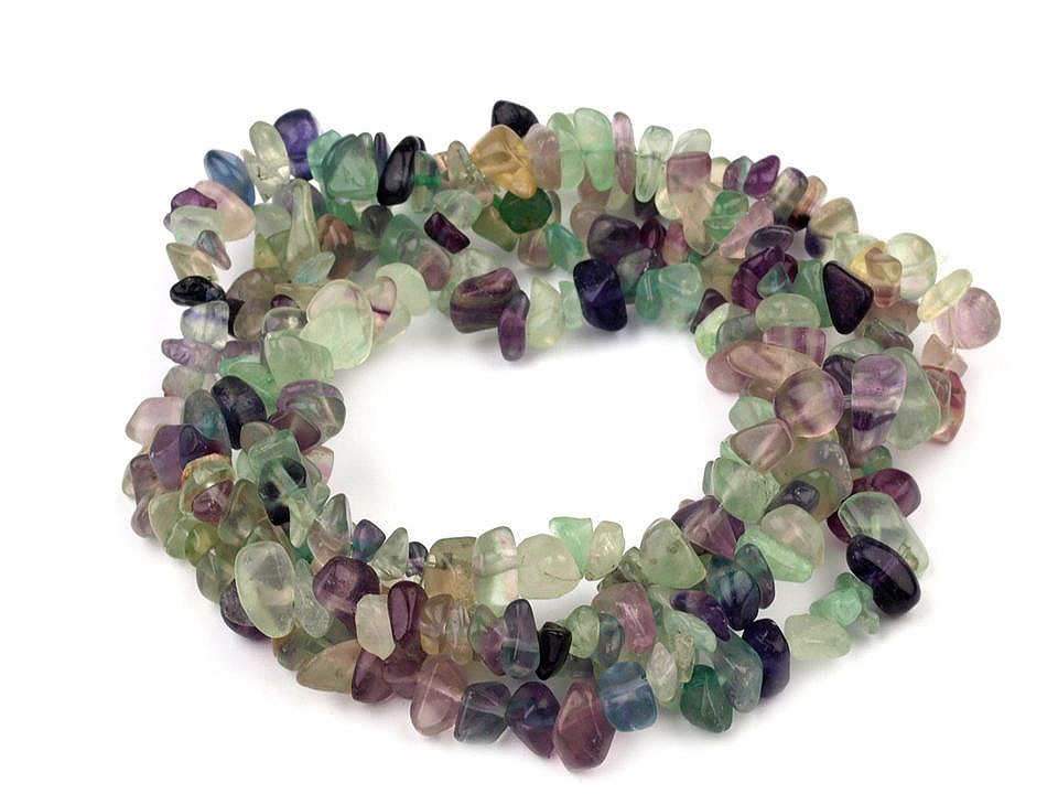 Minerálové zlomky fluoritu jsou jedny z nejvariabilnějších bižuterních prvků. Jsou půvabné svým průsvitem a jemnými přechody barev. Tyto korálky jsou jedním z našich hitů, což je dáno jejich kvalitou a velmi příznivou cenou. Na jedné šňůře je cca 217 zlomků.