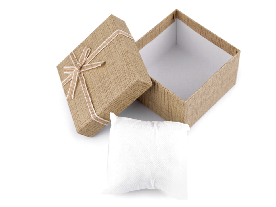 Papírová krabička je vhodná na hodinky nebo náramky. Díky polštářku z netkané textilie, který je uvnitř, je uložíte tak, aby v ní vynikly. Krabička je pevná a víčko je ozdobené jutovou mašlí.