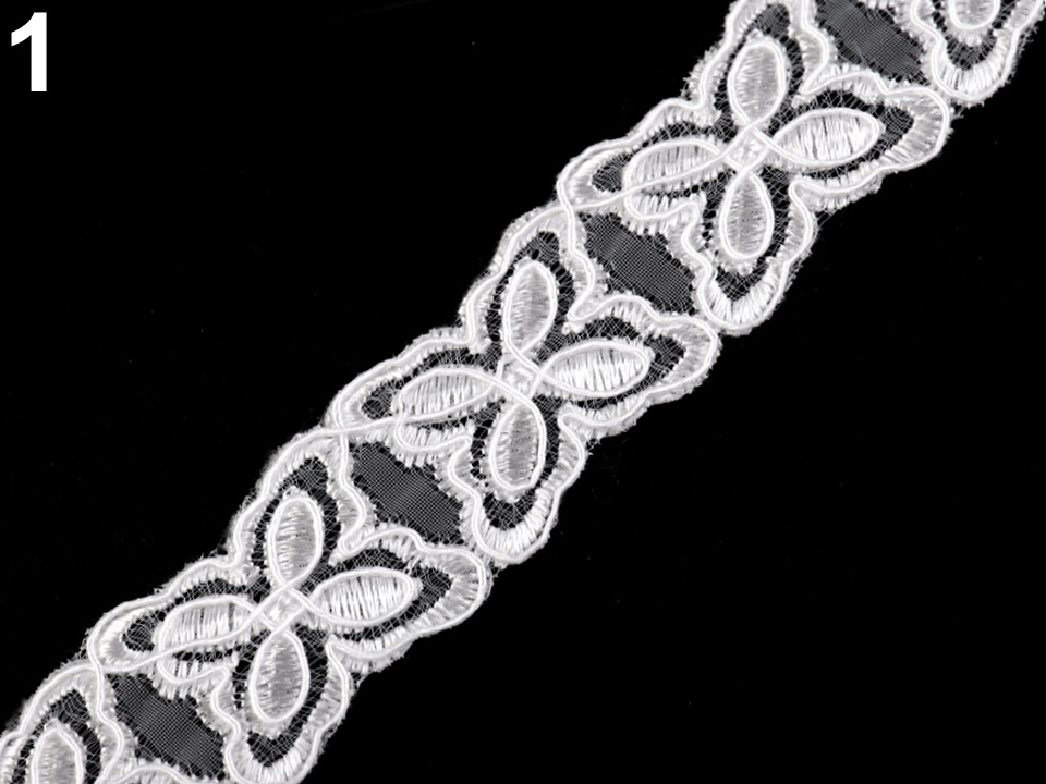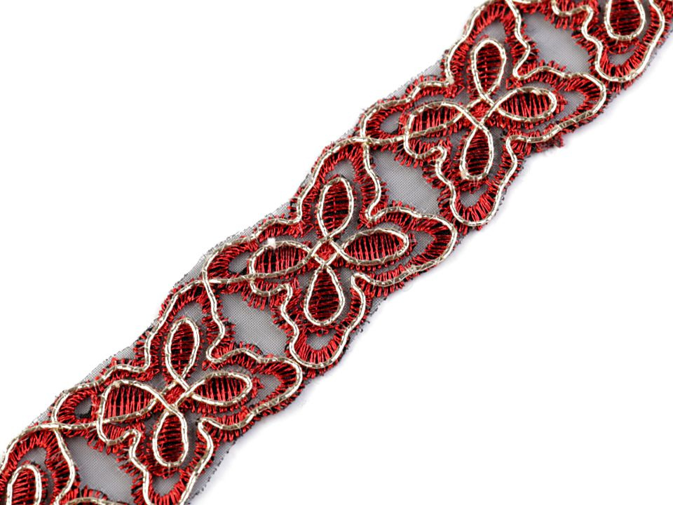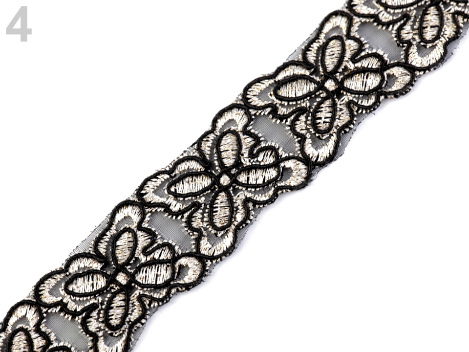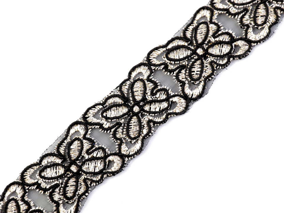 Elegantní prýmek na monofilu zdobí květinová výšivka. Lurex mu dodává efektní třpyt. Celý prýmek připomíná přepychovou sutaškovou výšivku. Prýmek v bílé barvě není zdobený lurexem.
