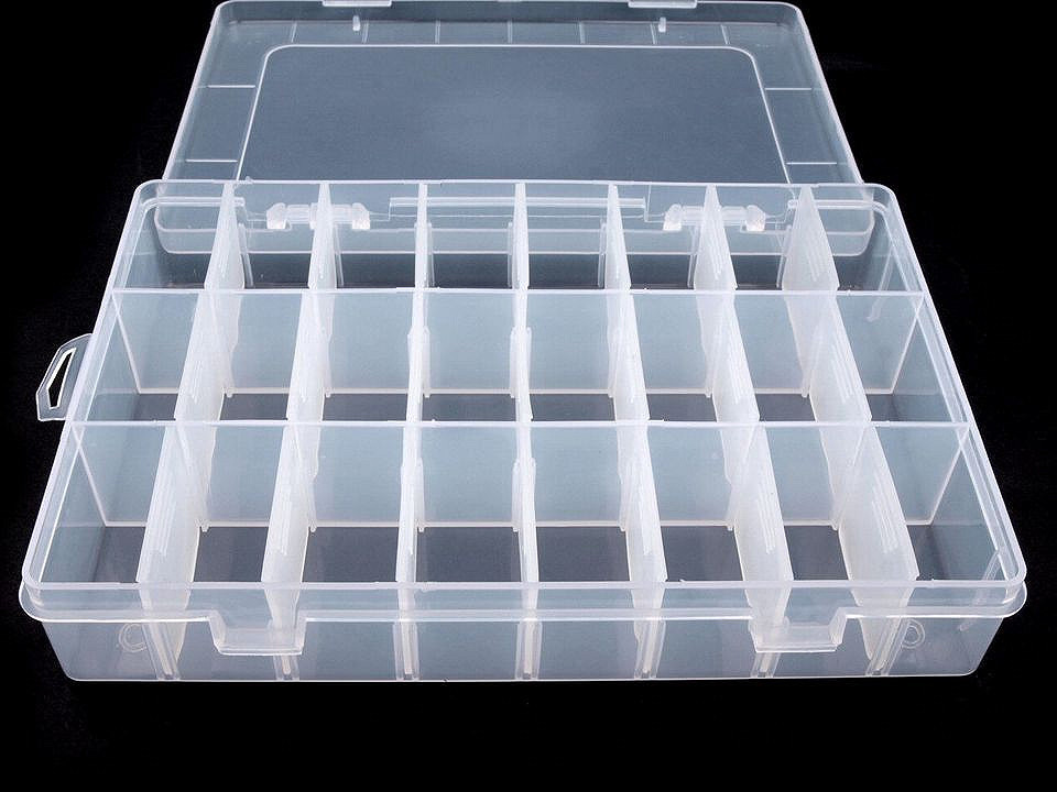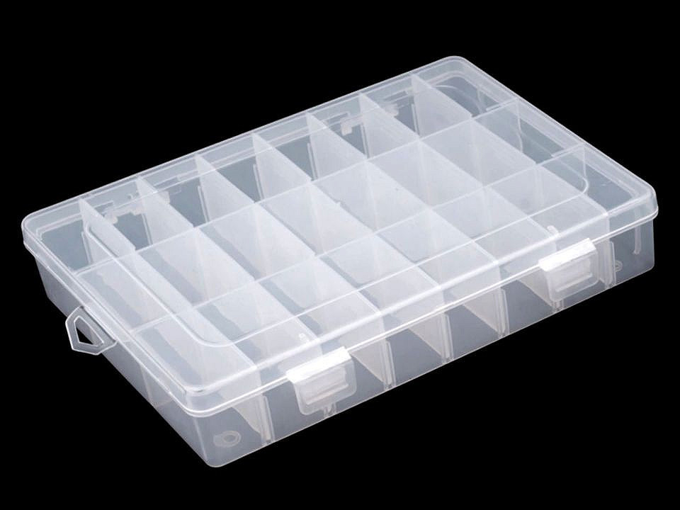 Plastová krabička je vhodná pro korálkářky. Obsahuje max. 24 přihrádek o velikosti 2 x 4 cm. Můžete je však regulovat, protože jednotlivé přepážky (21 ks) se dají odstranit. Pokud odstraníte všechny, budete mít 3 přihrádky o velikosti 4 x 19 cm. Krabička je uzavíratelná. Celkové rozměry zásobníku jsou 14 x 20 cm, výška 4 cm.Složení: 100% plast