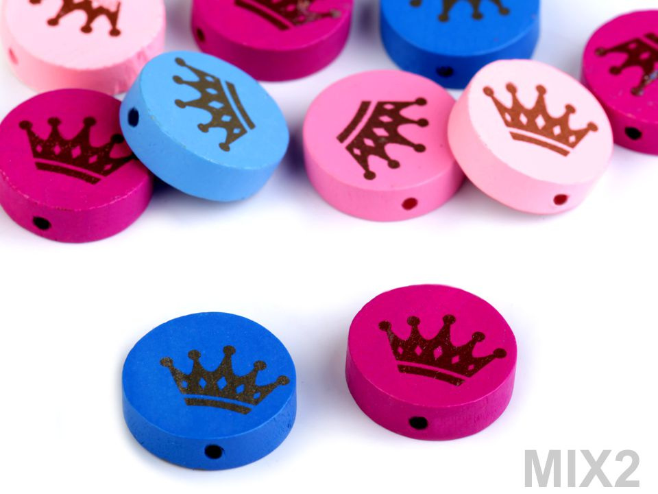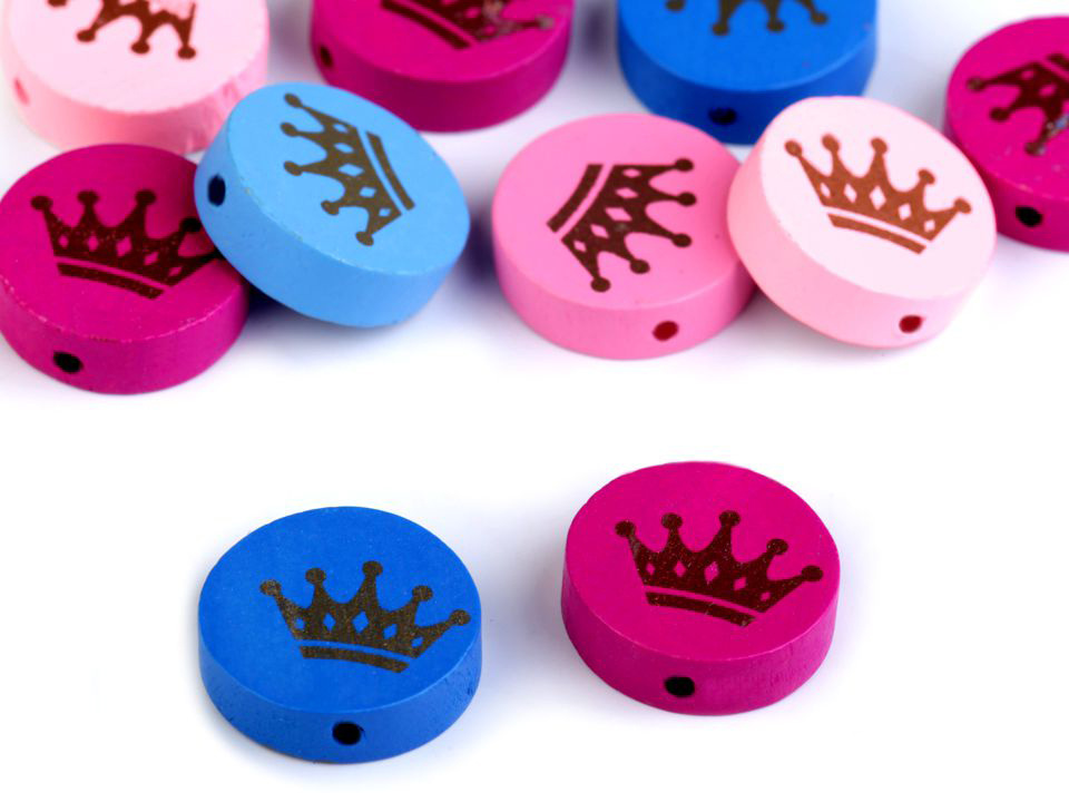 Barevný mix dřevěných korálků s potiskem korunky potěší nejen korálkářky, ale i děti. Jejich velikou výhodou je lehký materiál. Dají se skvěle kombinovat s dalšími dřevěnými korálky, s kulatými, s disky apod. Můžete je navlékat na lanko nebo pruženku či silon. Děti si mohou sami navléci jednoduchý náramek z pruženky.