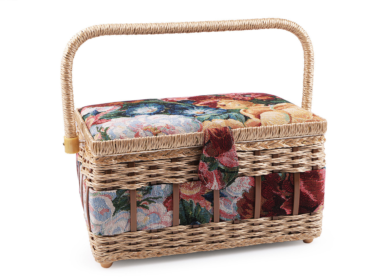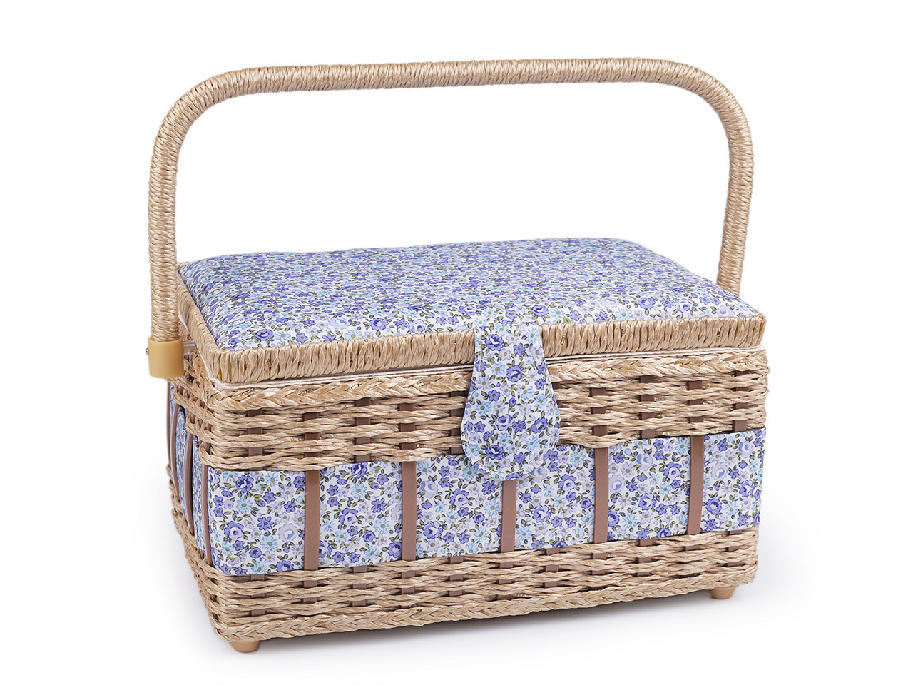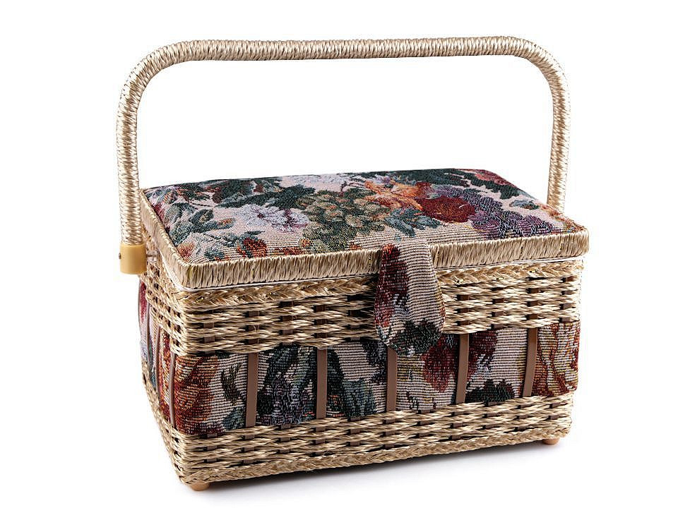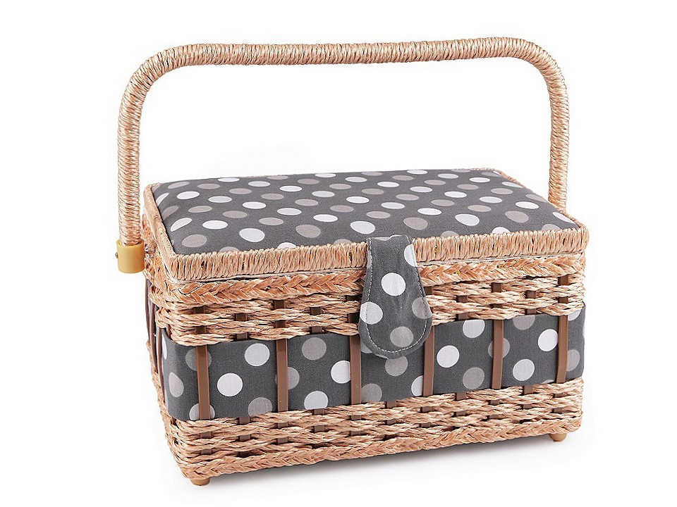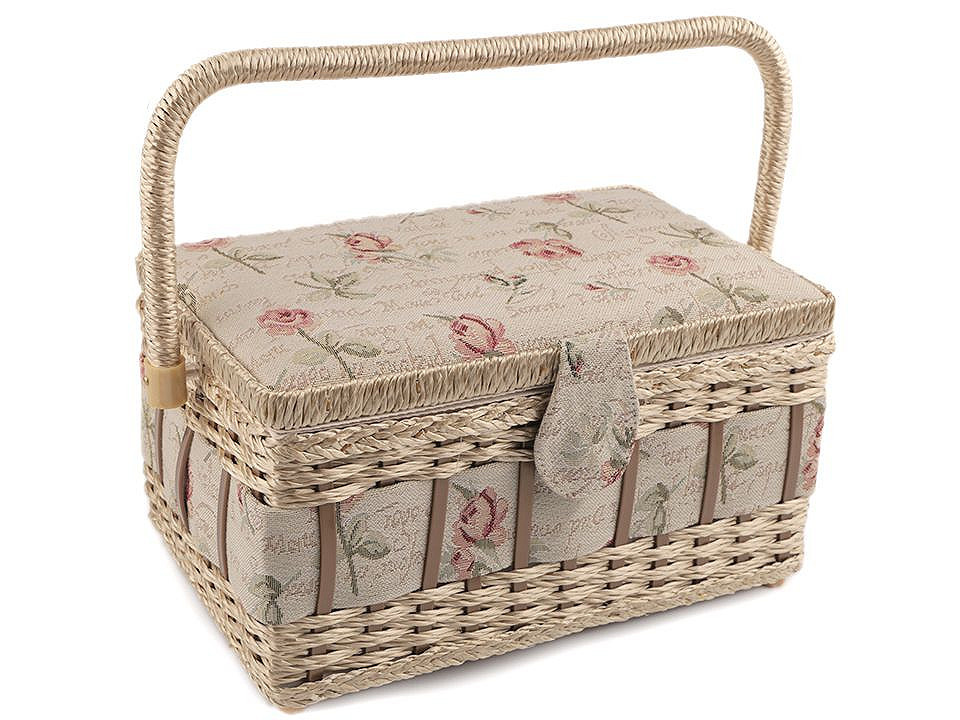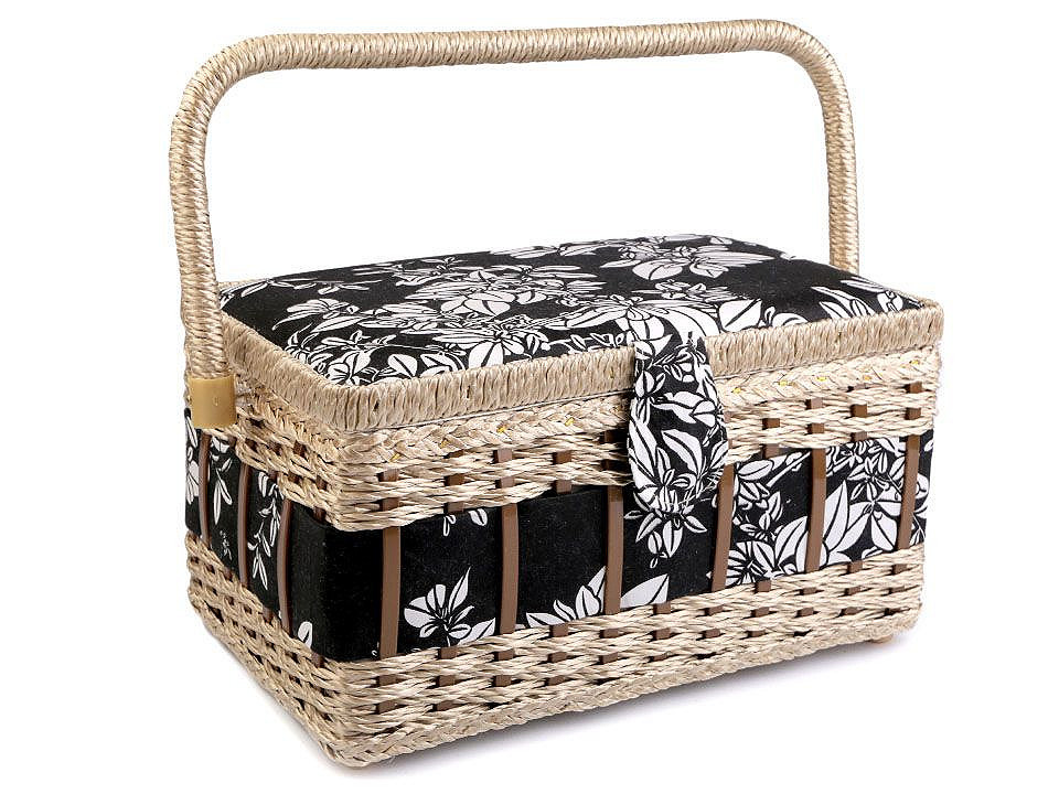 Košík na šicí potřeby o rozměrech 18 x 28 cm, výšce 15 cm nabízíme v různých barevných i vzorových variantách. Vnitřní strana víka je vybavená jehelníčkem a kapsičkou. Dále je k dispozici plastové mezipatro s pěti různě velkými přihrádkami, do kterých si lze šicí potřeby uspořádat. Lze jej snadno vyjmout. Výška mezipatra je 3 cm. Košík má zapínání na magnet a díky kvalitnímu a pevnému uchu jej můžete snadno přenést.