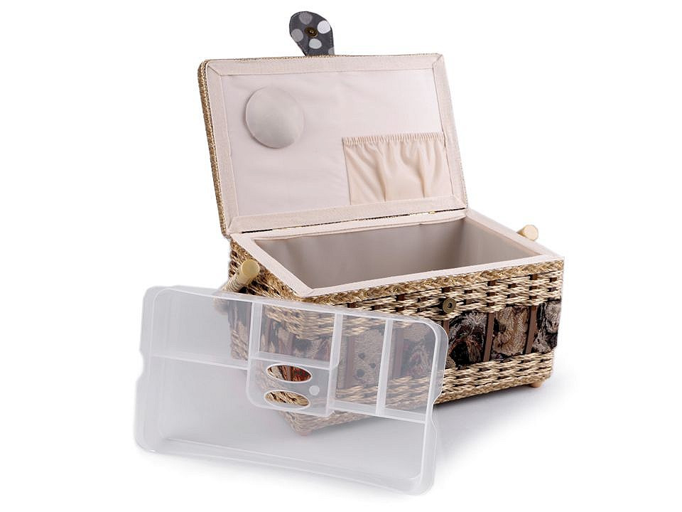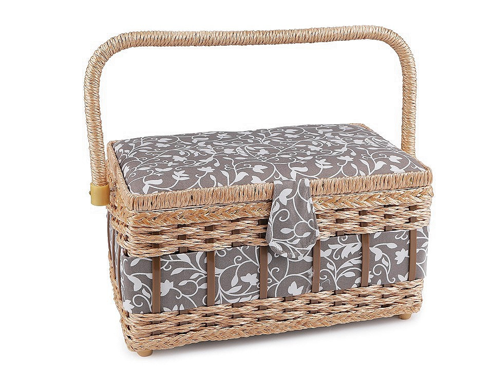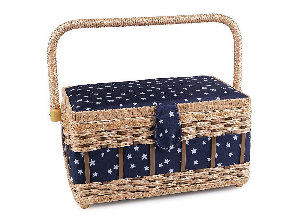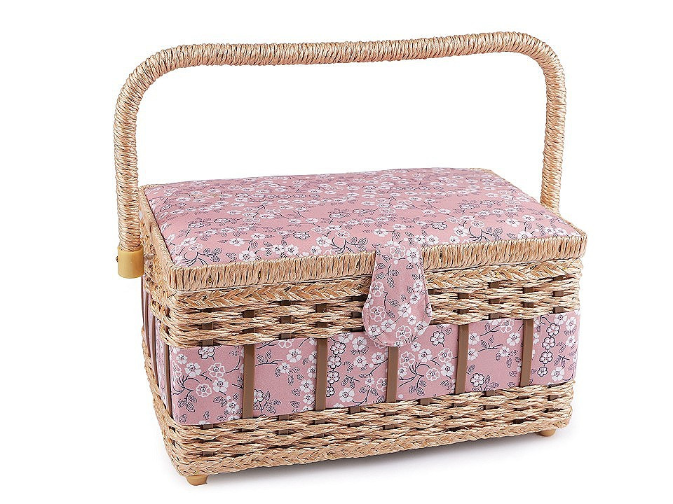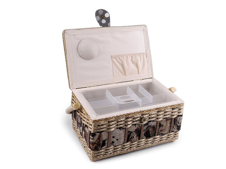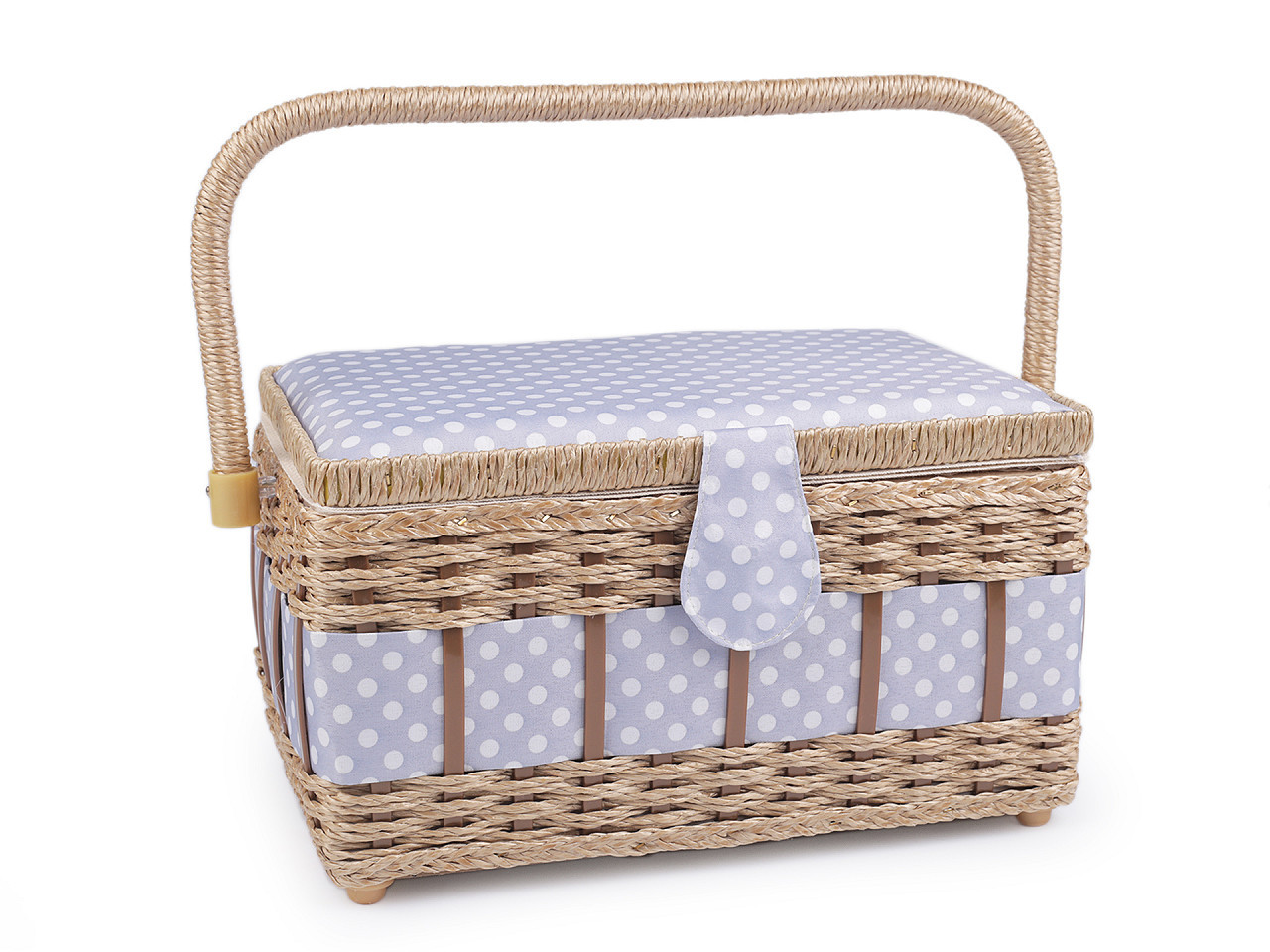 Košík na šicí potřeby o rozměrech 18 x 28 cm, výšce 15 cm nabízíme v různých barevných i vzorových variantách. Vnitřní strana víka je vybavená jehelníčkem a kapsičkou. Dále je k dispozici plastové mezipatro s pěti různě velkými přihrádkami, do kterých si lze šicí potřeby uspořádat. Lze jej snadno vyjmout. Výška mezipatra je 3 cm. Košík má zapínání na magnet a díky kvalitnímu a pevnému uchu jej můžete snadno přenést.