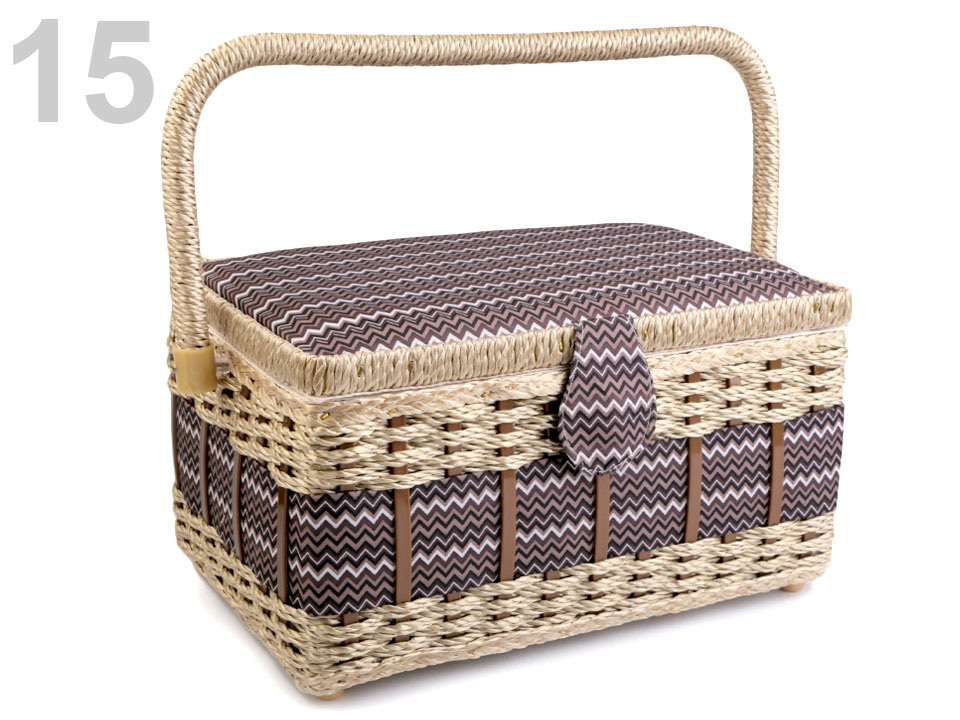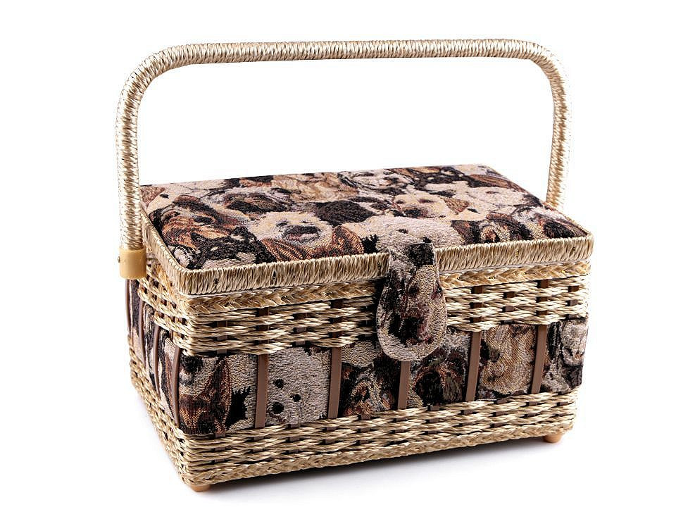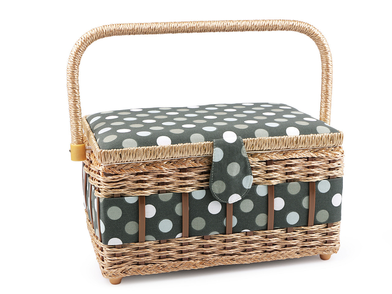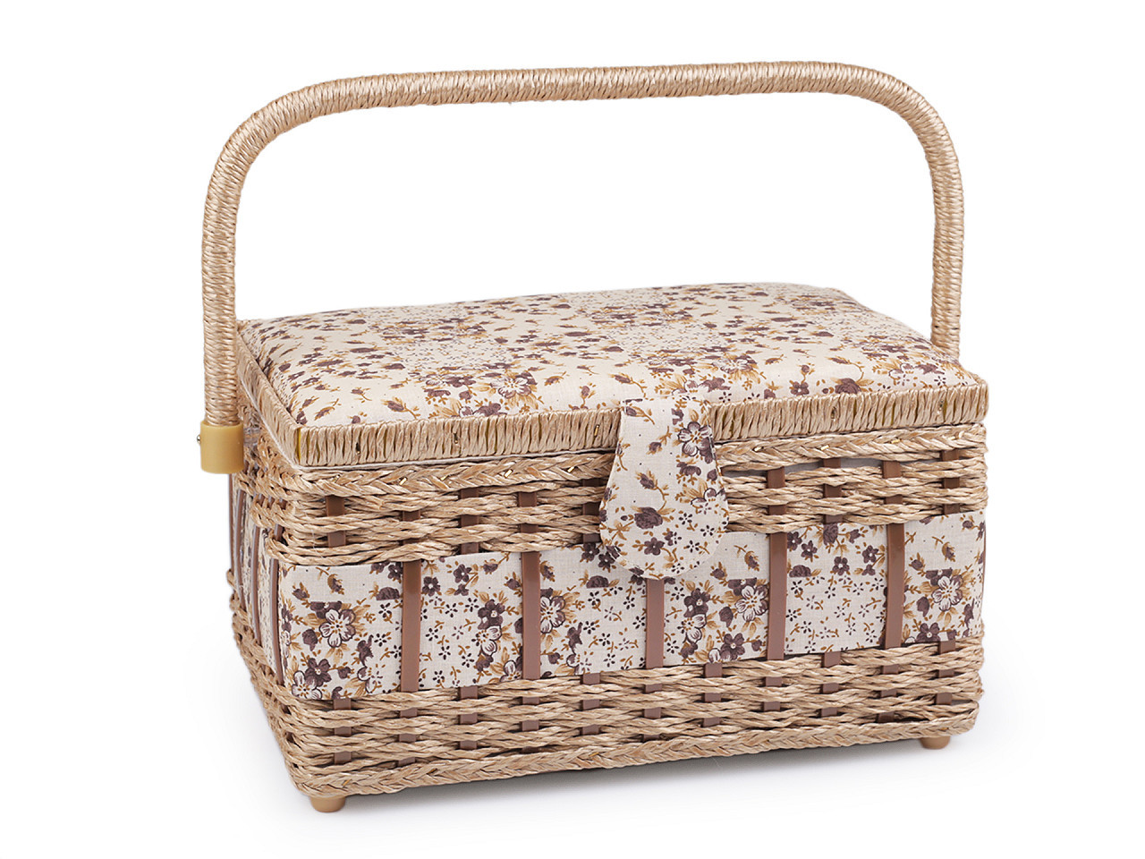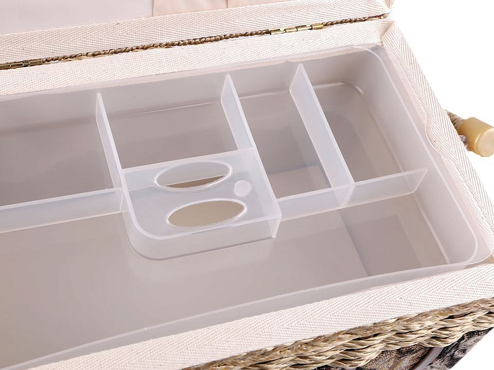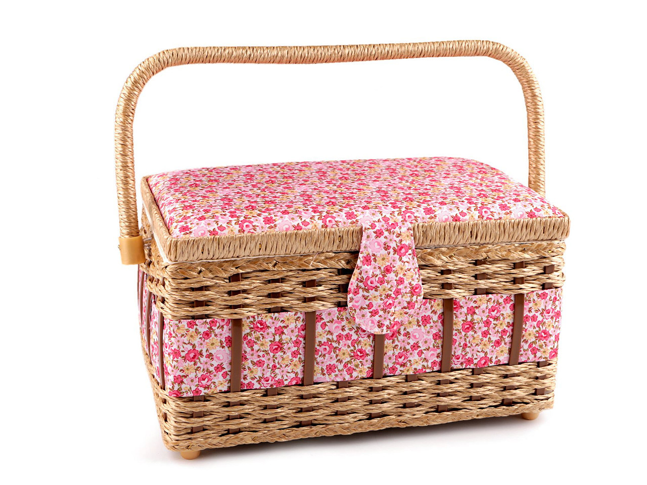 Košík na šicí potřeby o rozměrech 18 x 28 cm, výšce 15 cm nabízíme v různých barevných i vzorových variantách. Vnitřní strana víka je vybavená jehelníčkem a kapsičkou. Dále je k dispozici plastové mezipatro s pěti různě velkými přihrádkami, do kterých si lze šicí potřeby uspořádat. Lze jej snadno vyjmout. Výška mezipatra je 3 cm. Košík má zapínání na magnet a díky kvalitnímu a pevnému uchu jej můžete snadno přenést.
