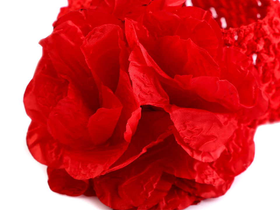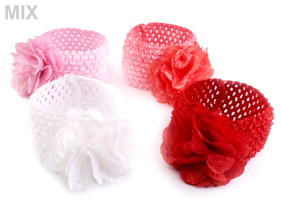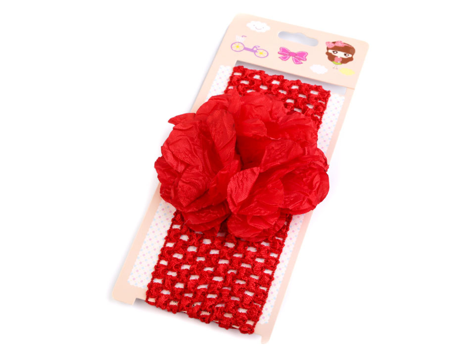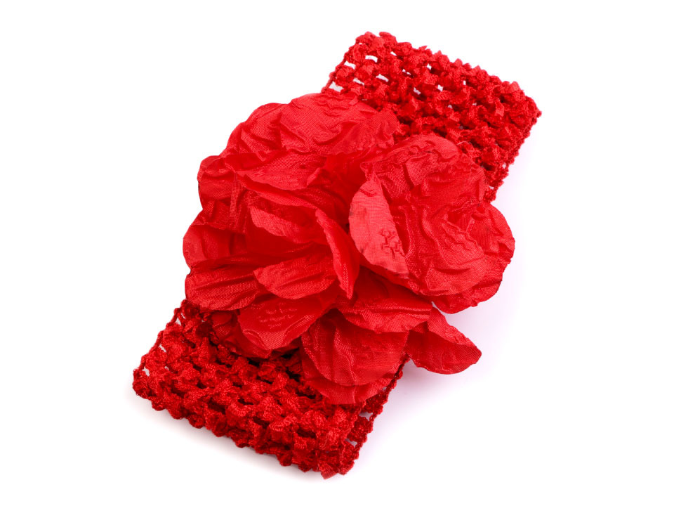 Elastická čelenka ze síťované tutu pruženky ozdobená velkým květem zajímavě oživí dětský účes. Velmi pohodlně se nosí, dobře se přizpůsobí. Květ má okvětní lístky z vrapovaného textilu. Je bohatý, 3D plastický, přesto má nízkou hmotnost.
