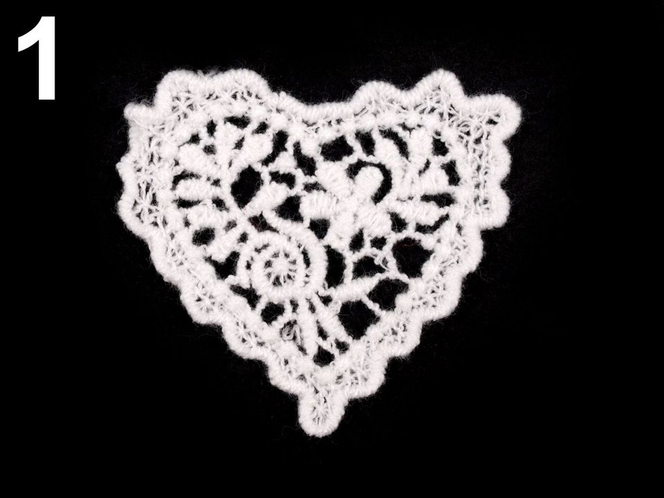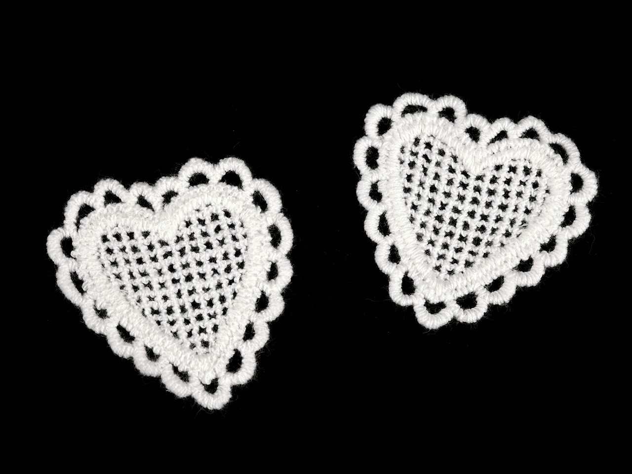 Textilní aplikace srdíčko má rozměry 45 x 45 mm. Okraje tvoří ozdobné oblouky. Používá se ke zdobení oděvů, bytových doplňků, na scrapbooking a dalších dekorací např. vlastní tvorby.
