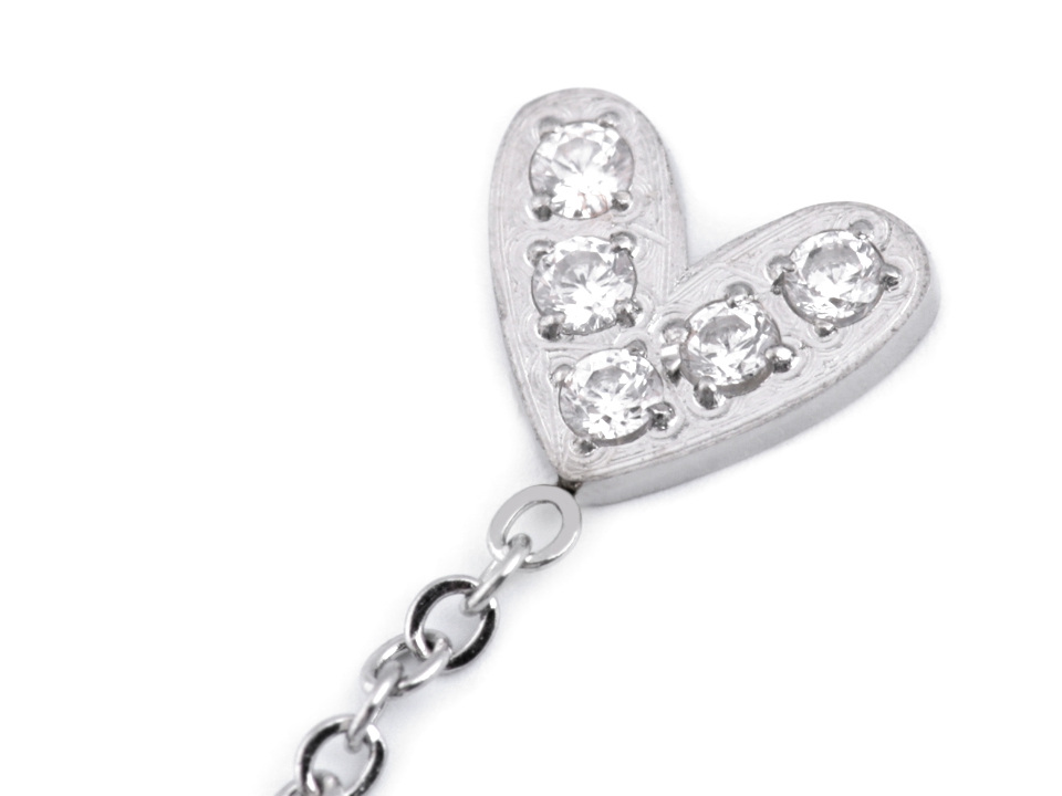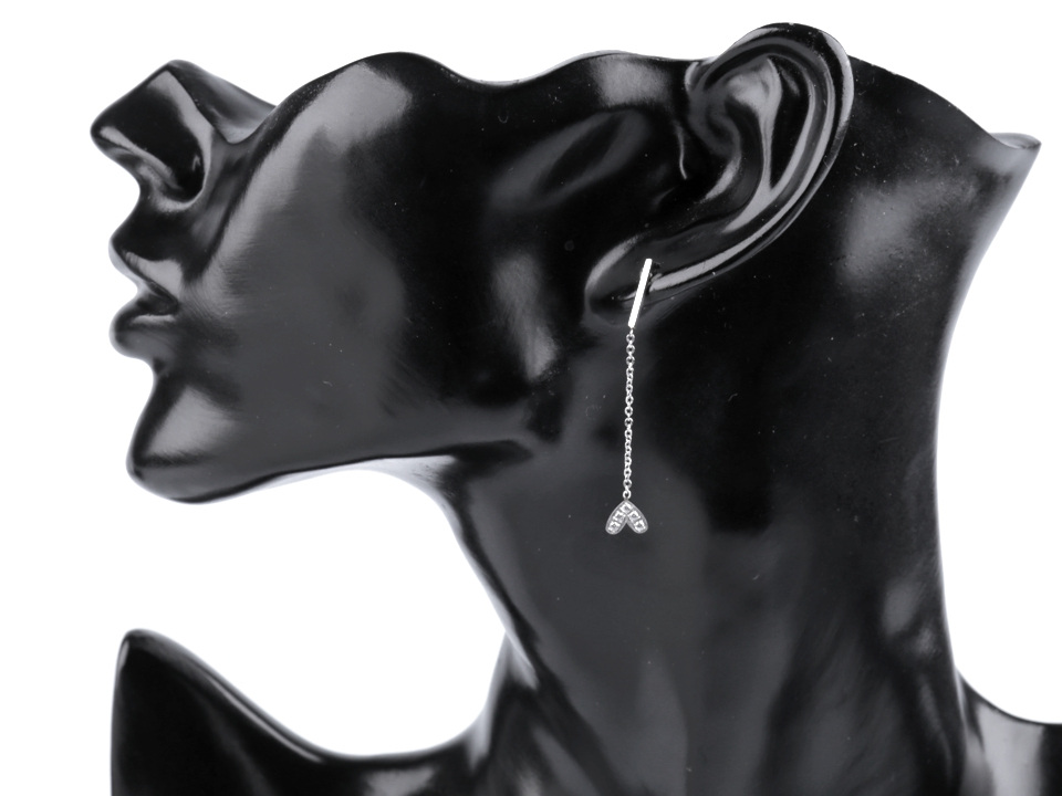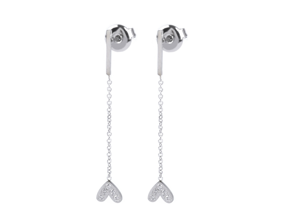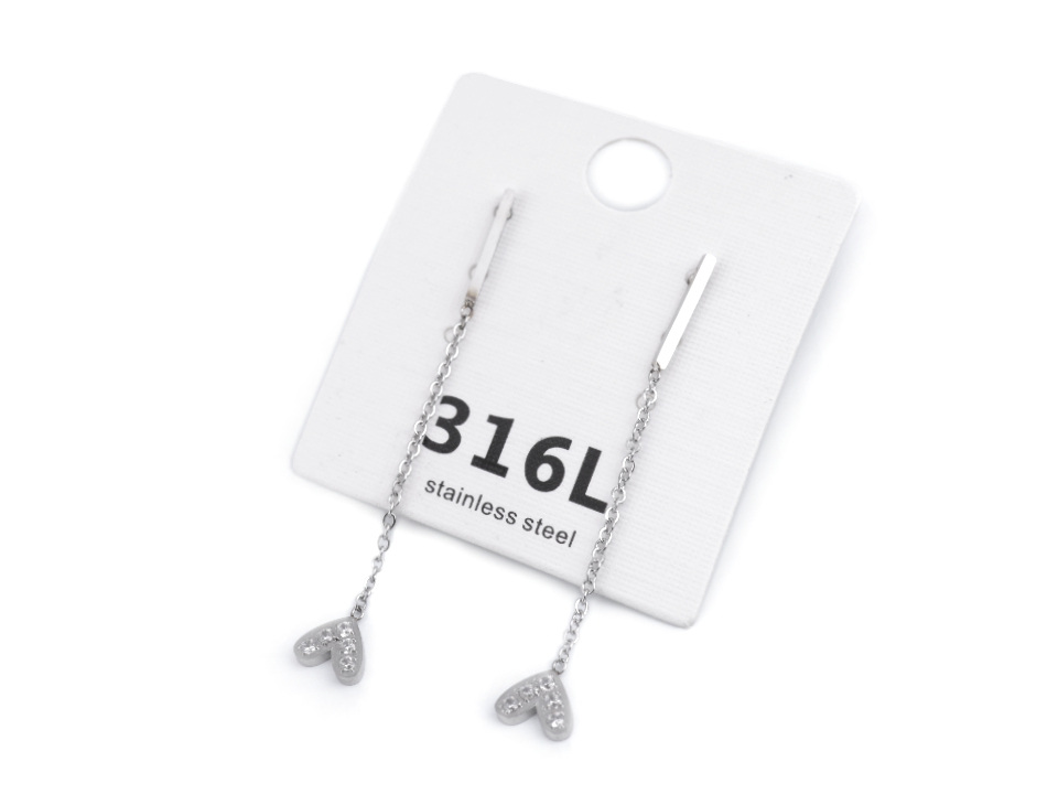 Visací náušnice se srdíčky jsou vyrobené z kvalitní nerezové oceli. Srdíčka mají v sobě zasazené broušené kamínky. Visí na řetízku, při pohybu hlavy se houpou.