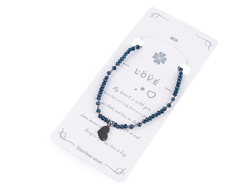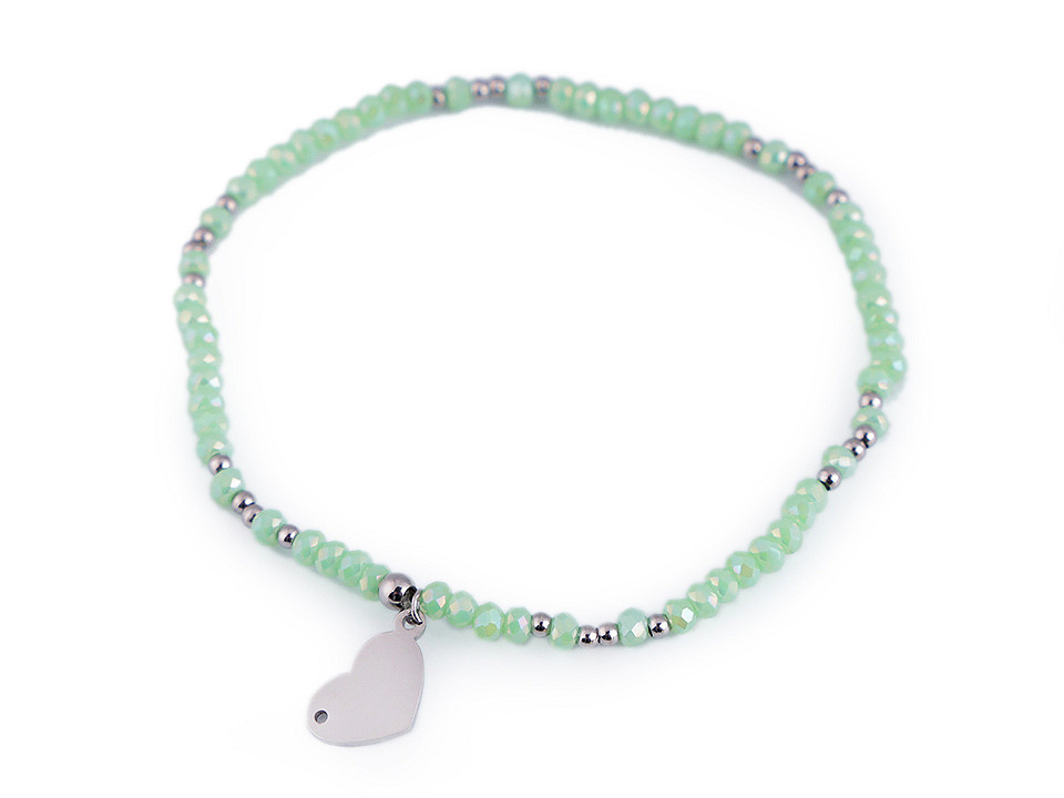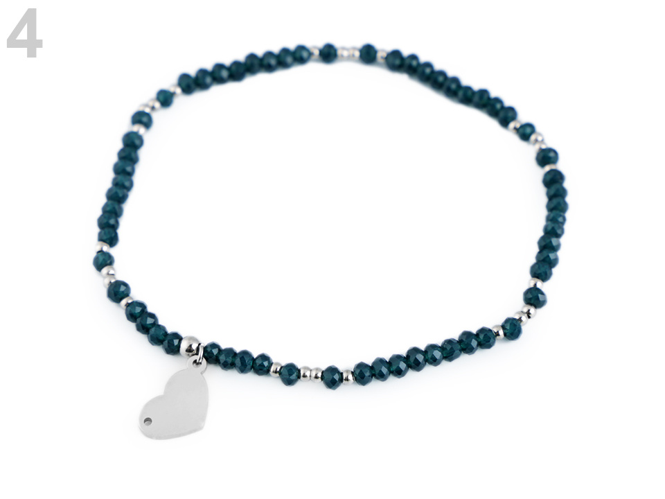 Náramek s broušenými korálky z nerezové oceli  - srdce - 4 zelená tm.