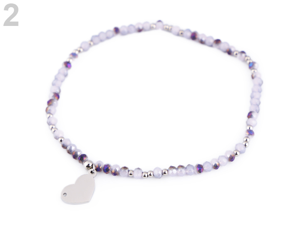 Náramek s broušenými korálky z nerezové oceli  - srdce - 2 fialová nejsvětlejší
