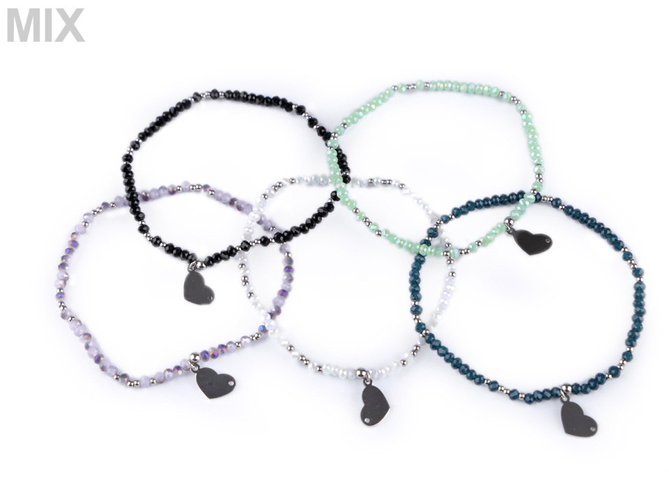 Pružný náramek se skládá z malých broušených korálků a je ozdobený přívěskem ve tvaru srdce. Díky pružence má náramek univerzální velikost, snadno se natáhne na ruku.