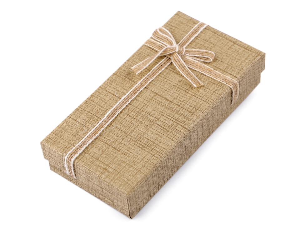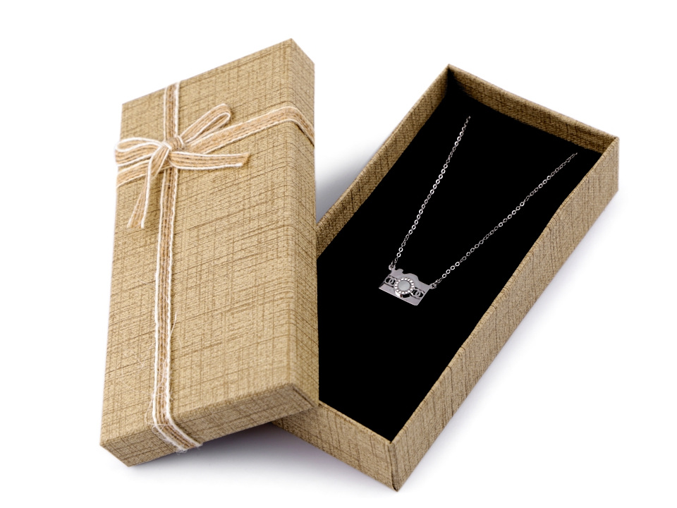 Papírová krabička je vhodná nejen na šperky (náhrdelník, náušnice a prsten), ale také na motýlka. Uvnitř je molitanová výplň s průřezy, která se dá vyjmout. Krabička je pevná a víčko je ozdobené jutovou mašlí.