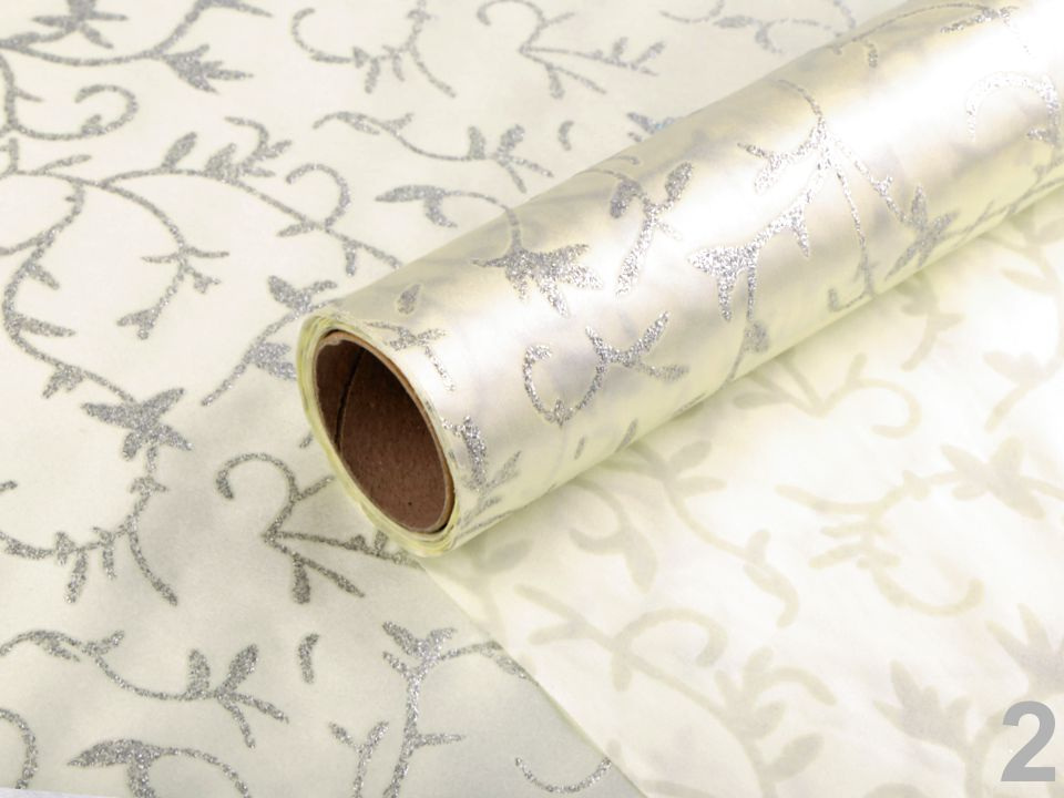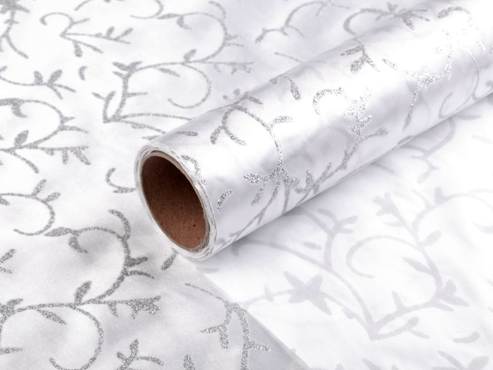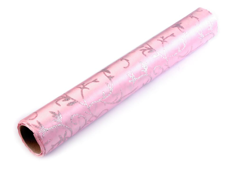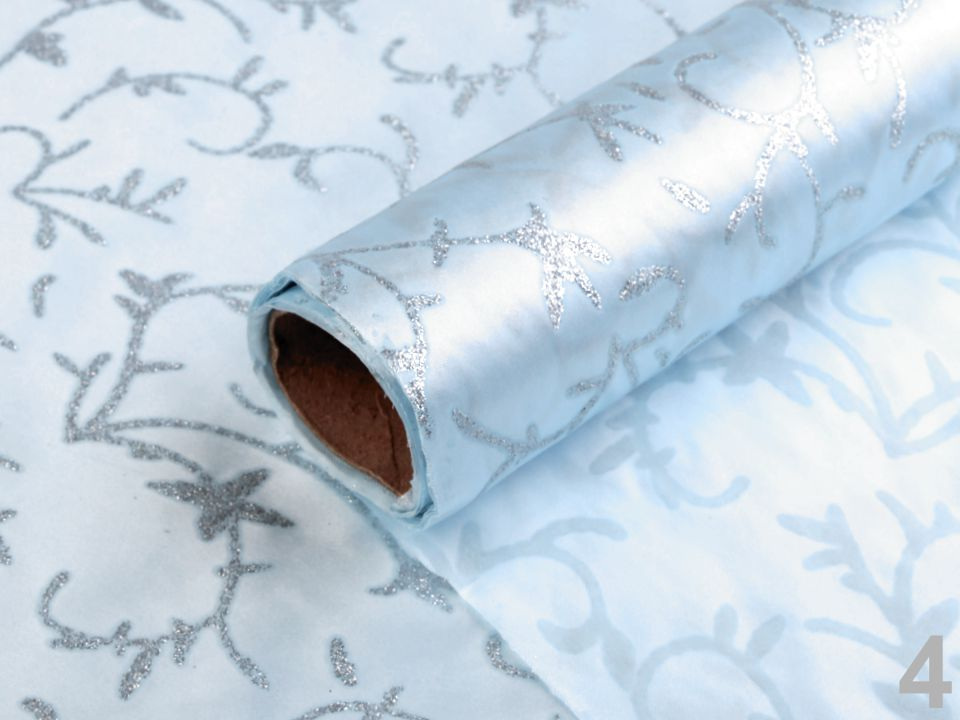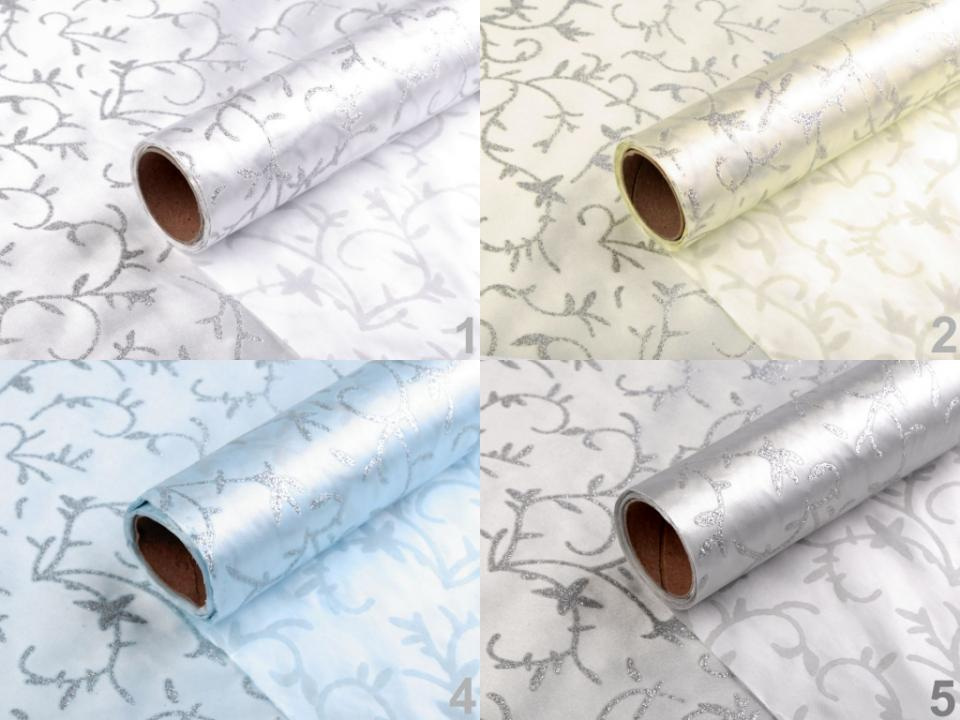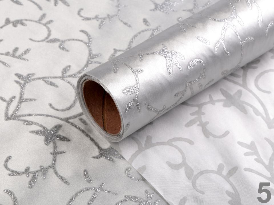 Elegantní satén se díky glitrovým ornamentům efektně třpytí. Potisk a lesk jsou pouze z jedné strany, druhá strana je matná.