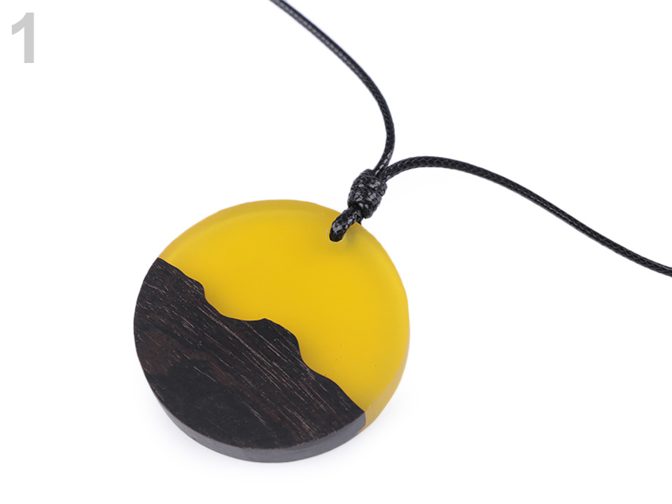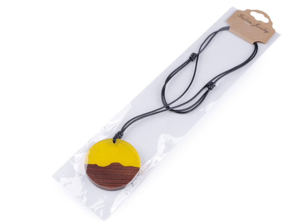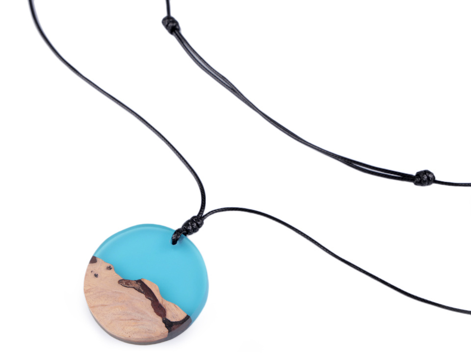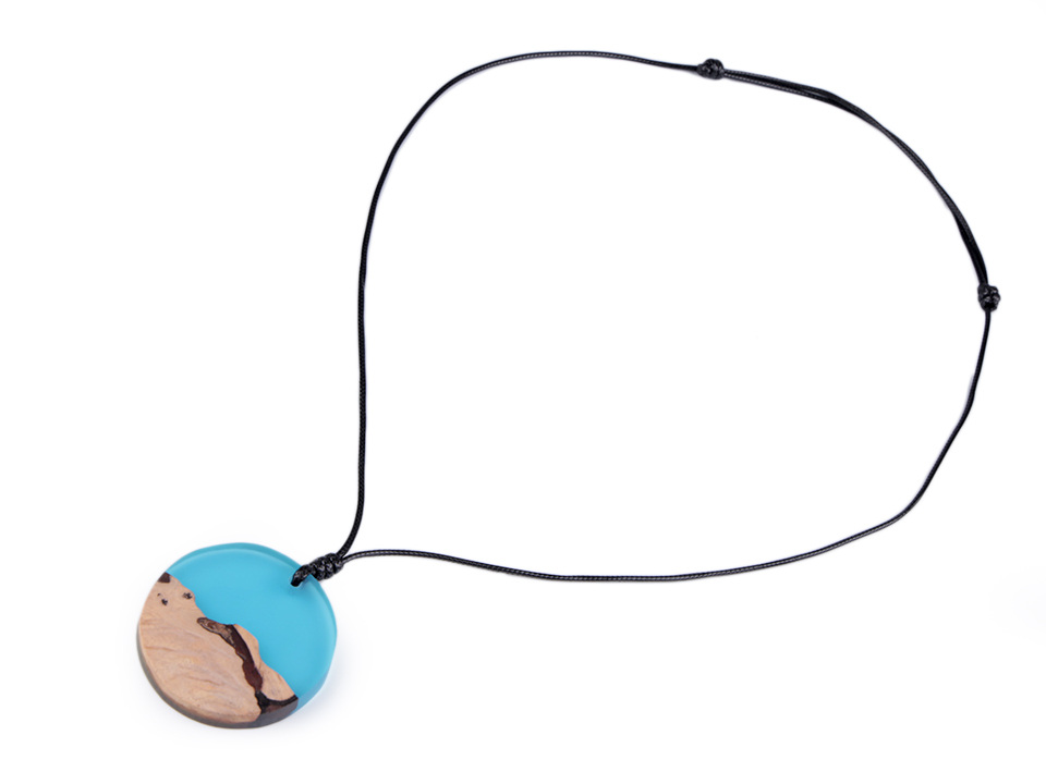 Výrazný přírodní náhrdelník ocení milovníci designových kousků. Zaujme velkým originálním přívěskem z pryskyřice a dřeva. Náhrdelník nemá zapínání, díky posuvným uzlíkům si můžete jeho délku lehce upravit.