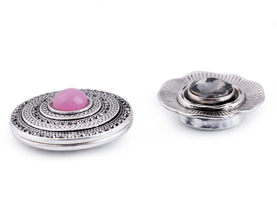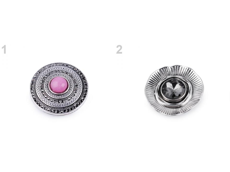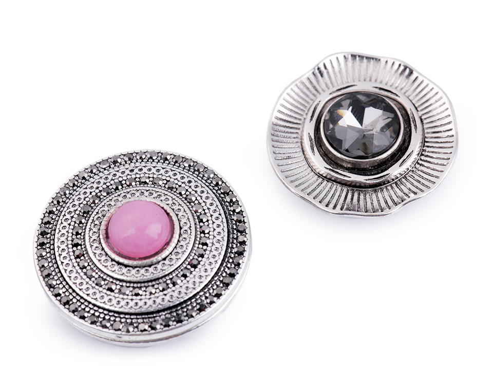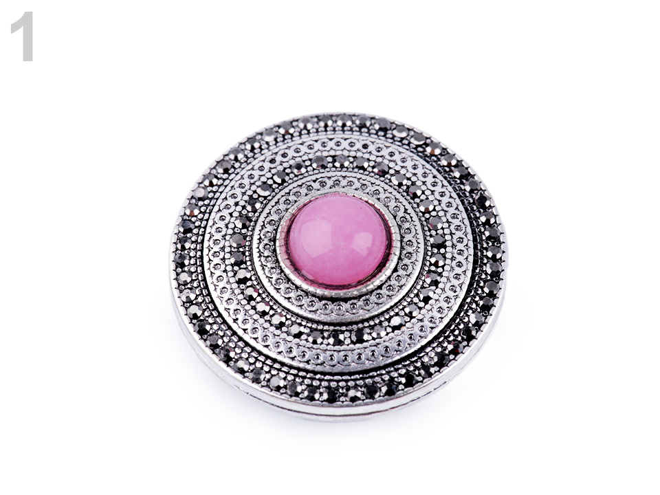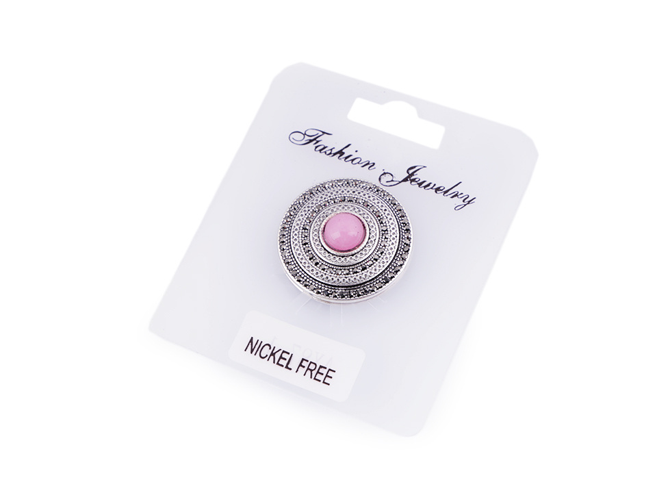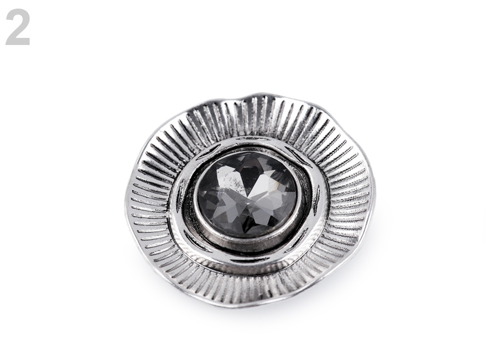 Magnetickou brož zdobí broušené kamínky. Brož č. 1 má kamínky drobné, brož č. 2 má jeden velký broušený kámen uprostřed.
