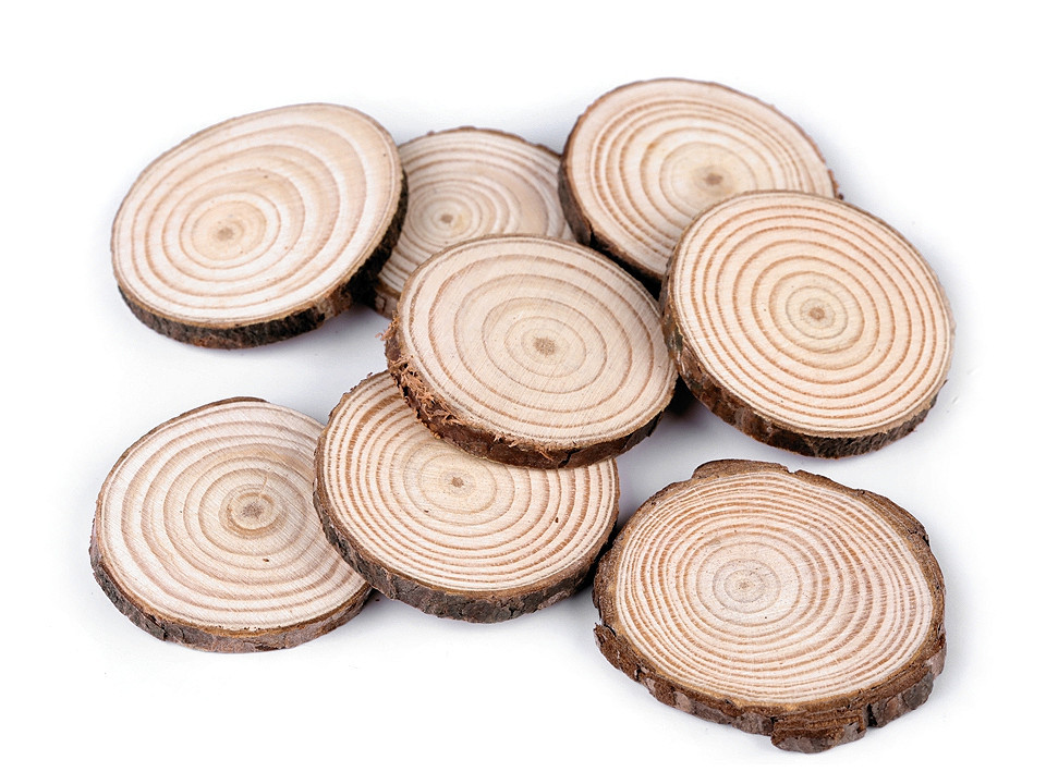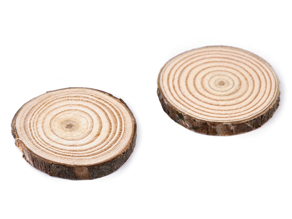 Přírodní dřevěná kolečka se hodí k dalšímu dotvoření. Jsou rovná, po obvodu mají kůru. Nejsou barvená ani lakovaná, každý kus se může lišit jak barvou, tak kresbou dřeva, velikostí i tloušťkou.