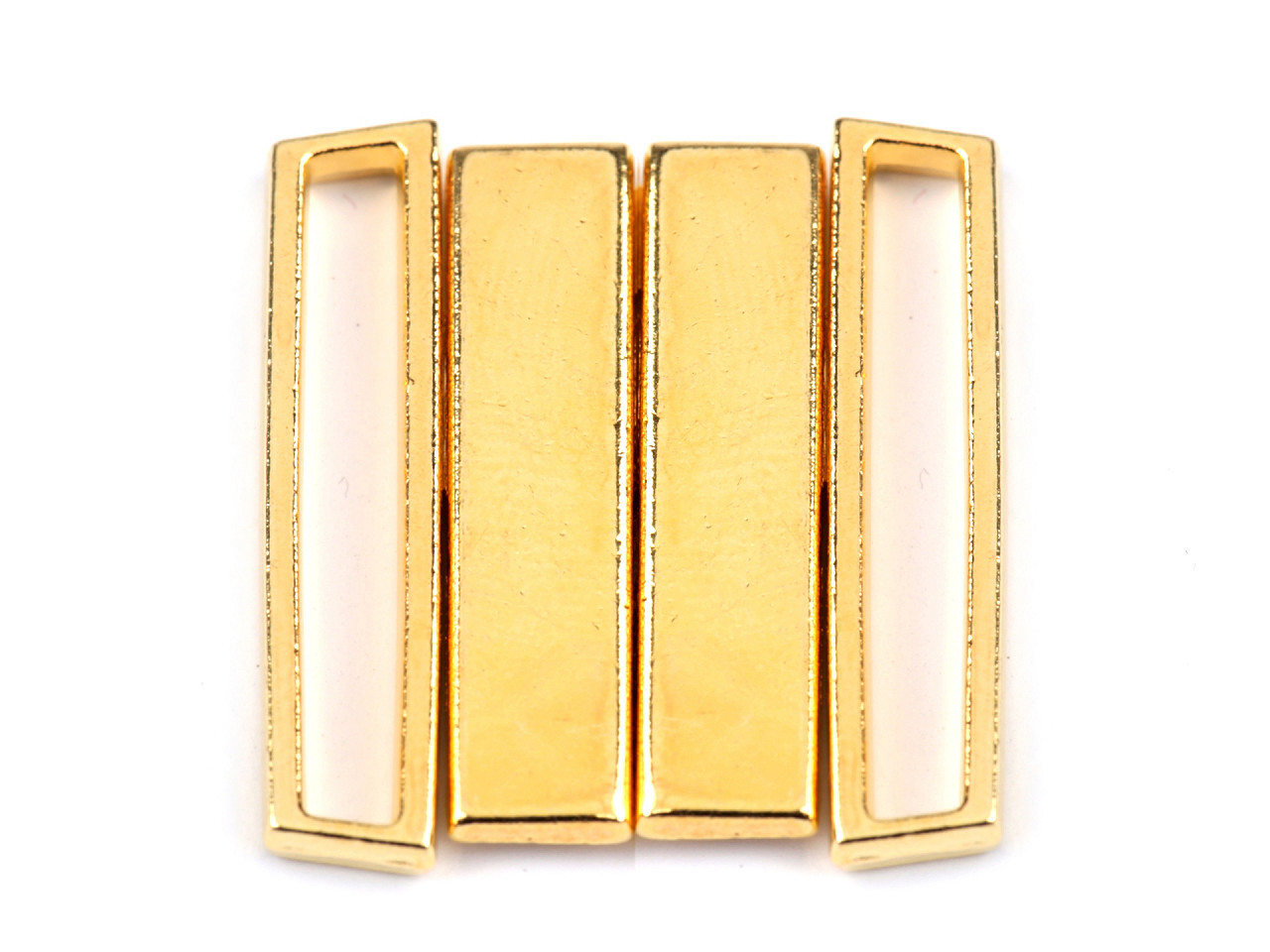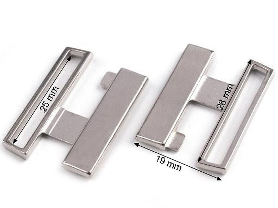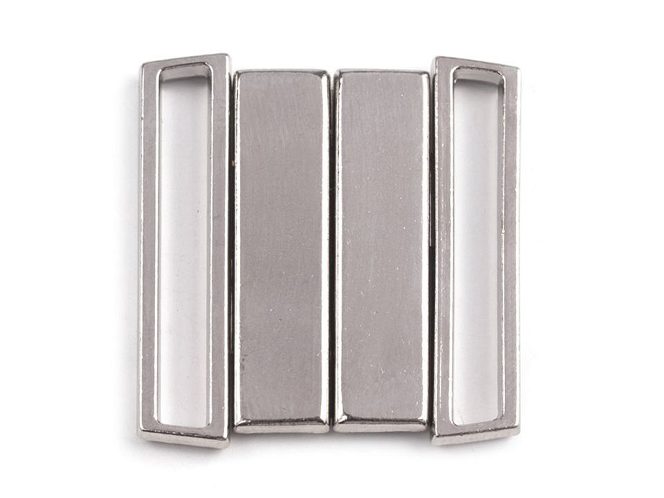 Zapínání na plavky je vyrobené z kvalitního kovu. Zapíná se klasickým způsobem, a to vsunutím jednoho dílu mezi druhý díl. Vnitřní šíře pro uchycení je 25 mm. Rozměry jedné spony jsou: 19 x 28 mm, obou spon 25 x 28 mm, viz. foto.