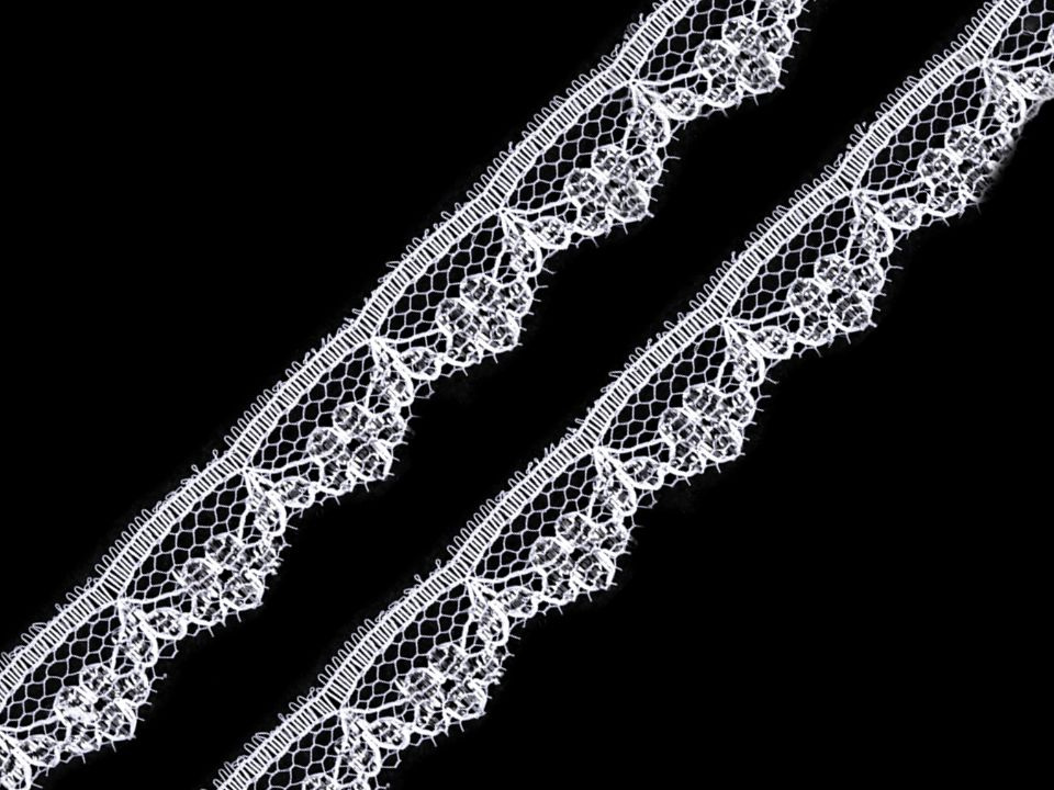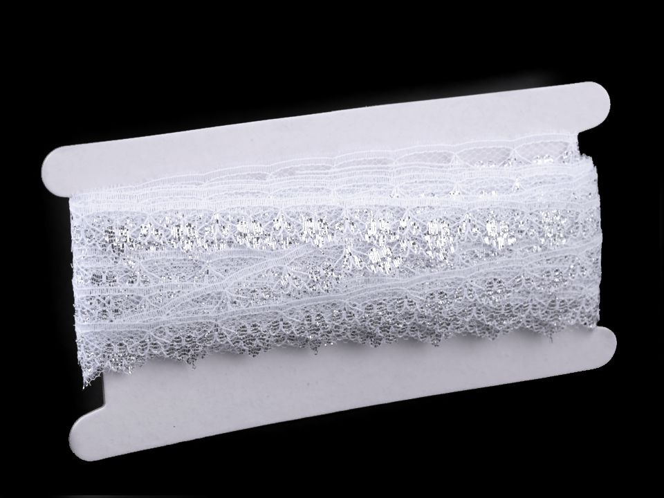 Syntetickou krajku zdobí stříbrný lurex.