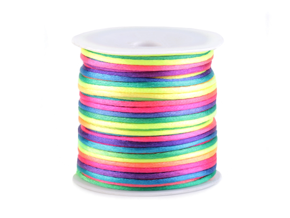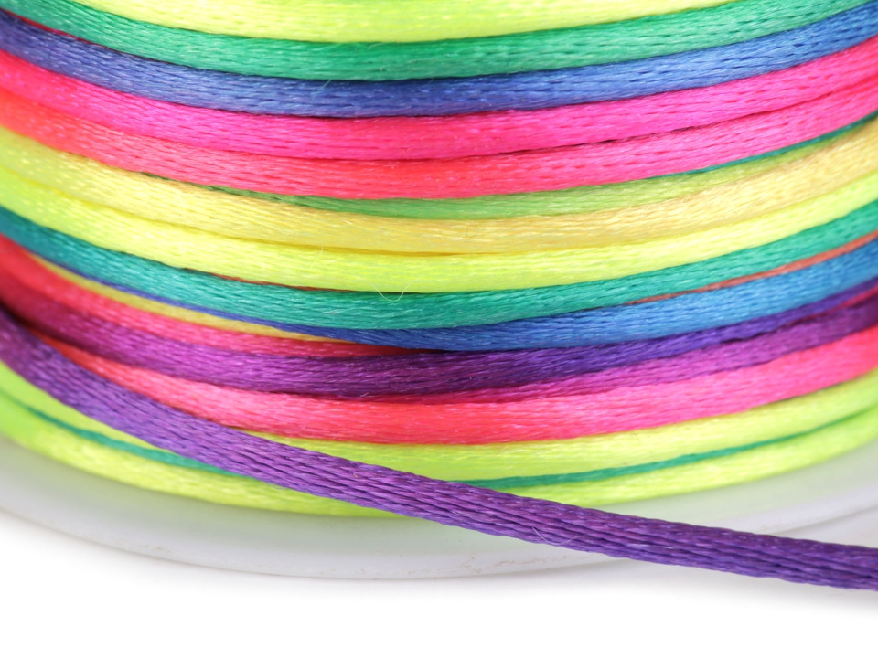 Saténová šňůra je zajímavá svým duhovým zabarvením. Přechody mezi barvami jsou plynulé. Šňůra je kvalitní a pevná.