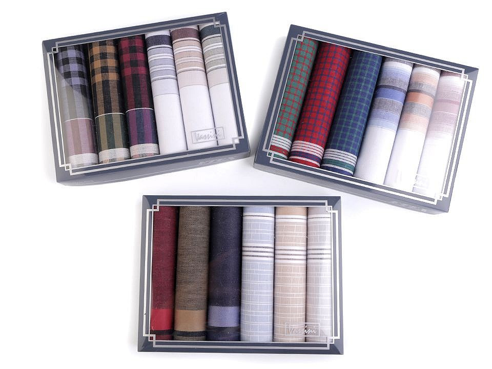 Sada šesti kapesníků v elegantních barvách s dezény proužků. Zabalené ve vkusné krabičce vám mohou posloužit i jako dárek. Jemné na dotek, kvalitní bavlněné provedení. Čtvercový tvar, rozměry 44 x 43 cm.
