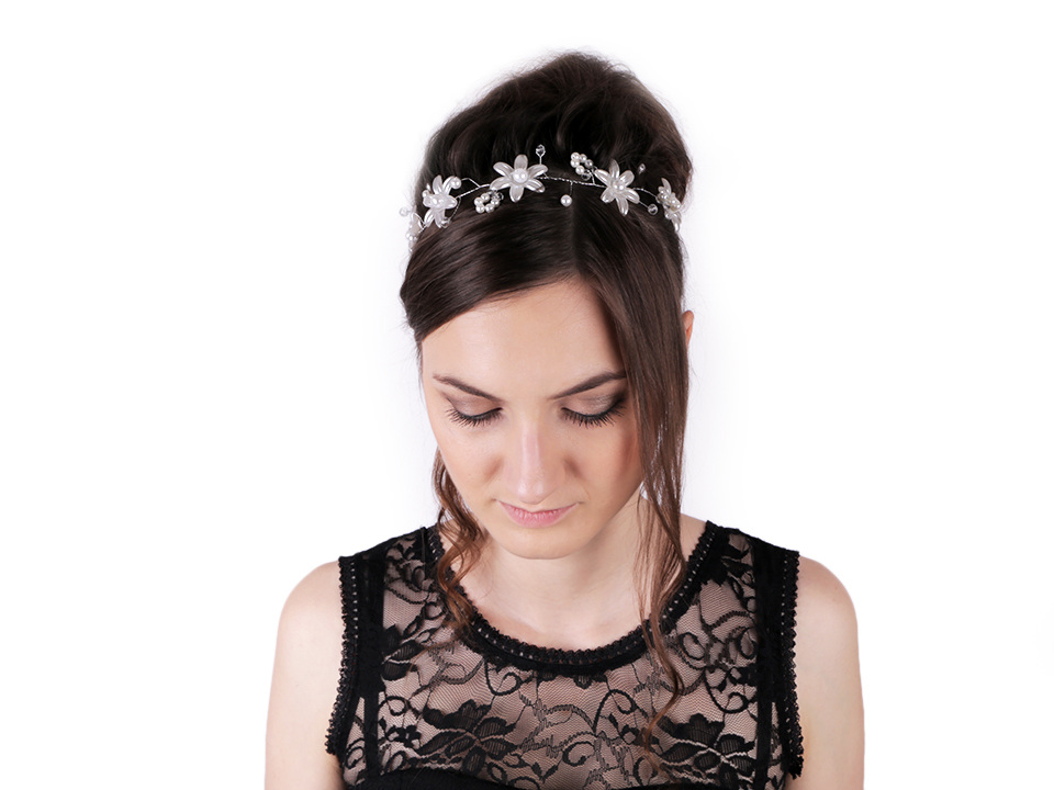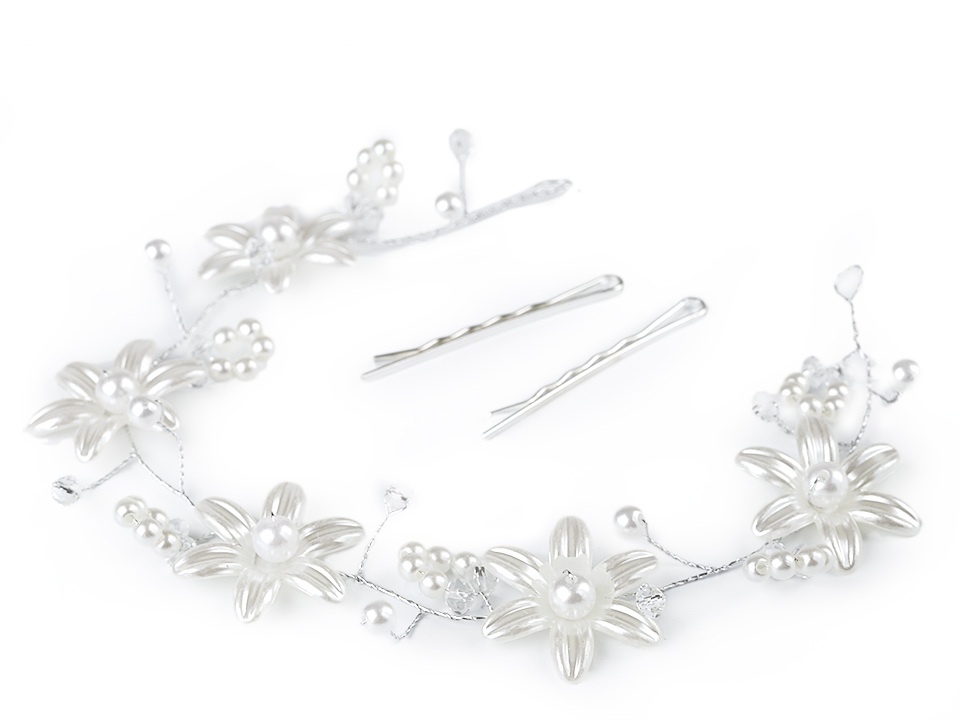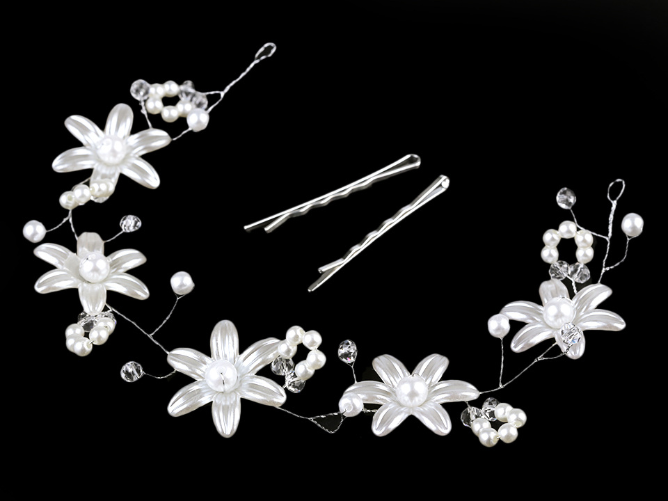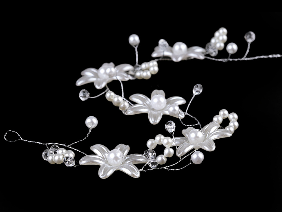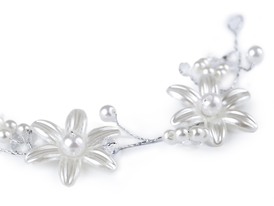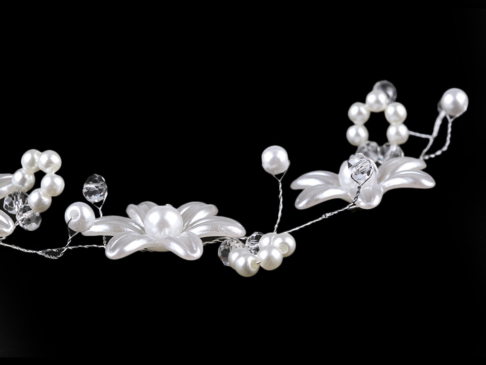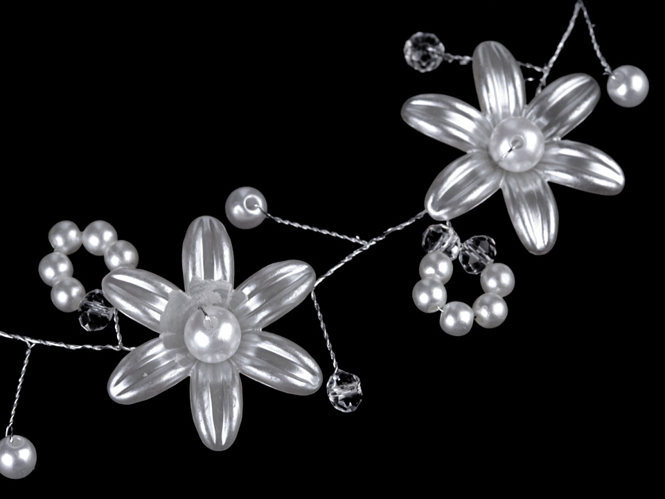 Ozdoba s perlovými květy a broušenými korálky bude skvostným doplňkem vašeho slavnostního účesu. Je tvořená ze stočených drátků, do kterých jsou vpletené perlové a broušené korálky. Díky drátkům se ozdoba lehce ohýbá. Využijete ji jako nevšední doplněk na svatby, svaté přijímání či na plesy. Na koncích má vlasové sponky, za které ji lehce upevníte do účesu. Nebo můžete využít očka na koncích čelenky (cca Ø5 mm), do kterých lze navléci stuhu nebo pruženku.