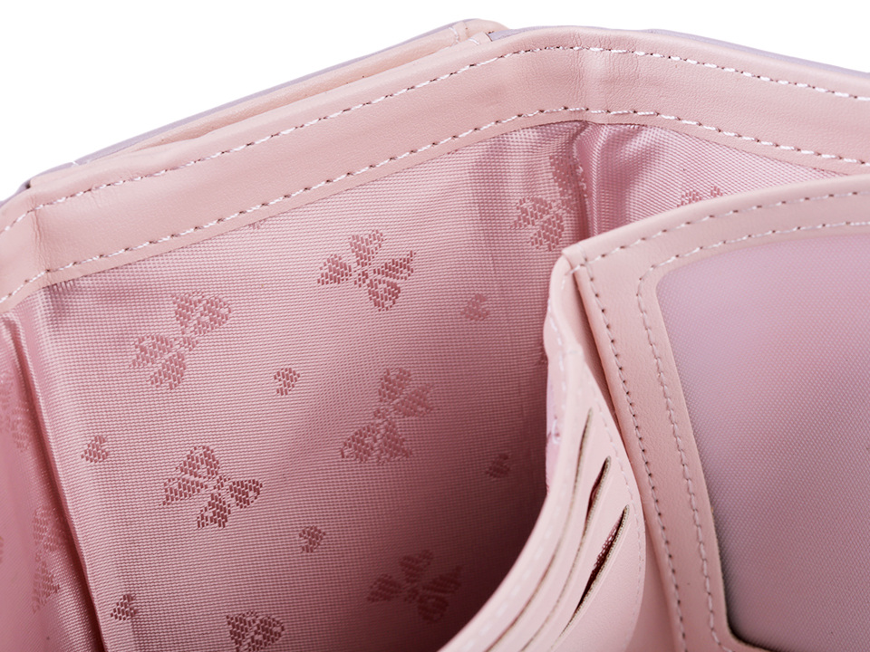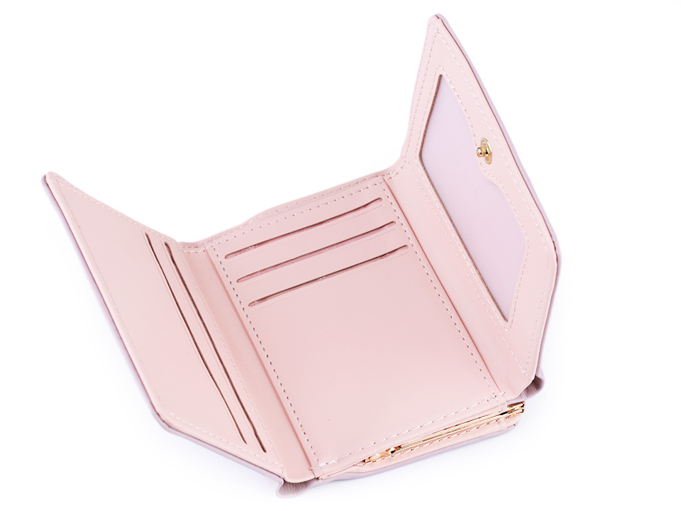 Peněženka je členěná na 2 samostatné oddíly. Po otevření klopy s pampeliškou se objeví oddíl na kreditní karty, vizitky a velká zadní kapsa na bankovky. 1 kapsa má průhled na legitimaci. Klopa se zapíná na cvoček.