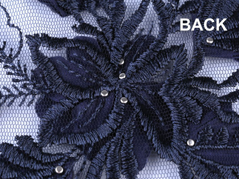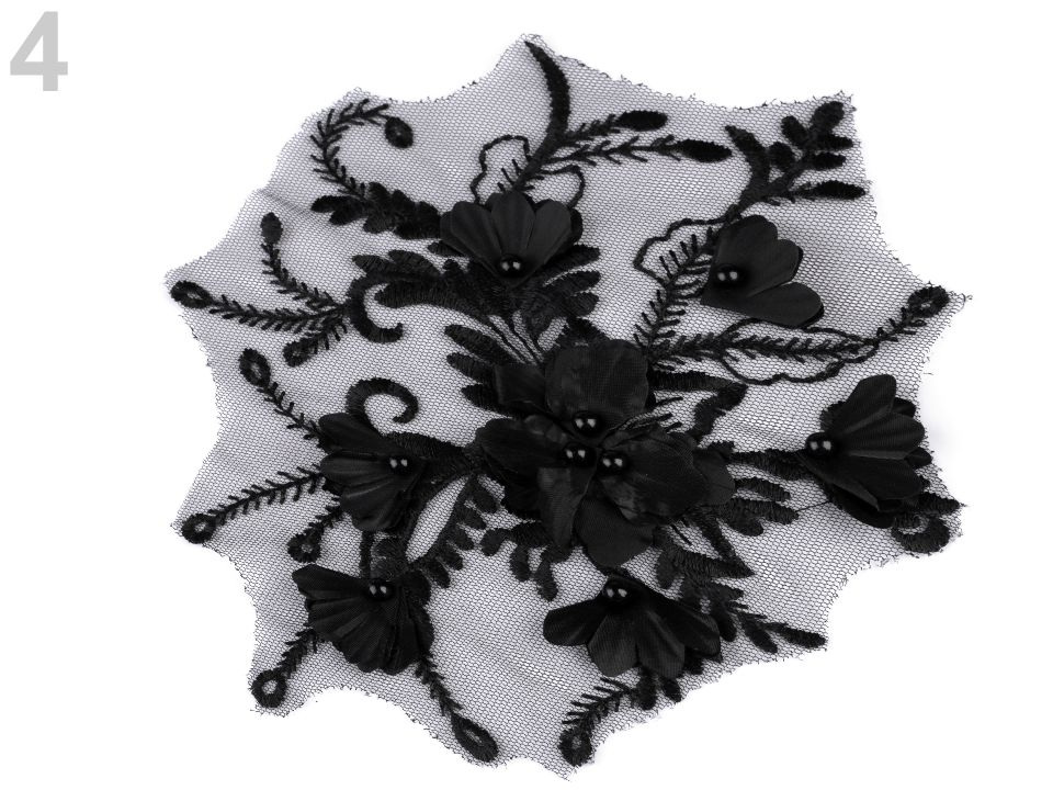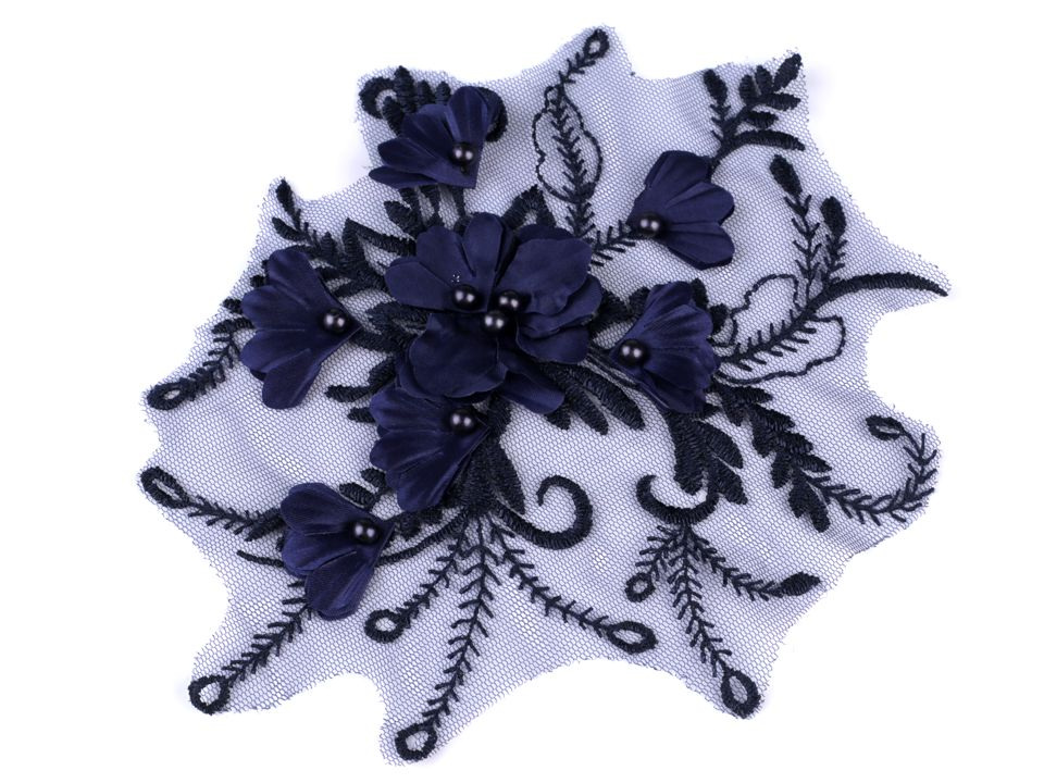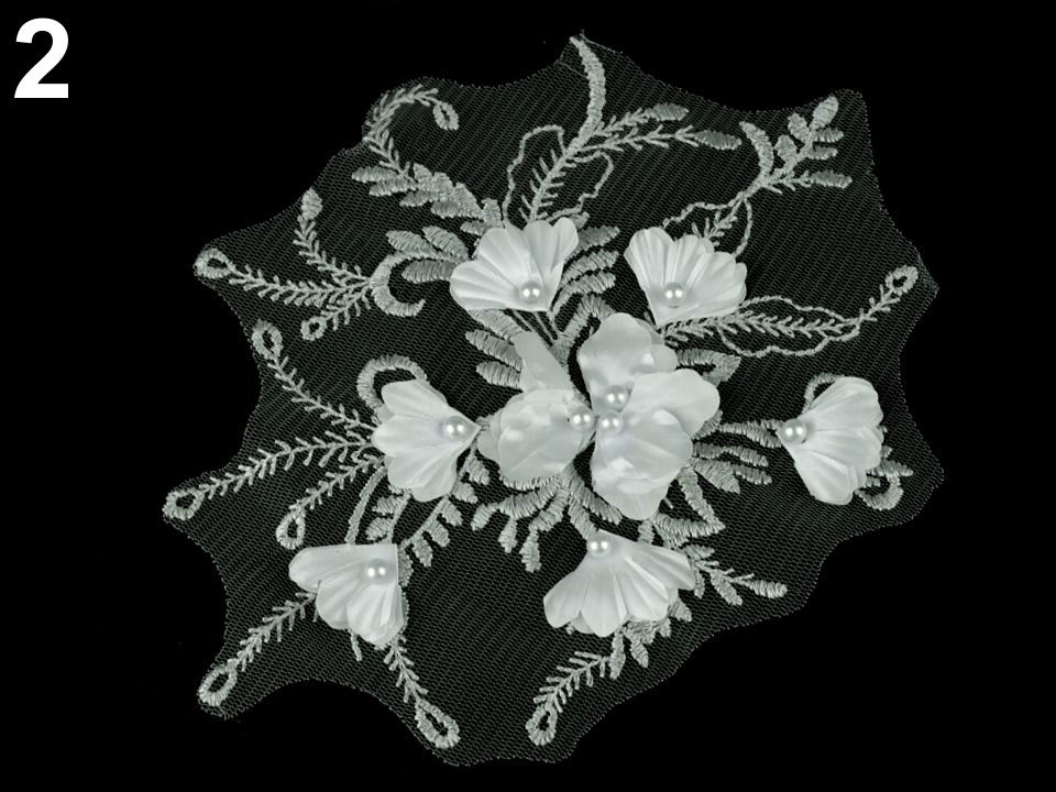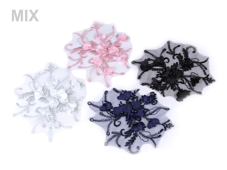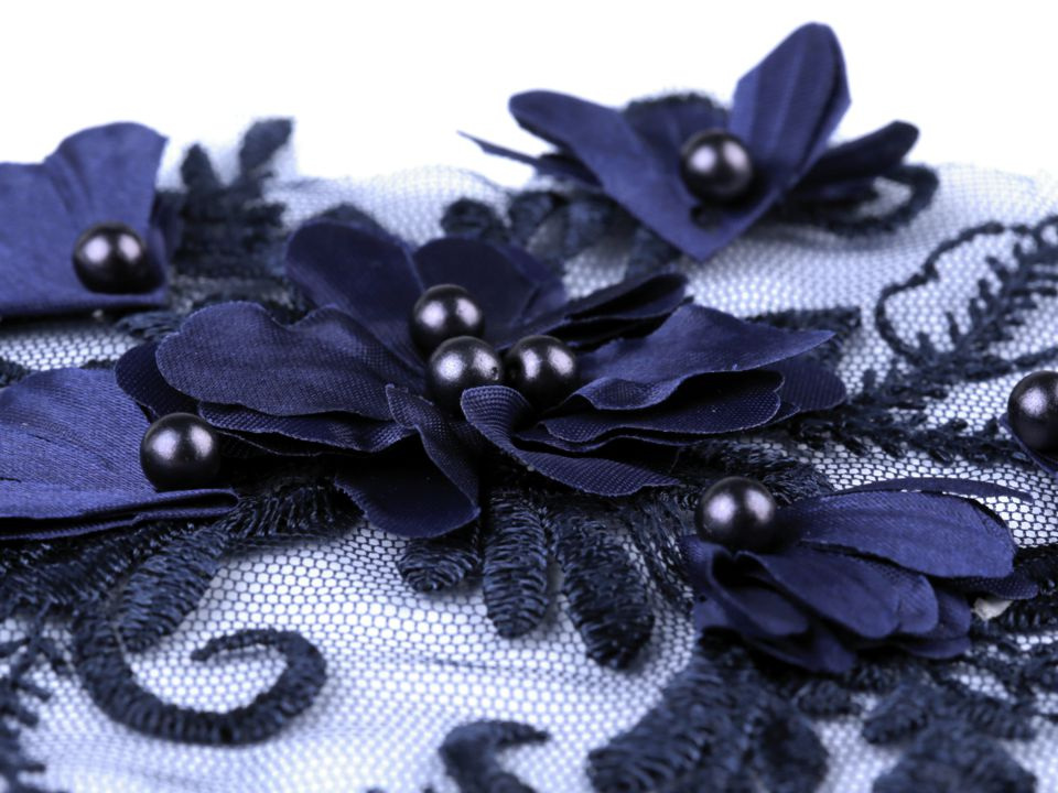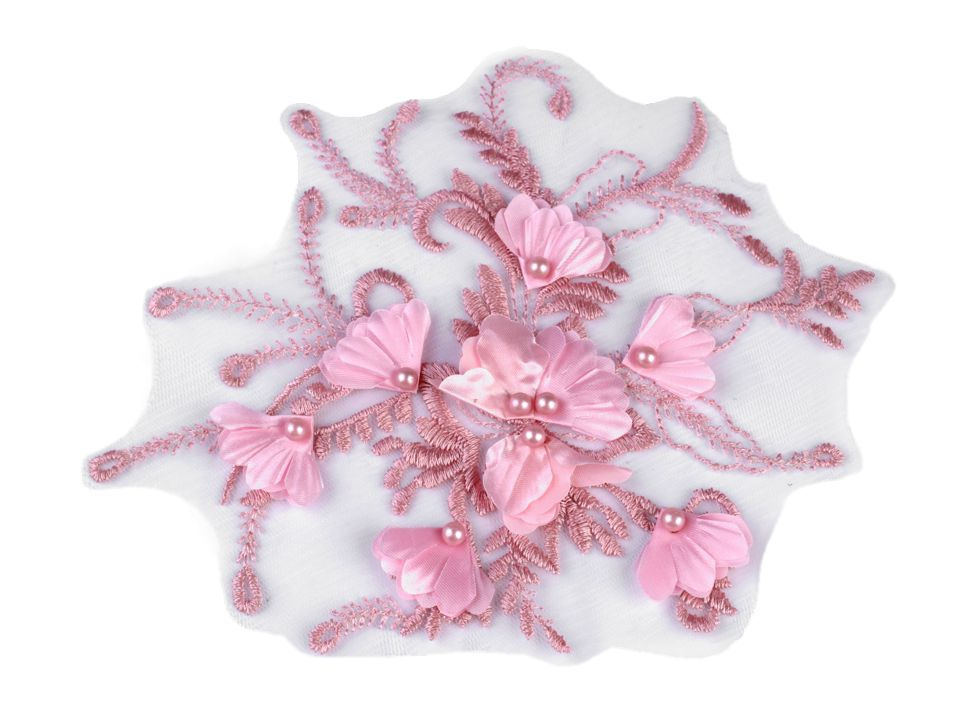 Vsadka je dozdobená 3D květy a perlami. Využijete ji k našití na šaty, saka, sukně, halenky apod.