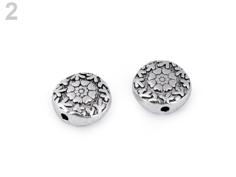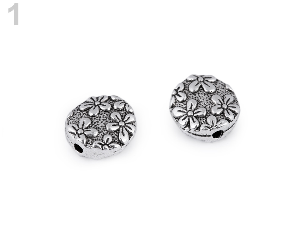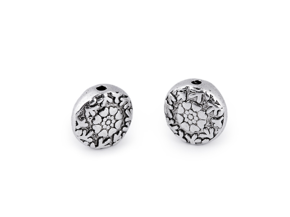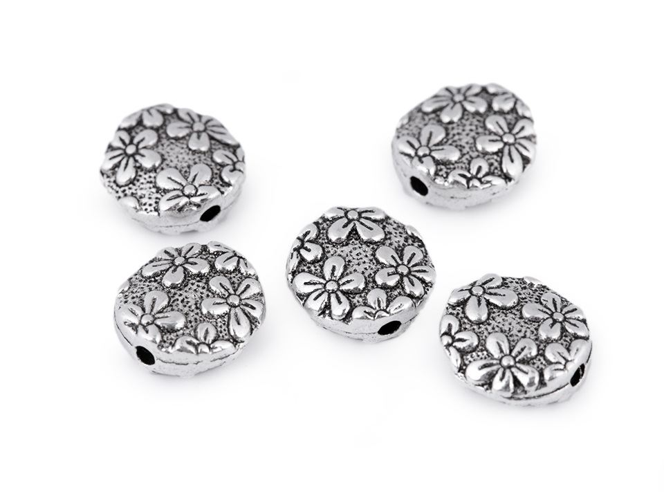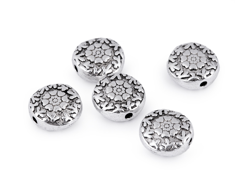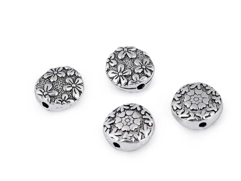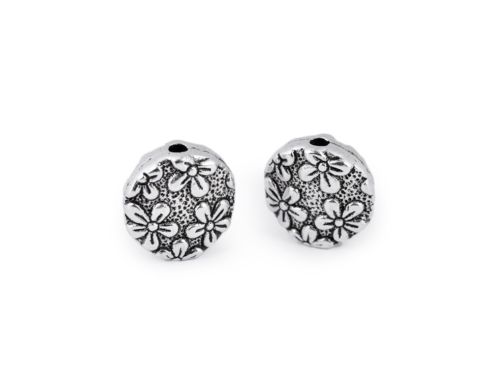 Kovový korálek s motivem květin můžete využít jako zajímavý a oživující prvek. Je oboustranný.