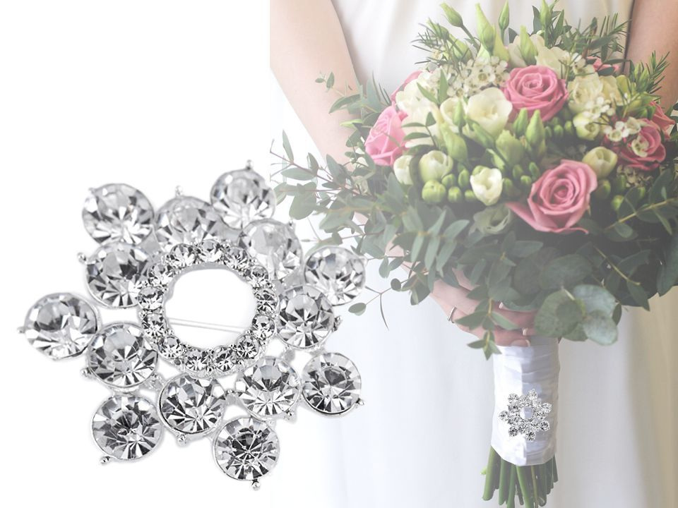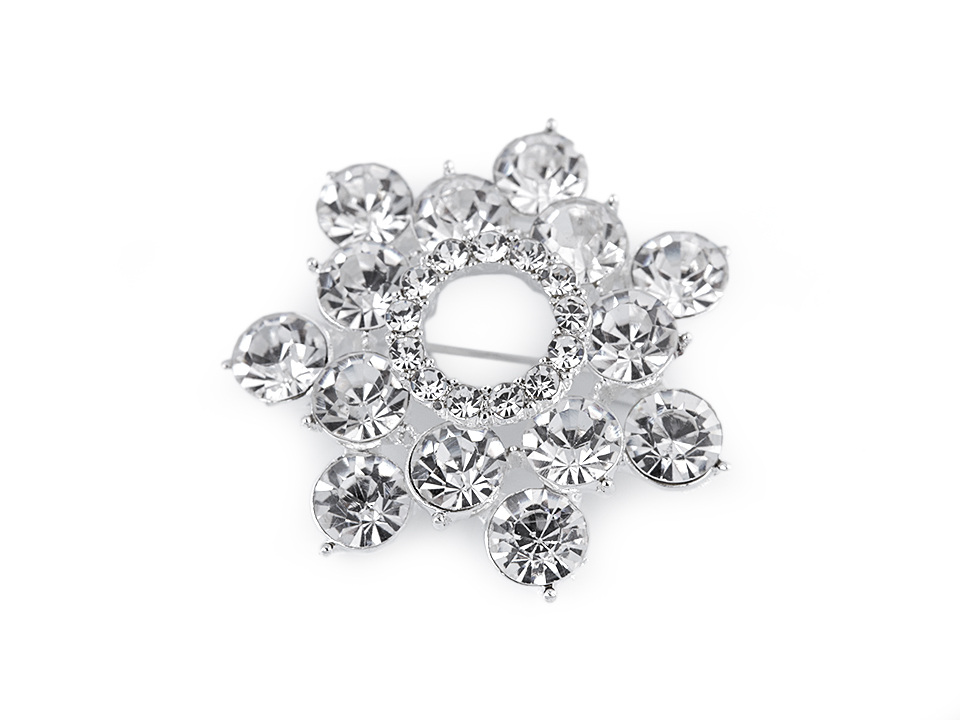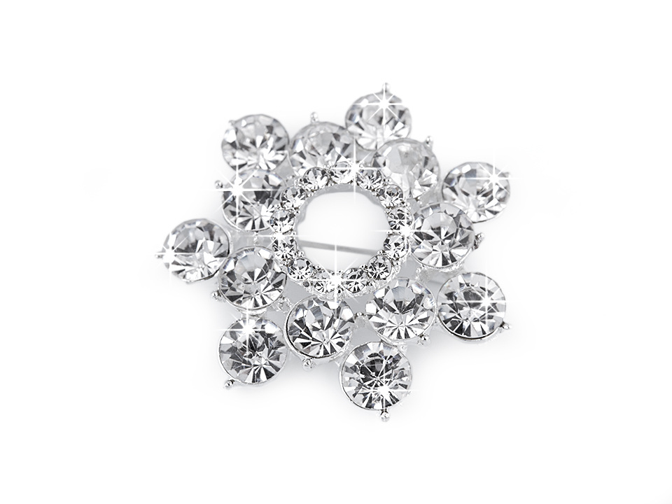 Elegantní brož ve tvaru kytky upoutá na první pohled díky svému třpytu. Kvalitní kovový základ je osázený broušenými kamínky, které vytvářejí oslnivé odlesky. Zapíná se pomocí spínacího špendlíku. Brož je na kartě, kterou lze zavěsit na prodejní stojany.