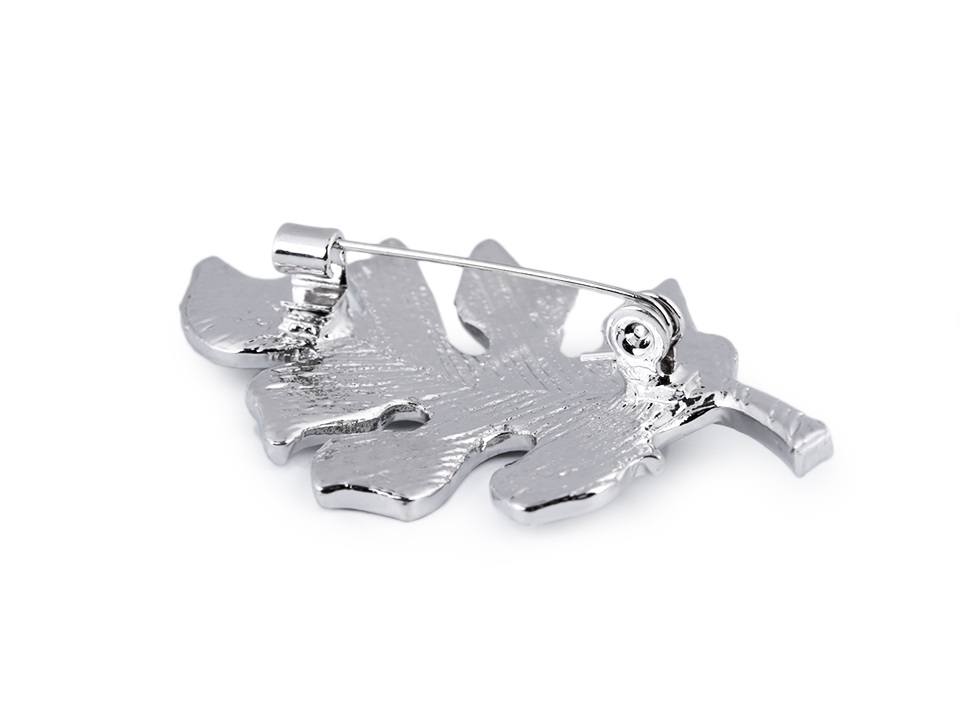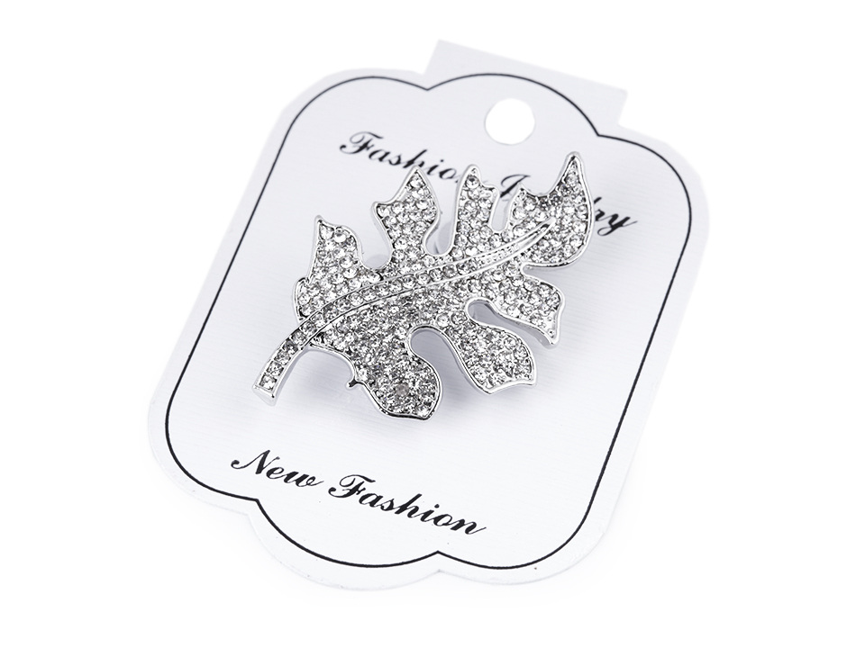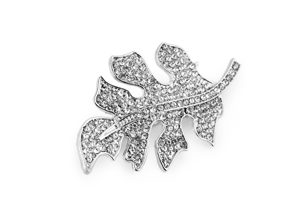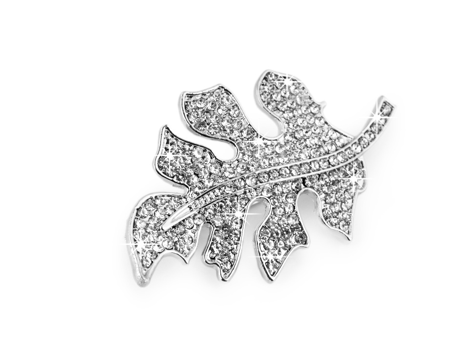 Třpytivá brož ve tvaru listu je osázená broušenými kamínky. Na zadní straně má brožový špendlík.