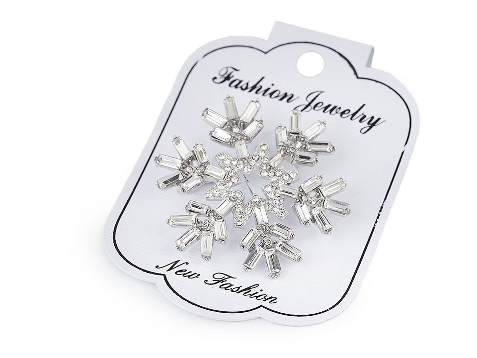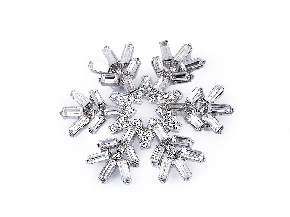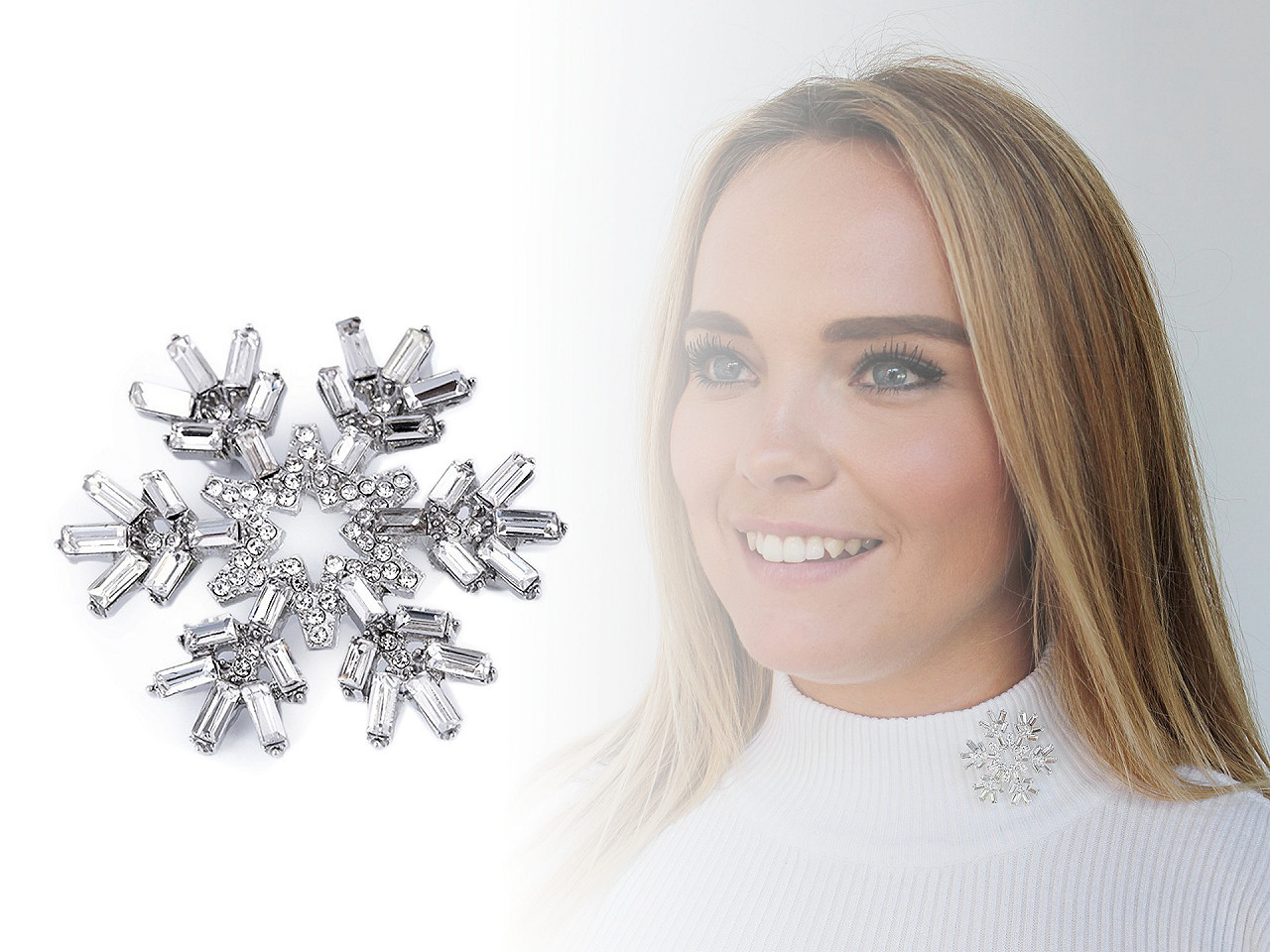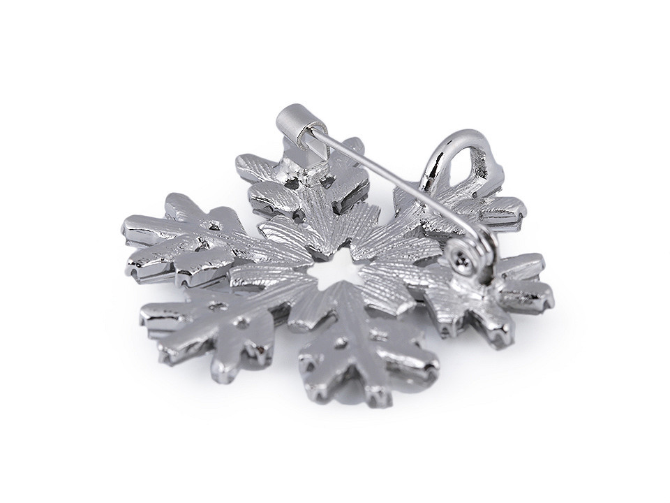 Třpytivá brož ve tvaru vločky je osázená broušenými kamínky, které se efektně třpytí. Na zadní straně má brožový špendlík a také očko k zavěšení. Skvěle ozdobí zimní čepice, svetry apod. Můžete ji nosit na oděvech, kloboucích, taškách či s ní můžete sepnout šálu. Díky očku ji můžete i zavěsit na šňůrku, stužku, řetízek apod. a udělat si z ní náhrdelník.