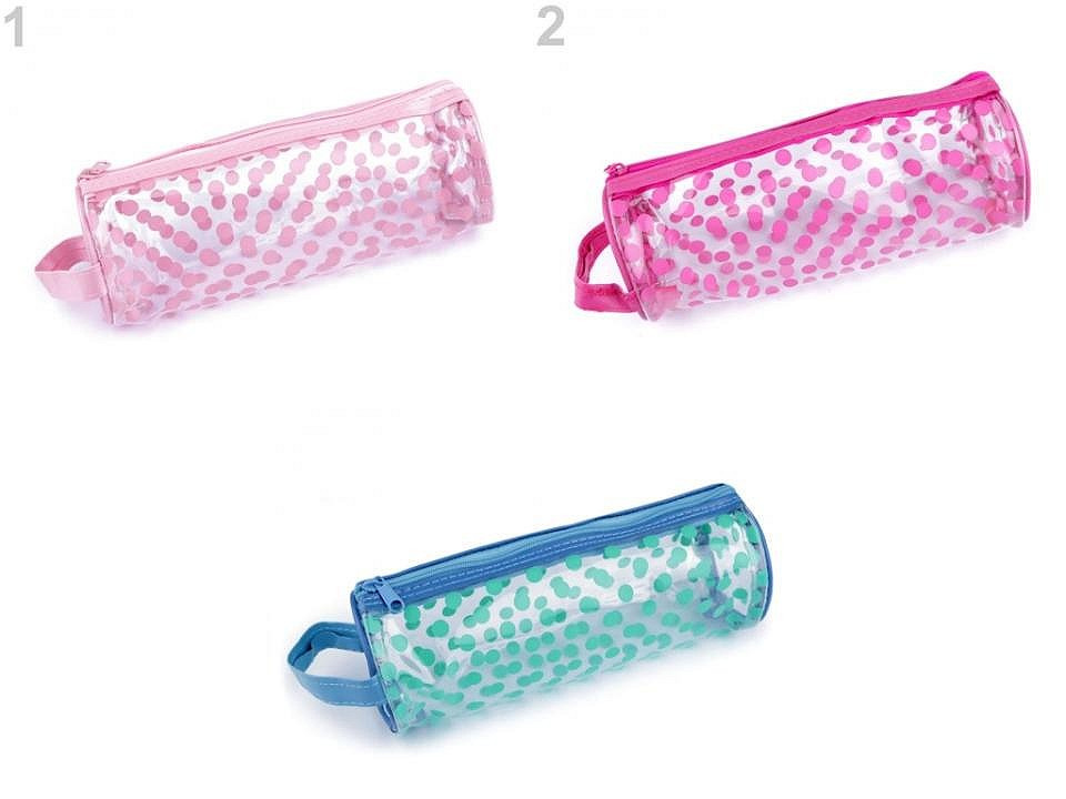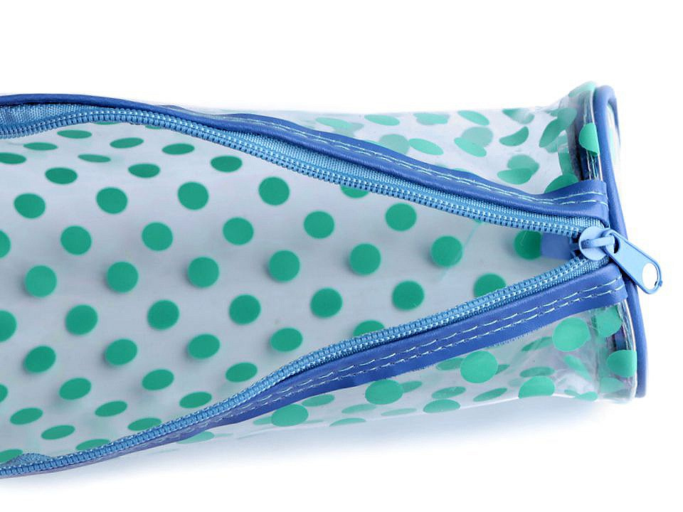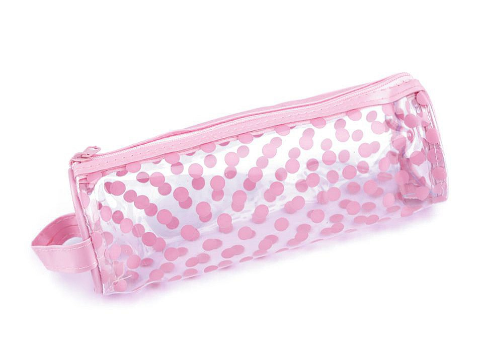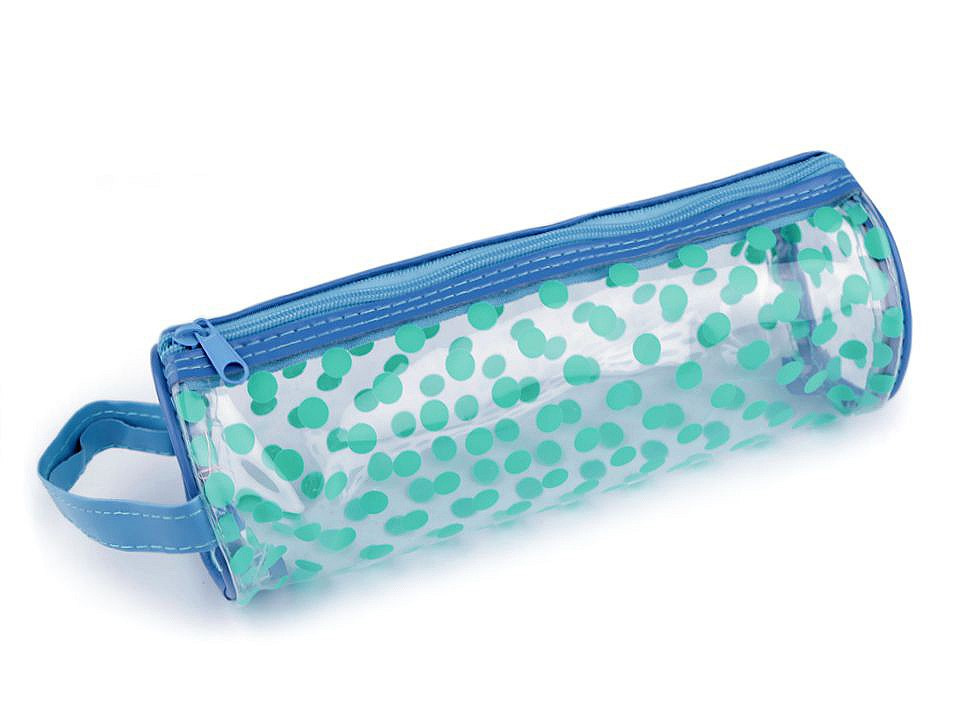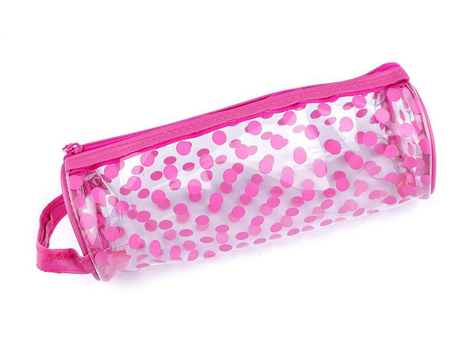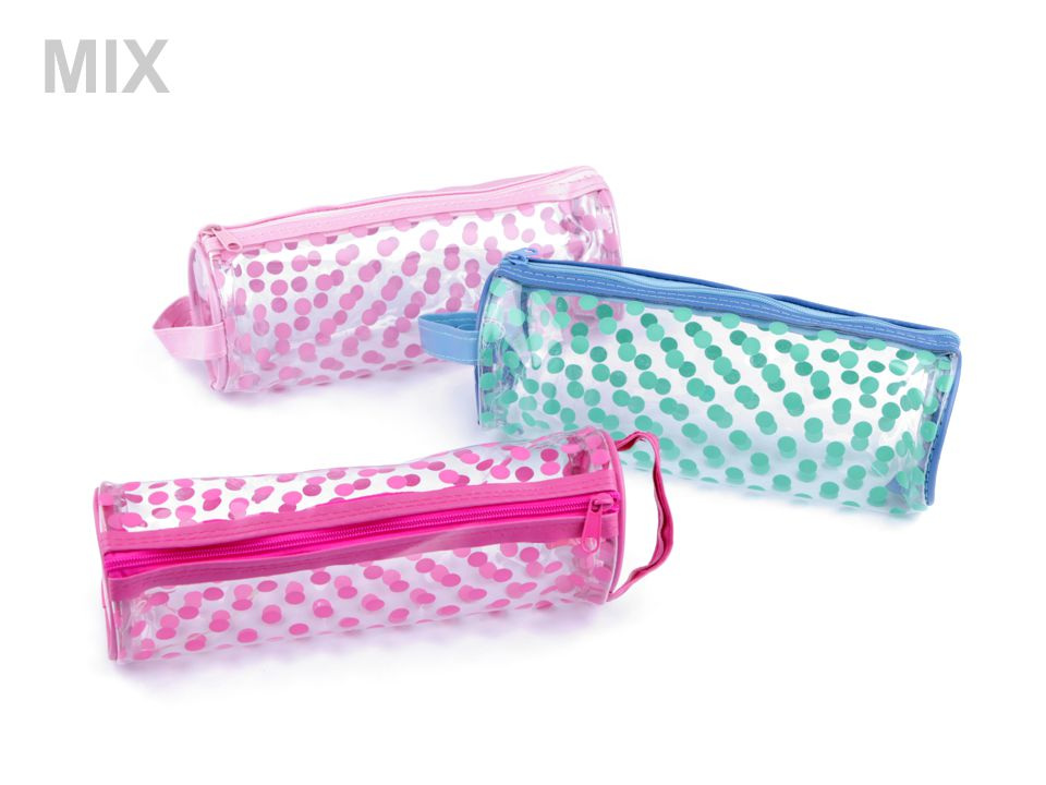 Kulaté průhledné pouzdro s puntíky využijete především na psací potřeby. Pohodlně se vejde do kabelky, může vám dělat společníka v práci či ve škole. Pouzdro můžete také použít na drobnou kosmetiku, hřebeny či manikurní nůžky. Zapíná se na zip. Na jedné straně má poutko na zavěšení.