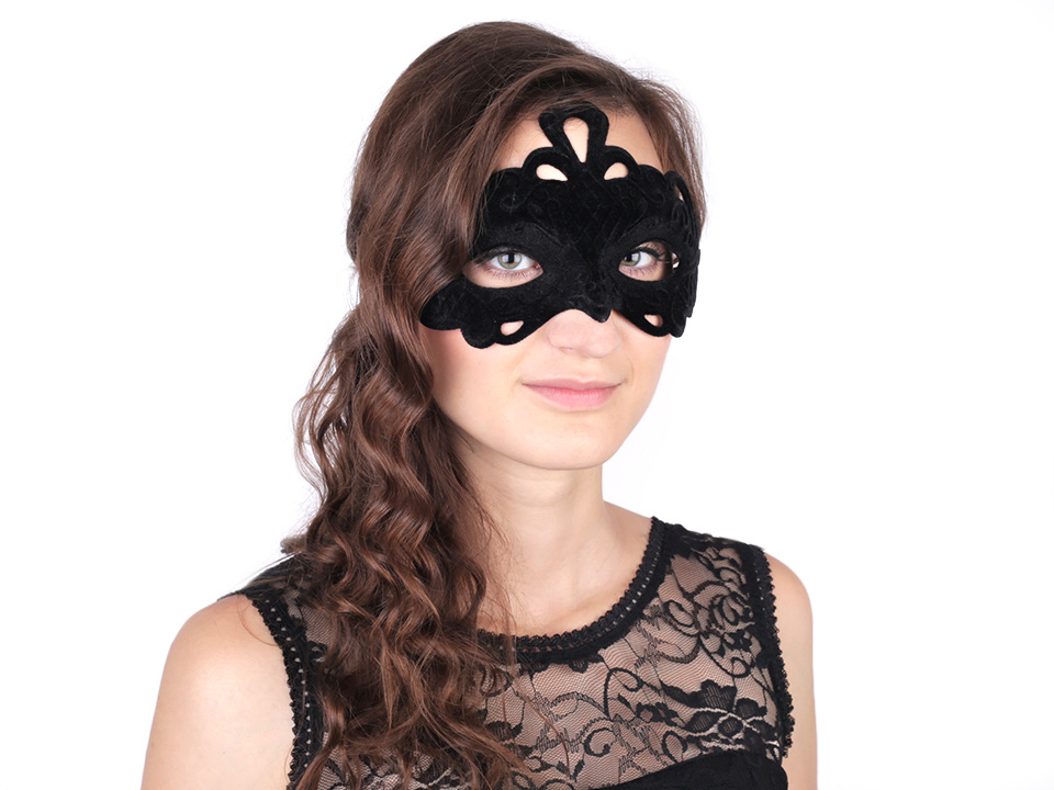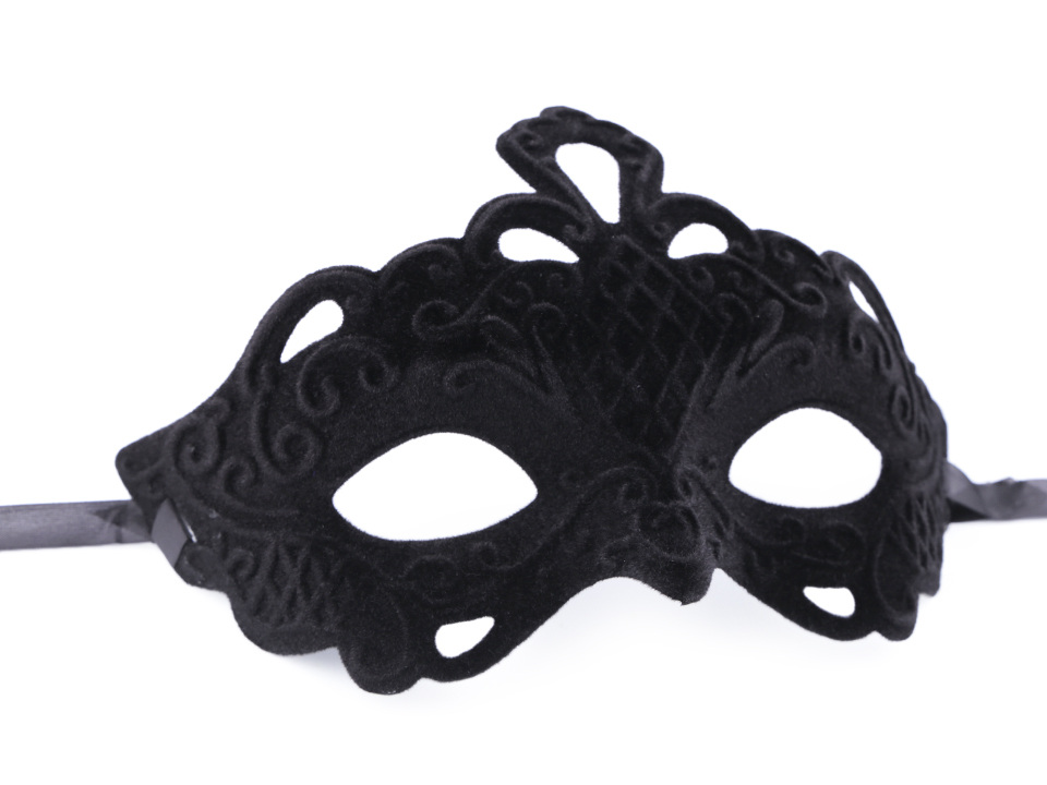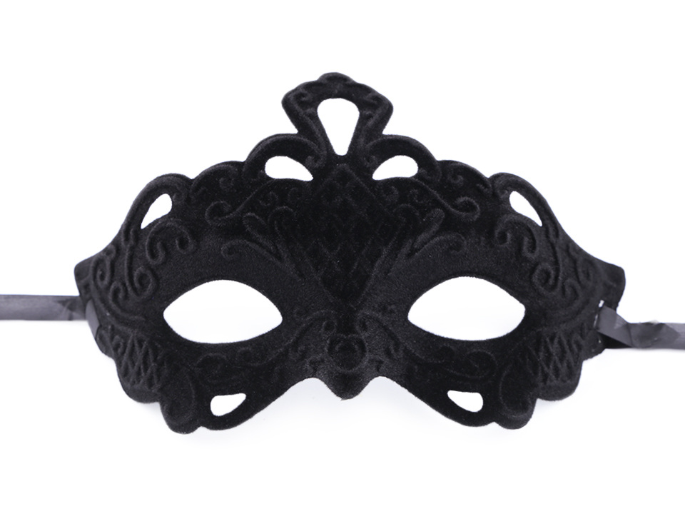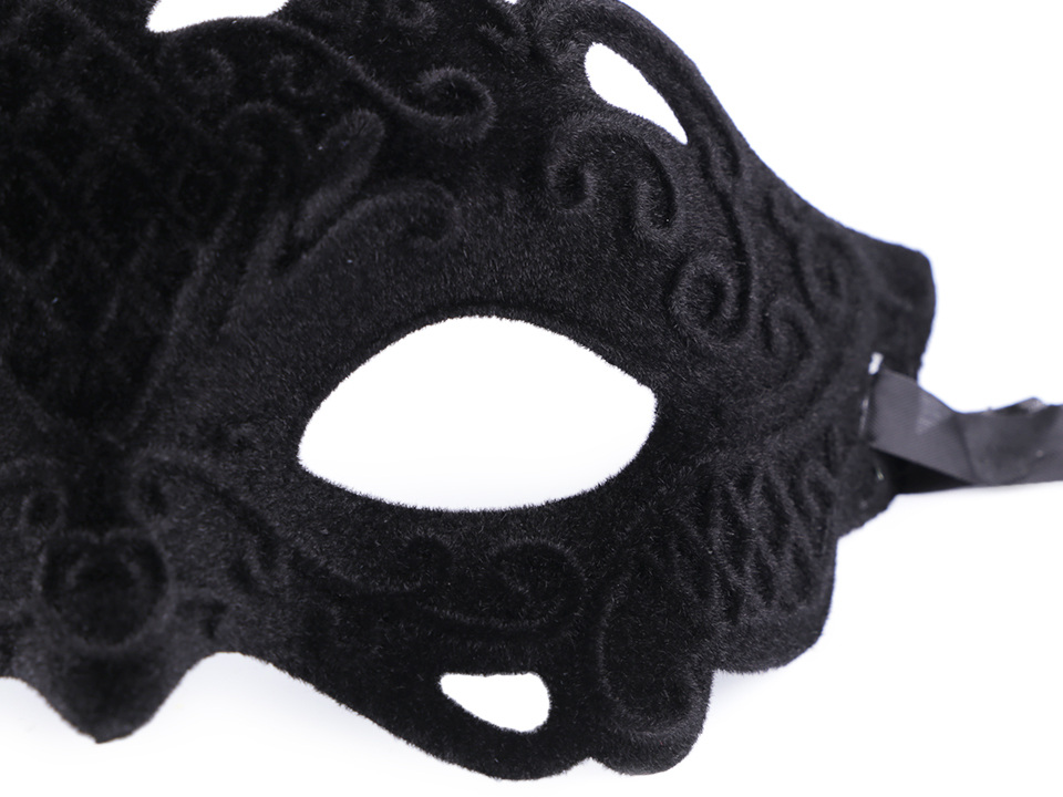 Karnevalová maska je z pevnějšího plastu. Její povrch je z vnější strany potažený semišem a jsou v něm vystouplé ornamenty. Maska se zavazuje pomocí saténové stuhy.