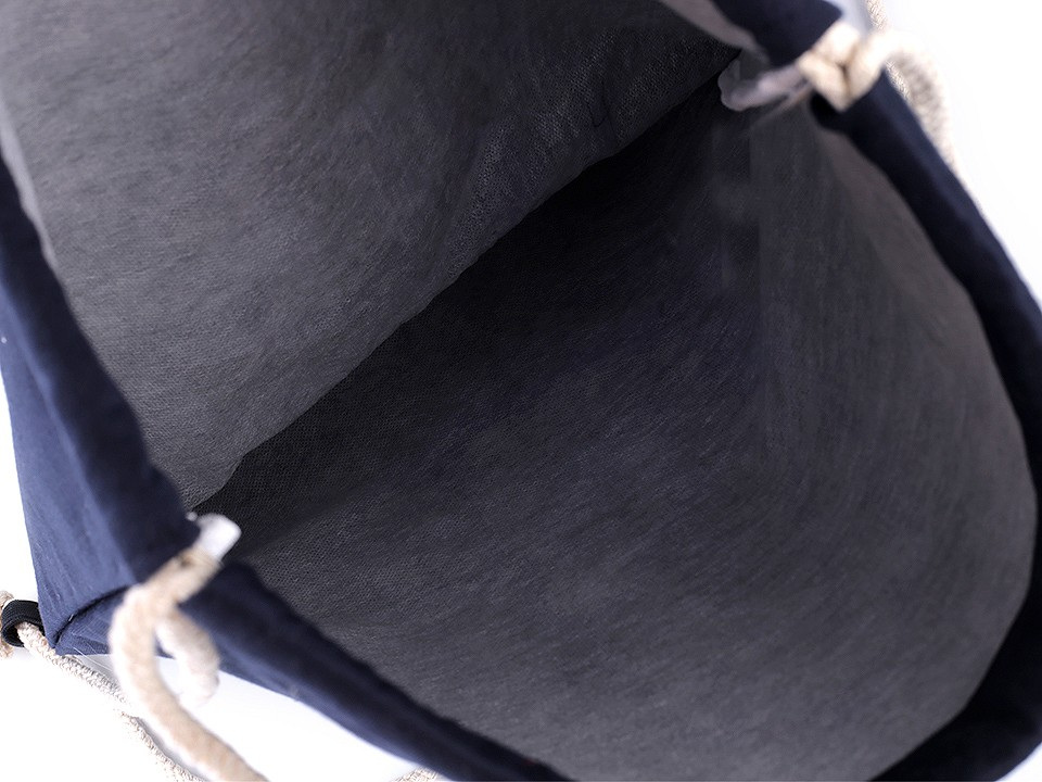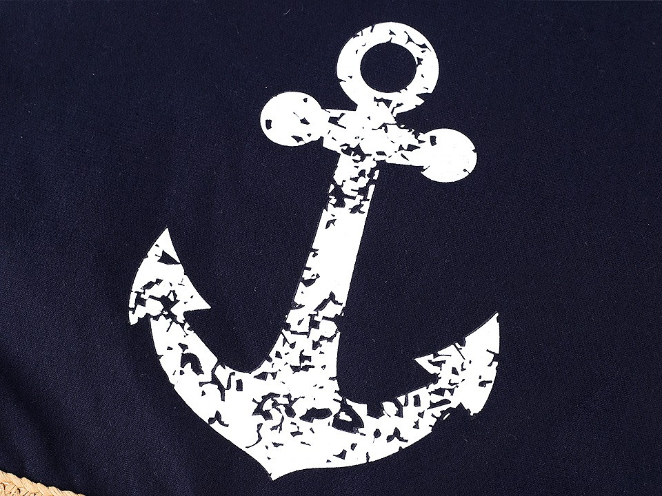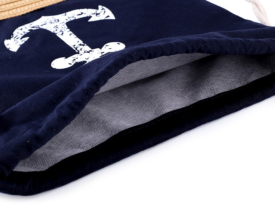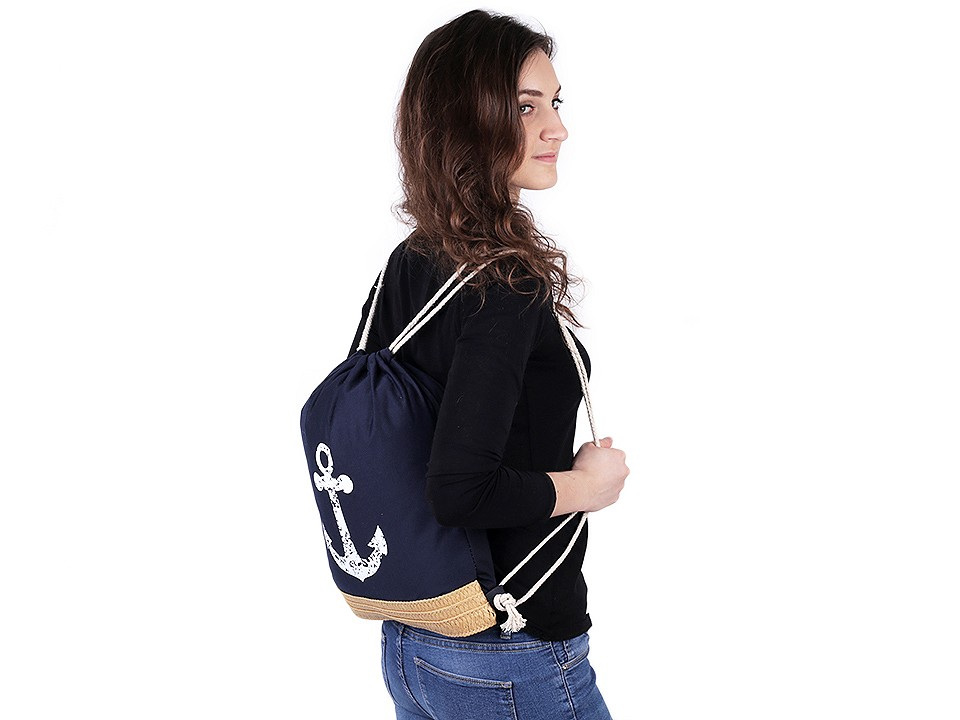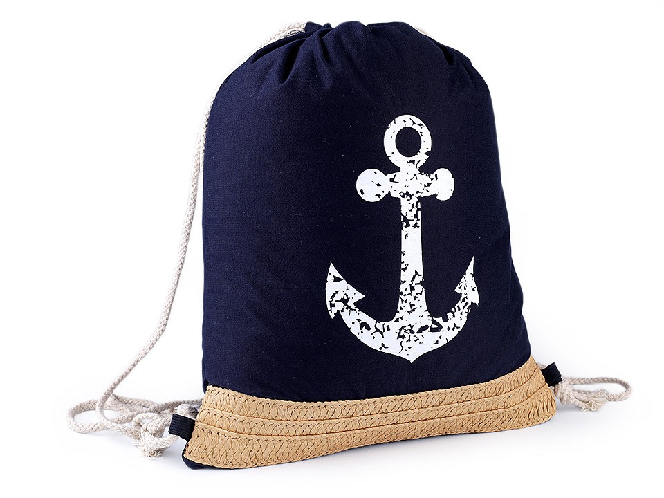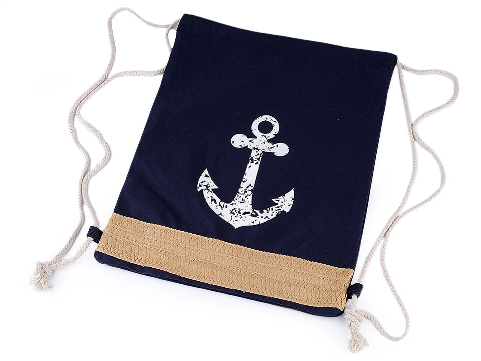 Tmavěmodrý vak ocení milovníci námořnického stylu. Zdobí ho jednostranný potisk kotvy. Vak se stahuje jednoduše pomocí šňůrek, je podšitý netkanou textilií.