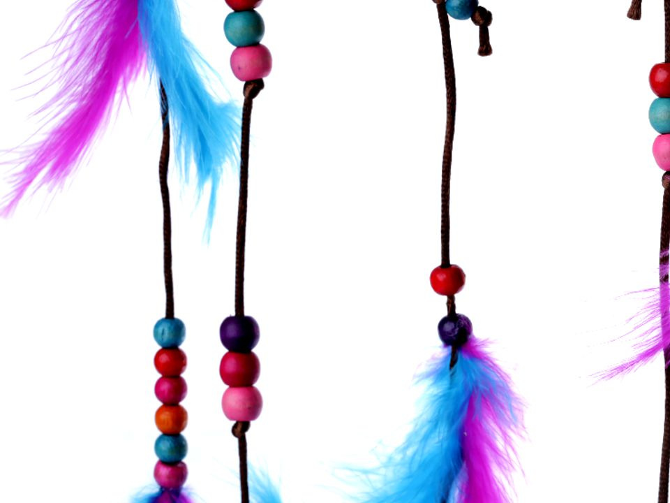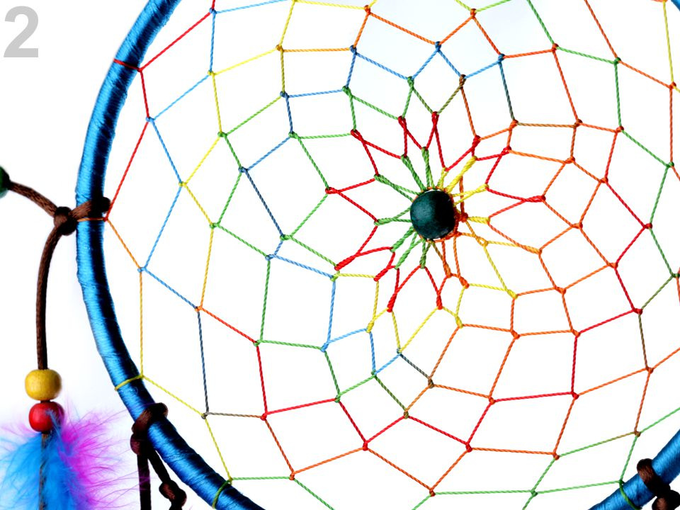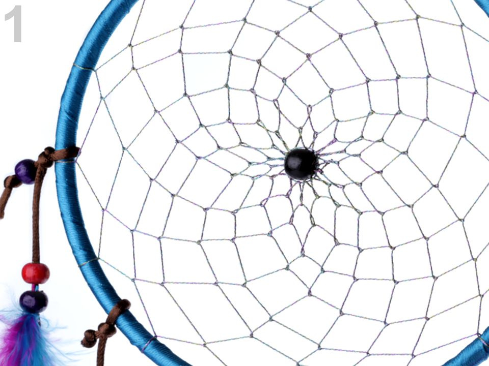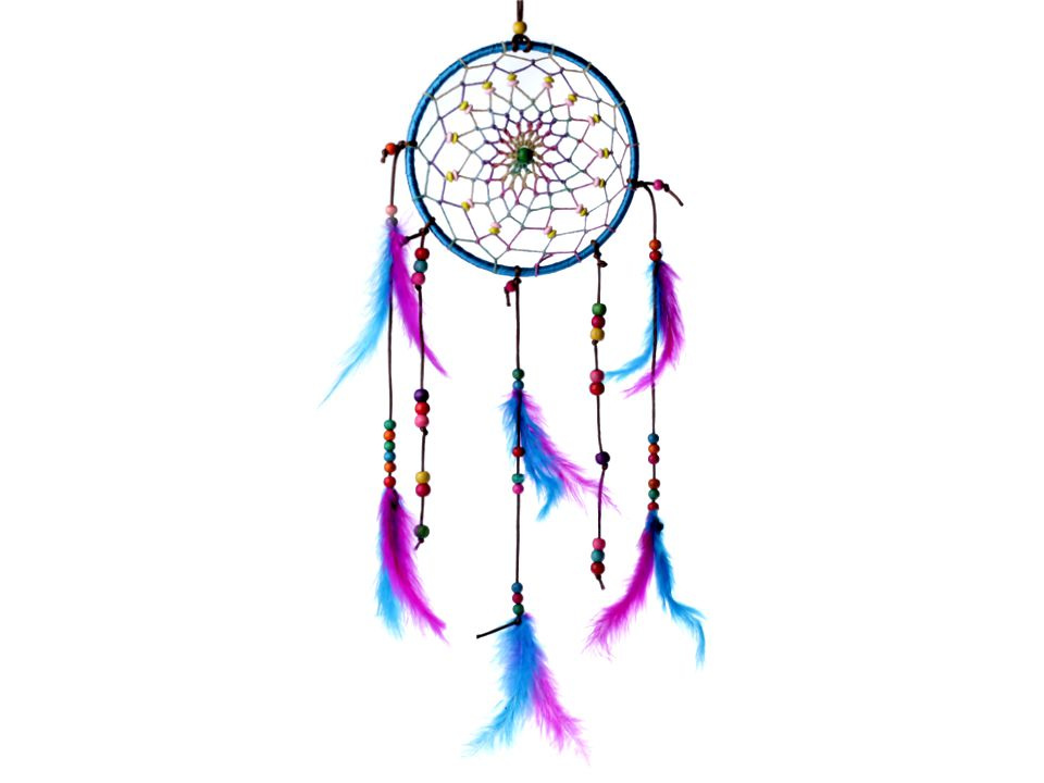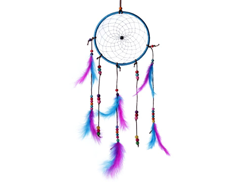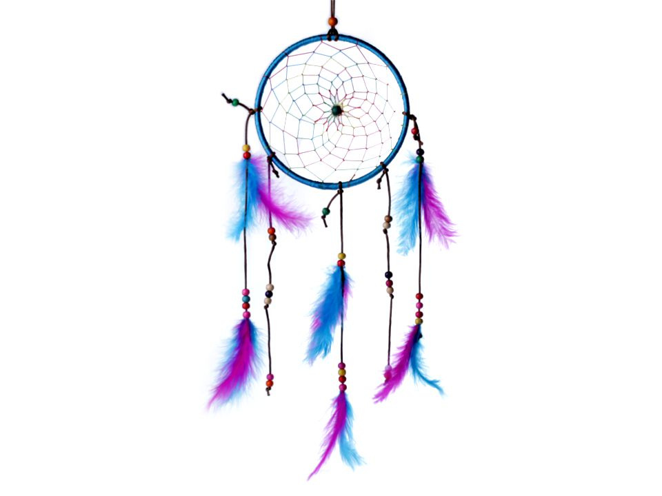 Lapač snů v pestrých barvách je variace na téma indiánského talismanu, který dovoluje snít jen dobré sny. Střed kruhu zdobí pletená síťka s dřevěnými korálky. Na provázcích visí modrá a růžová peříčka, která jsou také doplněna korálky.