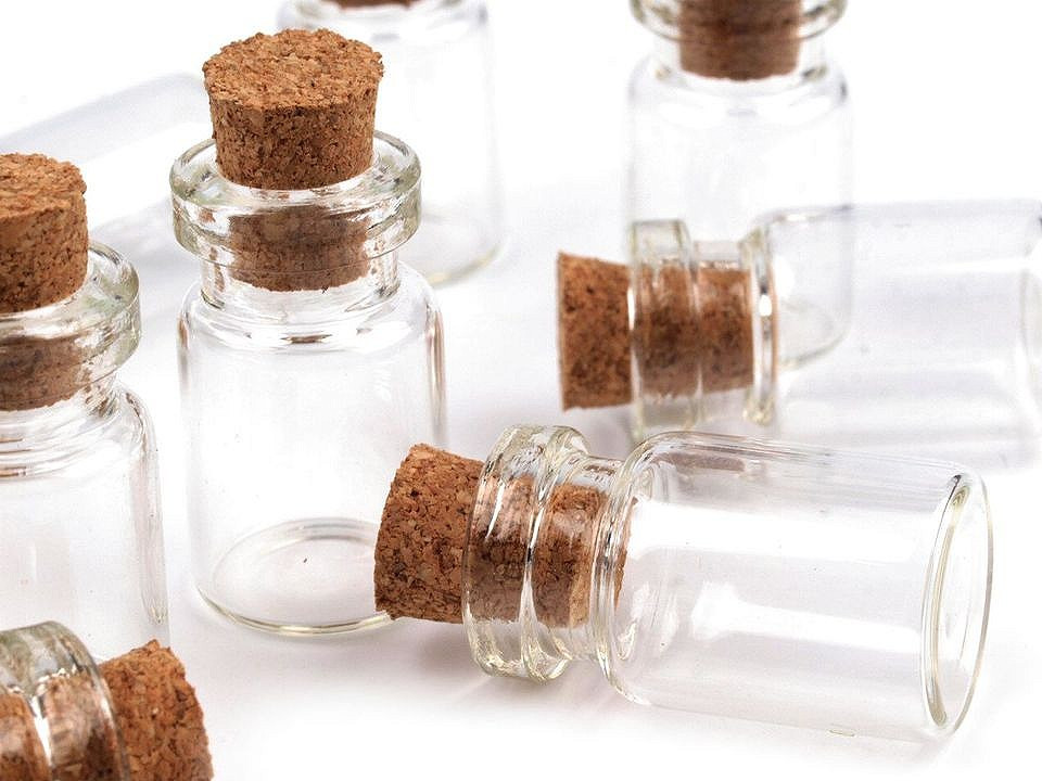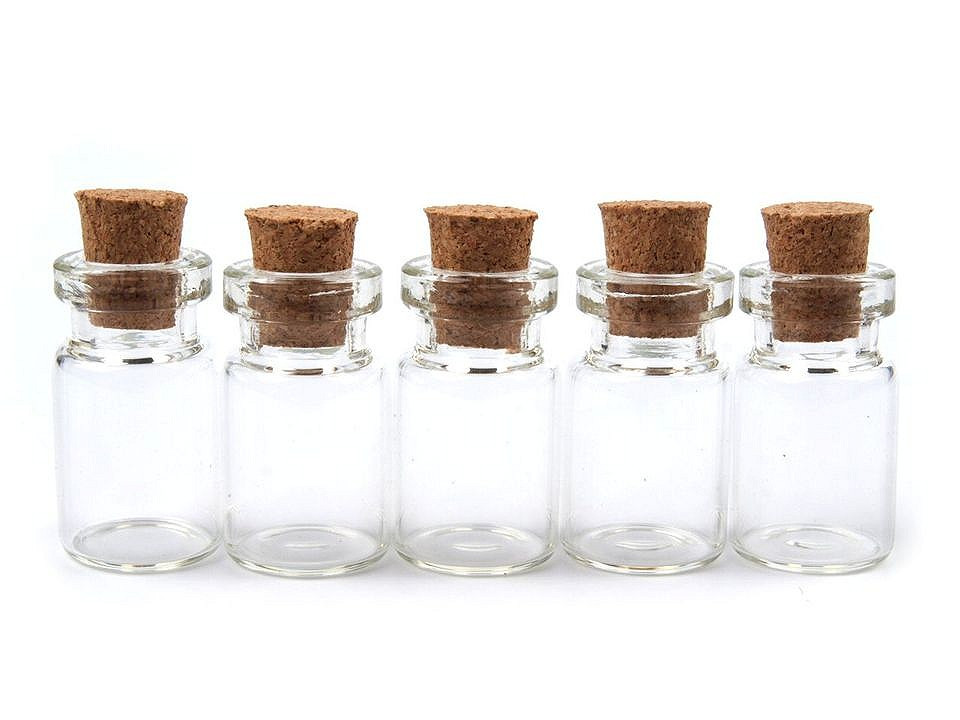 Velmi praktická a slušivá skleněná lahvička se nejčastěji používá jako přívěsek na krk. Zátka je vyrobena z korku. Lahvičku můžete dekorovat např. jemným barevným pískem, různými úlomky minerálů, kamínky, rostlinkami atd. nebo do ní lze vložit třeba i malý dopis. Jako šňůrku můžete použít kůži, která na přívěsku pěkně vynikne, řetízek či lanko. Rozměry lahvičky jsou 13 x 25 mm (průměr dna x výška). Průměr hrdla je 8 mm. Rozměry korku jsou 7mm (širší průměr 9mm) x 10 mm (průměr x výška). Obsah lahvičky po hrdlo je 0,8 ml.Složení: sklo korek