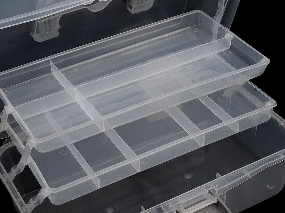 Velmi praktický pomocník při vašem skladování potřebných korálků a dalších komponentů pro kreativní tvorbu. Zásobník je vyroben z plastu, má jednoduché pákové uzavírání a rukojeť. Pořadač je možné rozložit tak, abyste měli dvě přihrádky celé otevřené. Pod přihrádkami je ještě dostatečný prostor na pomůcky. Příklopné víko chrání vše před prachem. Vnější rozměry: 150 mm výška, 200 mm šířka, 330 délka 330 mm, přihrádky jsou velké 145 x 280 mm. Vnitřní rozměry: první přihrádka je rozdělena na 4 díly (2 okna velká 205 x 70 mm, 2 okna velká 70 x 70 mm), druhá přihrádka je rozdělena na 5 dílů (1 okno velké 80 x 145 mm, 2 okna velké 45 x 145 mm, 2 okna velká 50 x 145 mm).Složení: plast