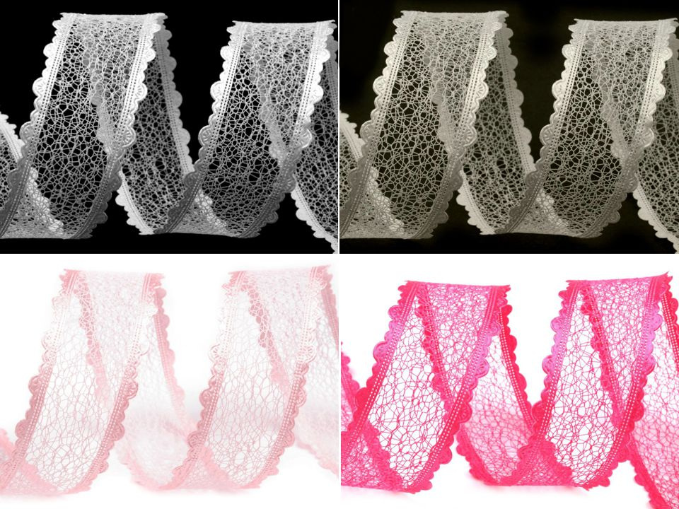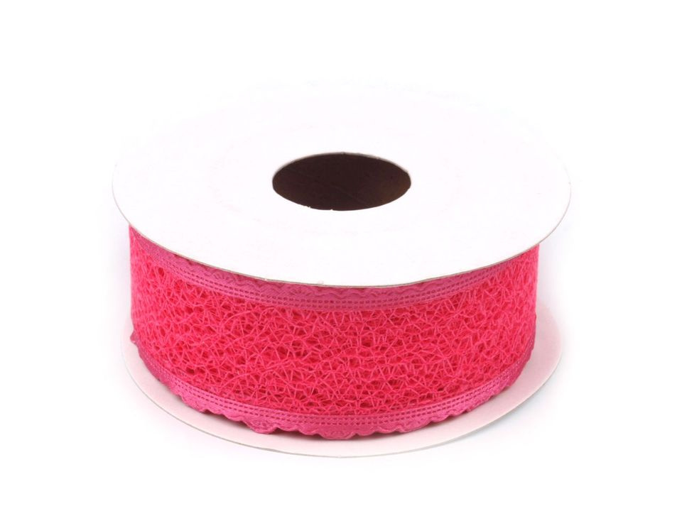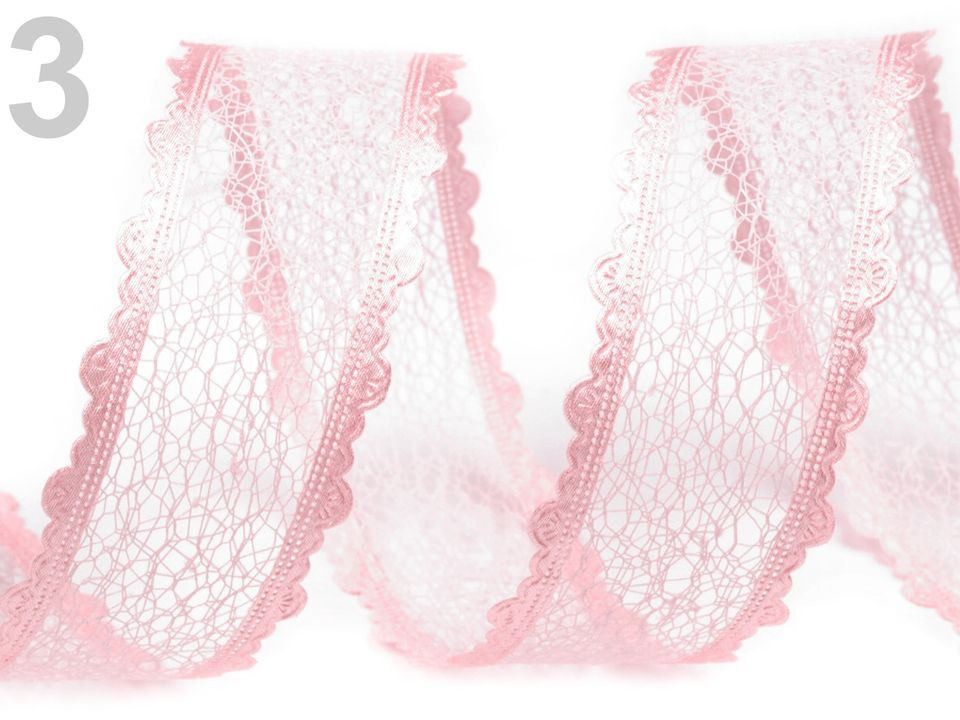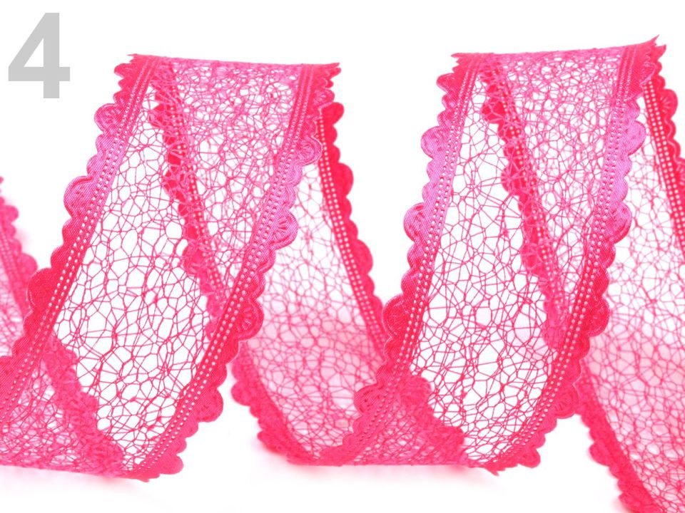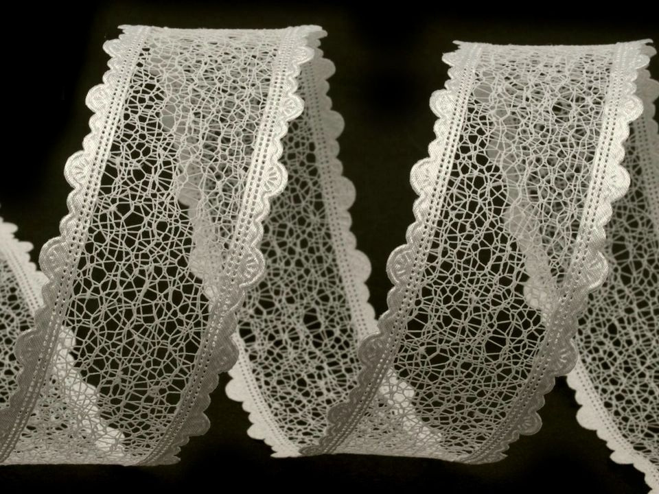 Dominantu stuhy určitě zajišťuje pavučinková krajka, která se táhne středem stuhy. Dále vás zaujmou saténové okraje, které jsou tvořeny jemnými obloučky a dodávají tak stuze originální nádech.