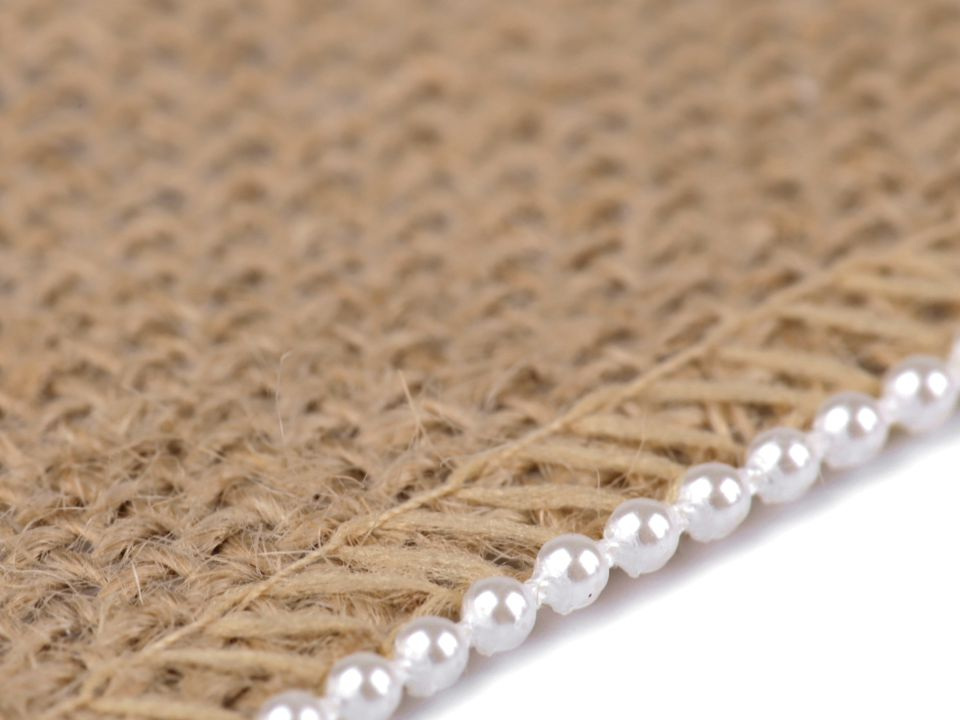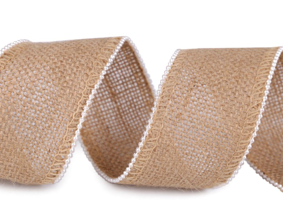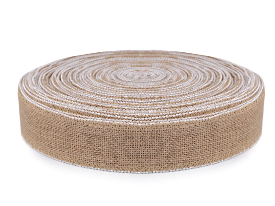 Jutová stuha má díky lesklým perličkám po stranách romantický vzhled.