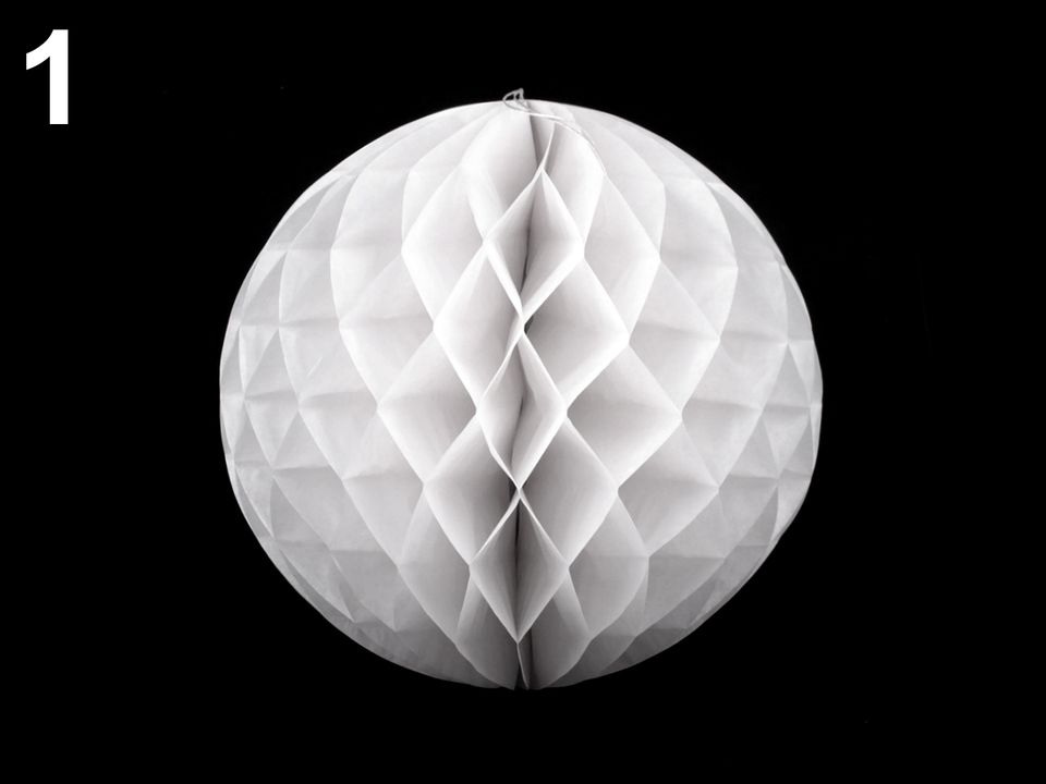 Originální závěsná dekorace ve tvaru koule je vyrobena z takzvaného včelího plástvového papíru. Jedná se o mnohavrstevný hedvábný papír, který při roztažení vytváří efekt připomínající včelí plástve. Tento druh papíru umožňuje široké využití 3D efektu.