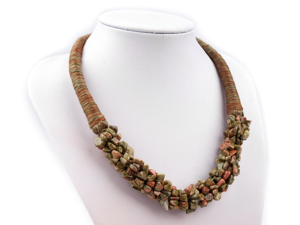 Originální náhrdelník, který voní africkými dálkami. Výjimečný střed, je vytvořený z dlouhého minerálového návleku omotaného kolem jádra, které je z pevné kroucené polyesterové šňůry. Etno náhrdelník je bohatý, neobvyklý a nepřehlédnutelný.
