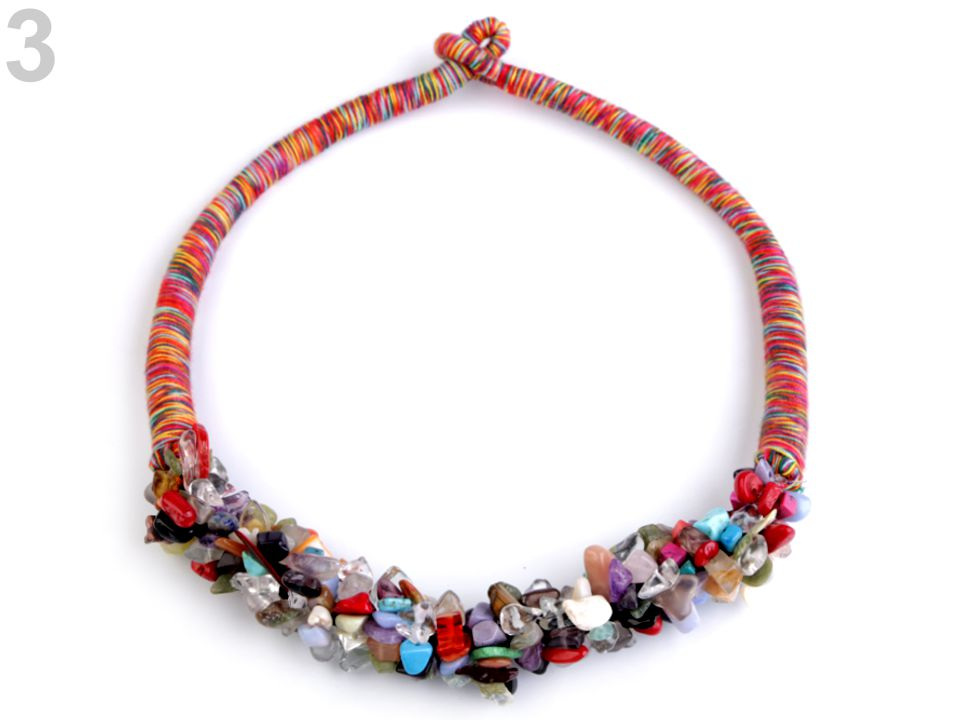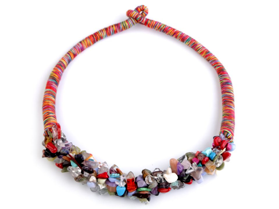 Zbytek náhrdelníku tvoří omotané, několikabarevné šňůry, které ladí s typem použitých minerálů. Ke konci se zužují až do zapínání na plastový knoflík a poutko. Zapínání je velice spolehlivé, nehrozí, že by se náhrdelník samovolně rozepnul.