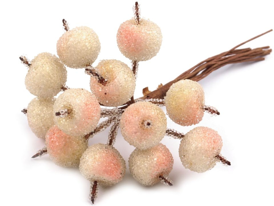 Plastová dekorace ve tvaru jablka je zpestřena drobnými transparentními kuličkami z plastu, které vytvářejí dojem námrazy. Jablka jsou připevněna na drátek z magnetického kovu.